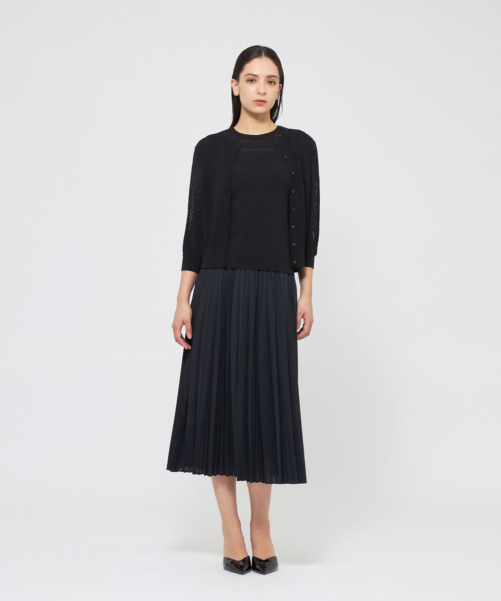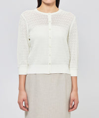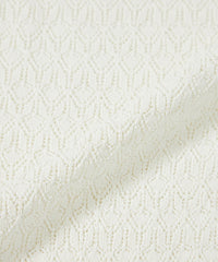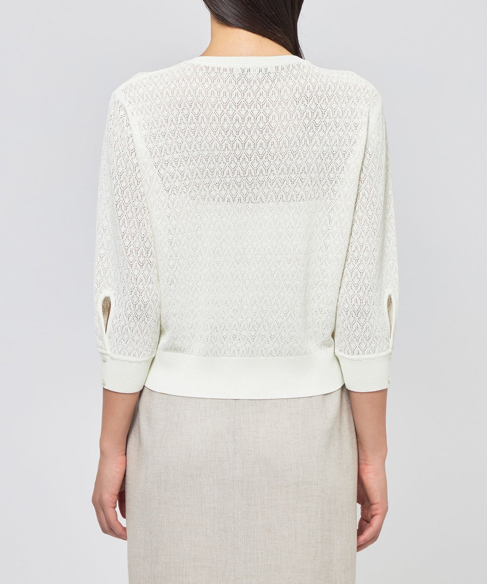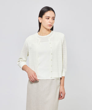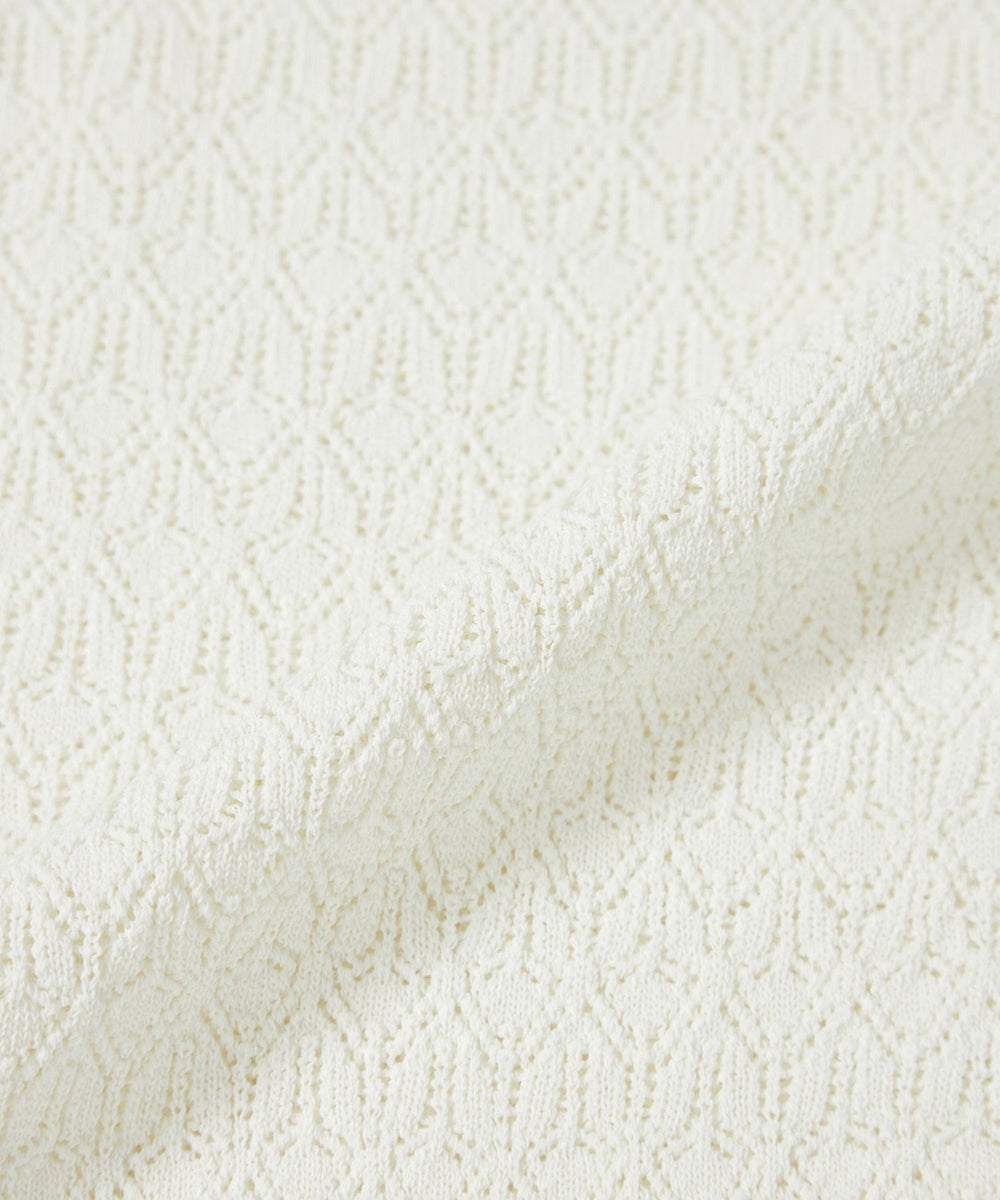 総レース柄のクロップド丈カーディガンです。編地の繊細な表情と、清涼感がポイントです。袖口のスリットもさりげないデザインポイントに。同素材のニットプルオーバー(品番:M5N40566)とアンサンブルでの着用もおすすめです。