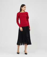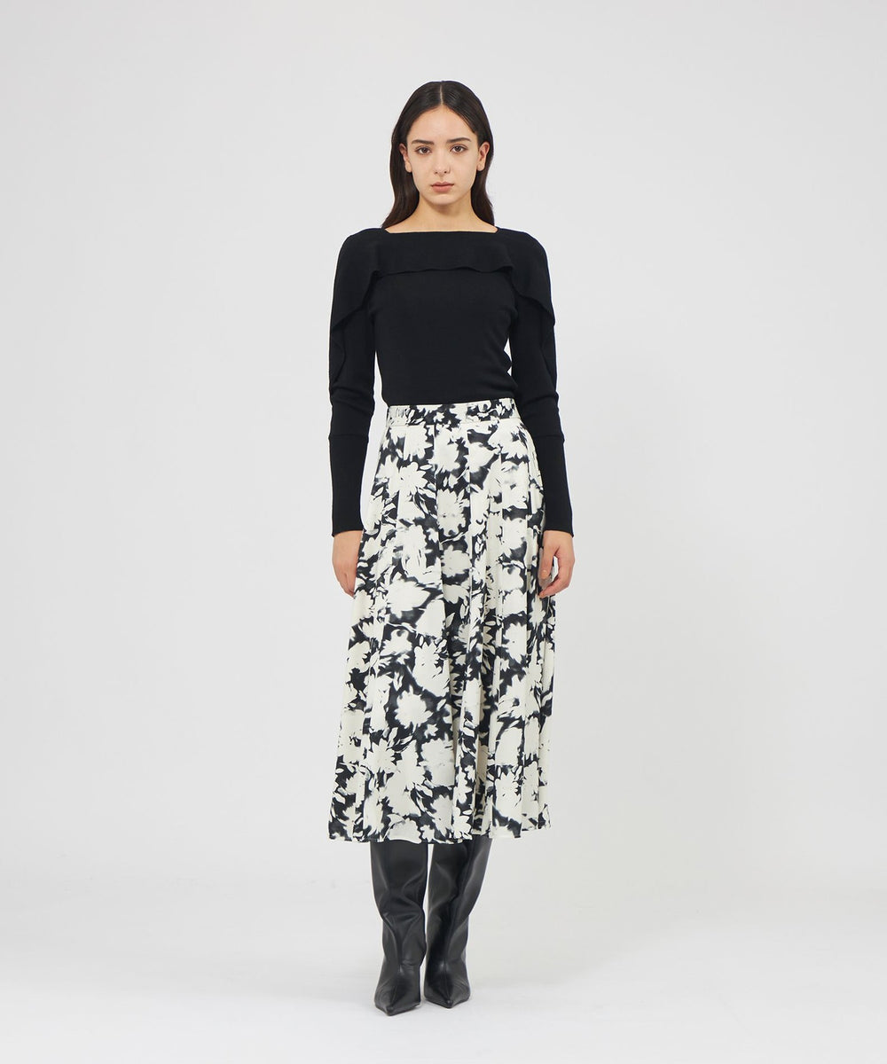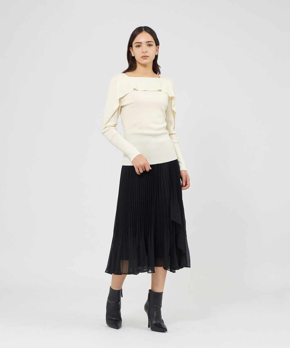 肩から袖にかけてあしらわれたラッフルが華やかさを添えるニットプルオーバー。リブ編みのニットテープで作られたラッフルラインが立体的なシルエットを美しく表現します。繊細な引き返し編みを取り入れ、自然な波打ちと上品な動きを演出しました。目の詰まった美しい表面感が特徴の16ゲージ総針編みでエレガントな表情に仕上げています。