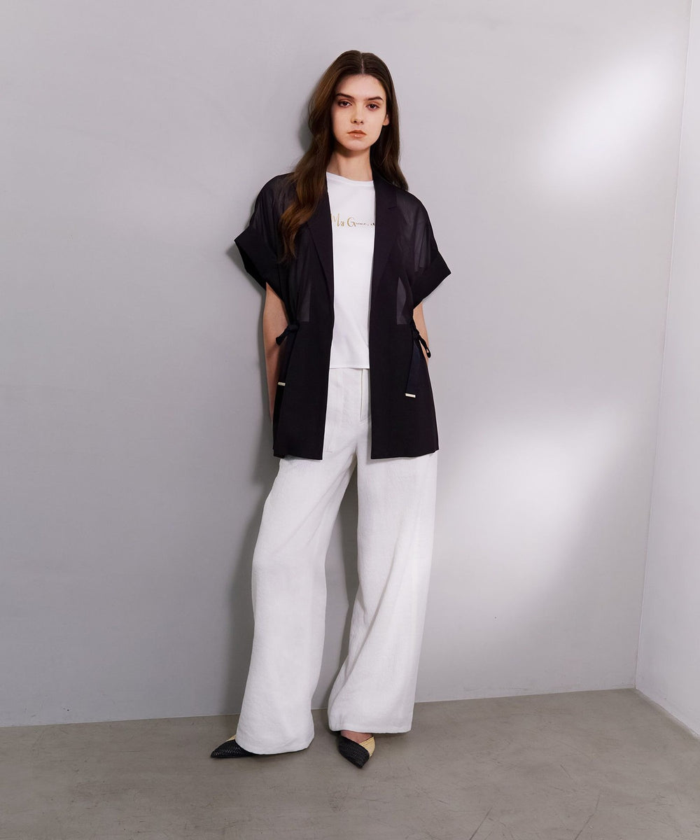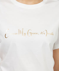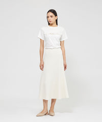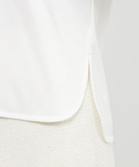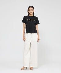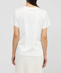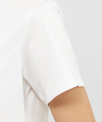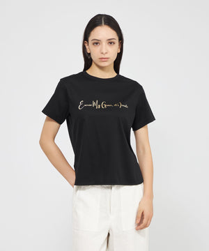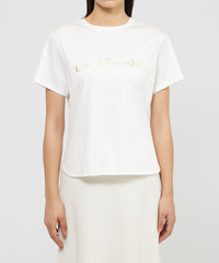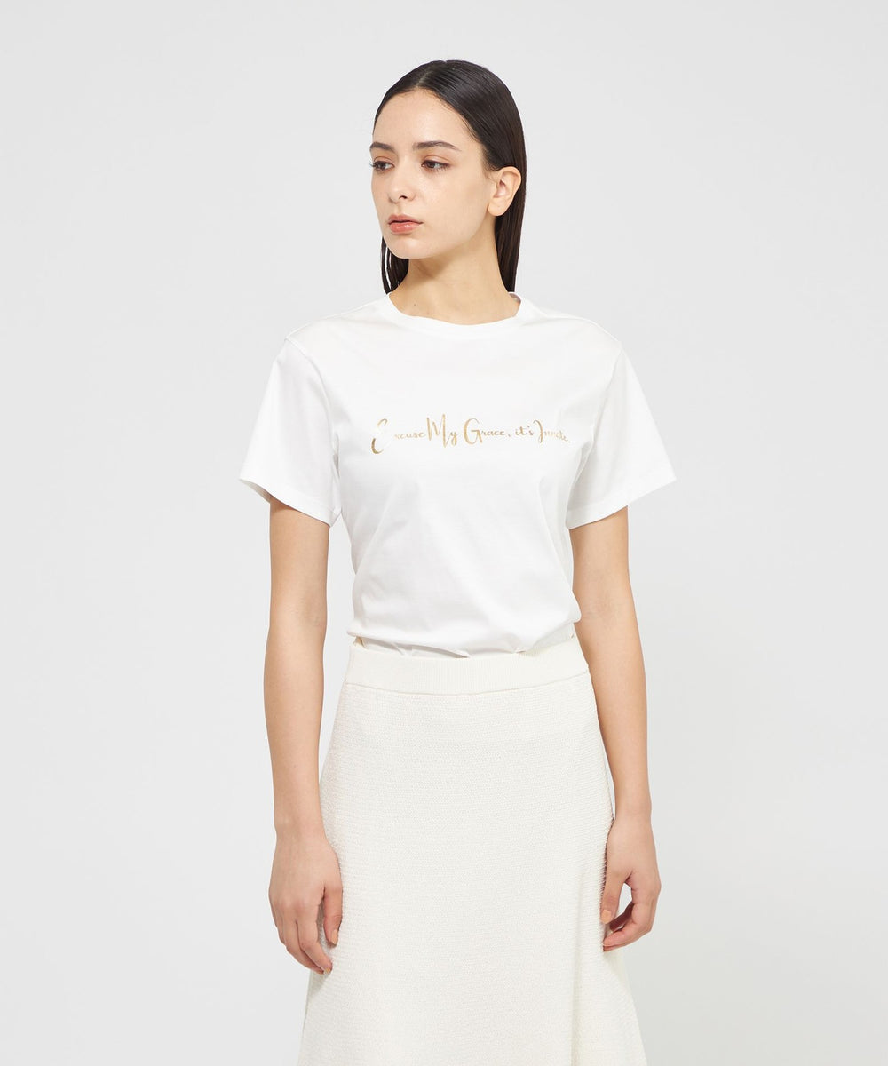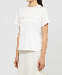 インナー使いに活躍するシンプルロゴTシャツです。ゴールドの箔プリントがアクセントになっています。シルエットはラインを拾わない程よいゆるさで、シャツテールのような前後差のあるラウンドカットがポイントです。