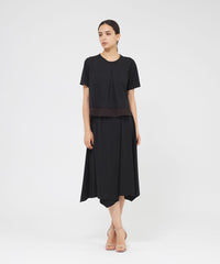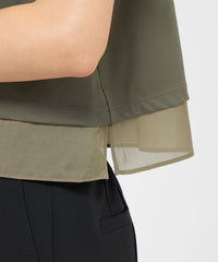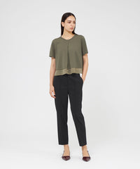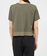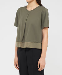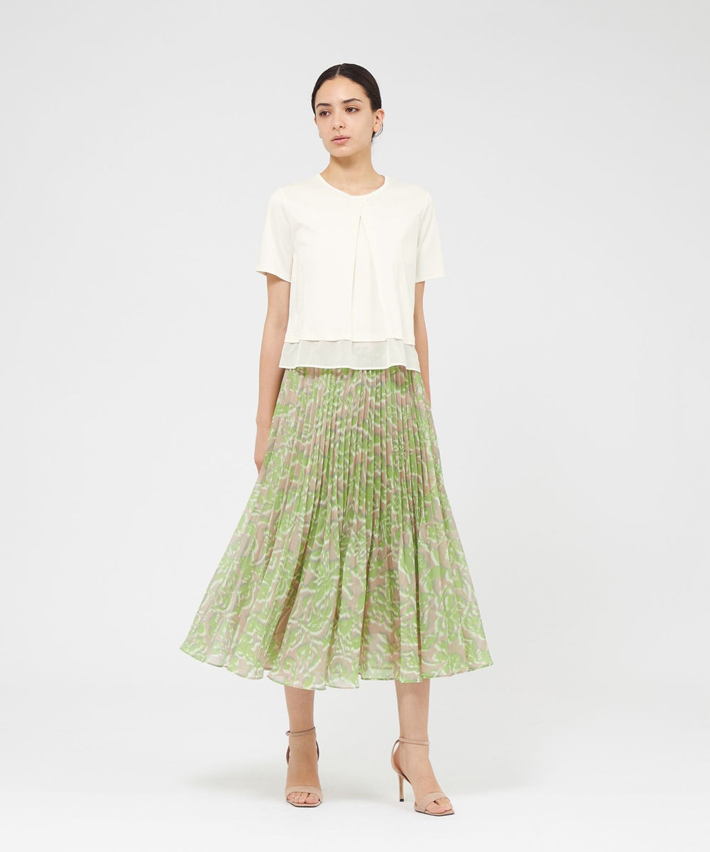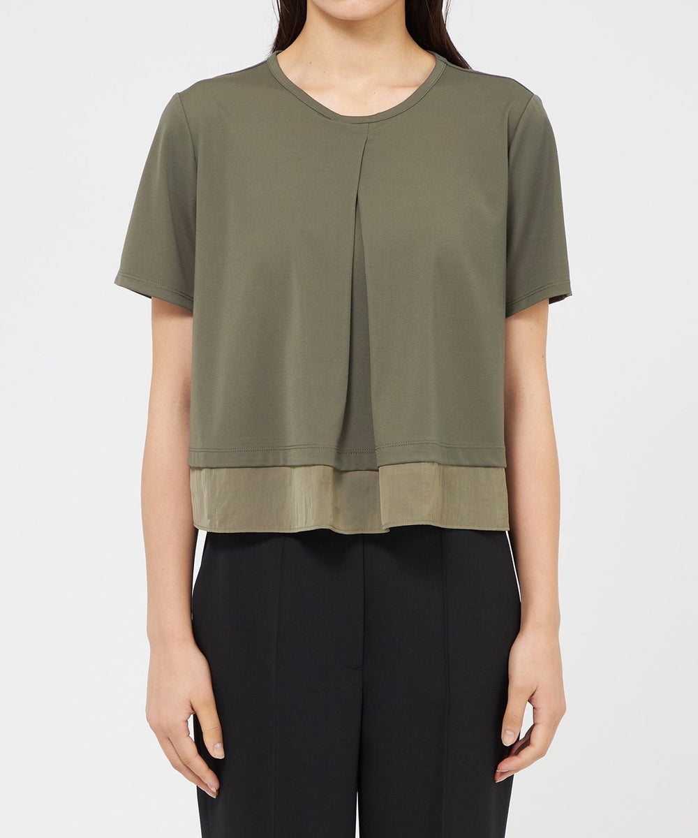 前中心のボックスタックによるテントシルエットのプルオーバーです。裾にシアー生地をのぞかせて軽やかに仕上げています。立体感のあるシルエット、異素材のドッキングが1枚で着映えるカットソーです。同素材のスカート(品番:M5S40576)を合わせたセットアップスタイリングもおすすめです。