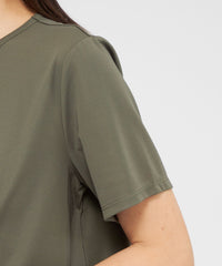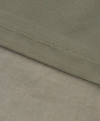 ※色によって素材が異なります。#オフホワイト(02)・・・表面感の綺麗なコットンジャージ素材です。#黒(09)、カーキ(75)・・・レーヨンの柔らかさにプルンとしたハリ感が加わったしなやかなタッチが特徴の素材です。ハイゲージの編機を使用したコンパクトな目面と落ち感、適度な肉感のある素材です。裾の別布は熱に弱い素材ため、アイロンの温度にご注意ください。高温を当てると熱で溶ける恐れがあります。