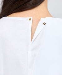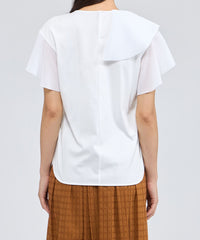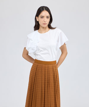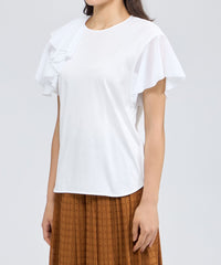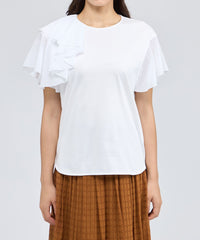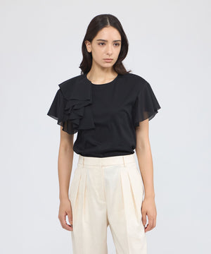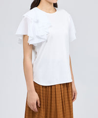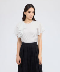 右肩にふんだんにあしらったラッフルが華やかなデザインカットソーです。ラッフル部分にはシアー感とハリのある素材を使用し、立体的でクチュールライクな仕上がりに。甘すぎないデザインが大人の女性におすすめです。カットソーながらもブラウスのような上品さがあり、きれいめなスタイリングにも活躍する1着です。