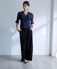 ウエストゴム仕様のイージーギャザーワイドパンツです。ウエストにはコードを入れているため調整可能です。裏地がなくさらっとした素材で暑い時期にも快適な1着です。同素材のプルオーバー(品番:M5M28568)やジレ(品番:M5M29568)とセットアップで着用いただくのもおすすめです。