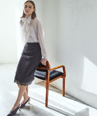 シンプルにスッキリと仕上げたレースタイトスカートです。フィットしすぎない美しいシルエット、バックスリットにより動きやすさにこだわりました。裾はレースのスカラップを活かし、エレガントな表情に仕上げました。同展開のノーカラージャケット(品番:M5E11507)とのコーディネートもおすすめです。