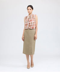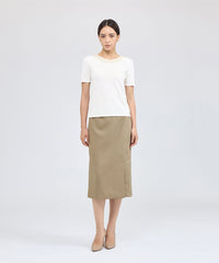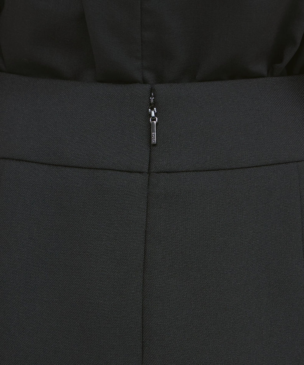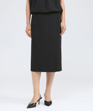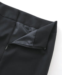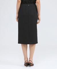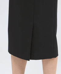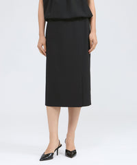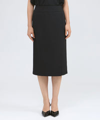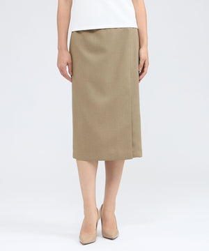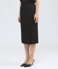 ラップ風デザインのタイトスカートです。シンプルなデザインながらも、さりげないスリットがアクセントに。同素材のジャケット(品番:M5E21609)とのセットアップでビジネスシーンにおすすめの1着です。