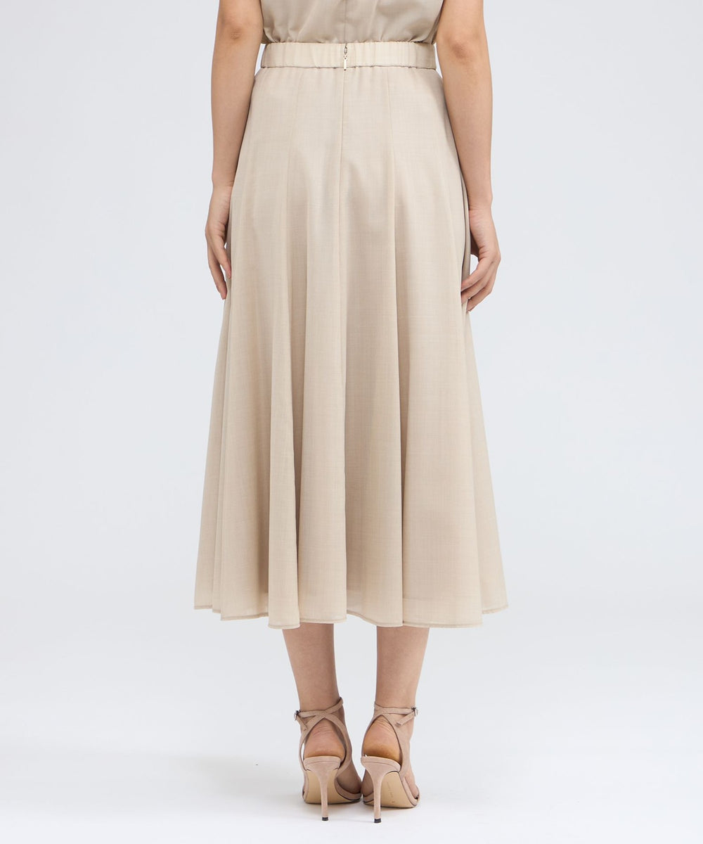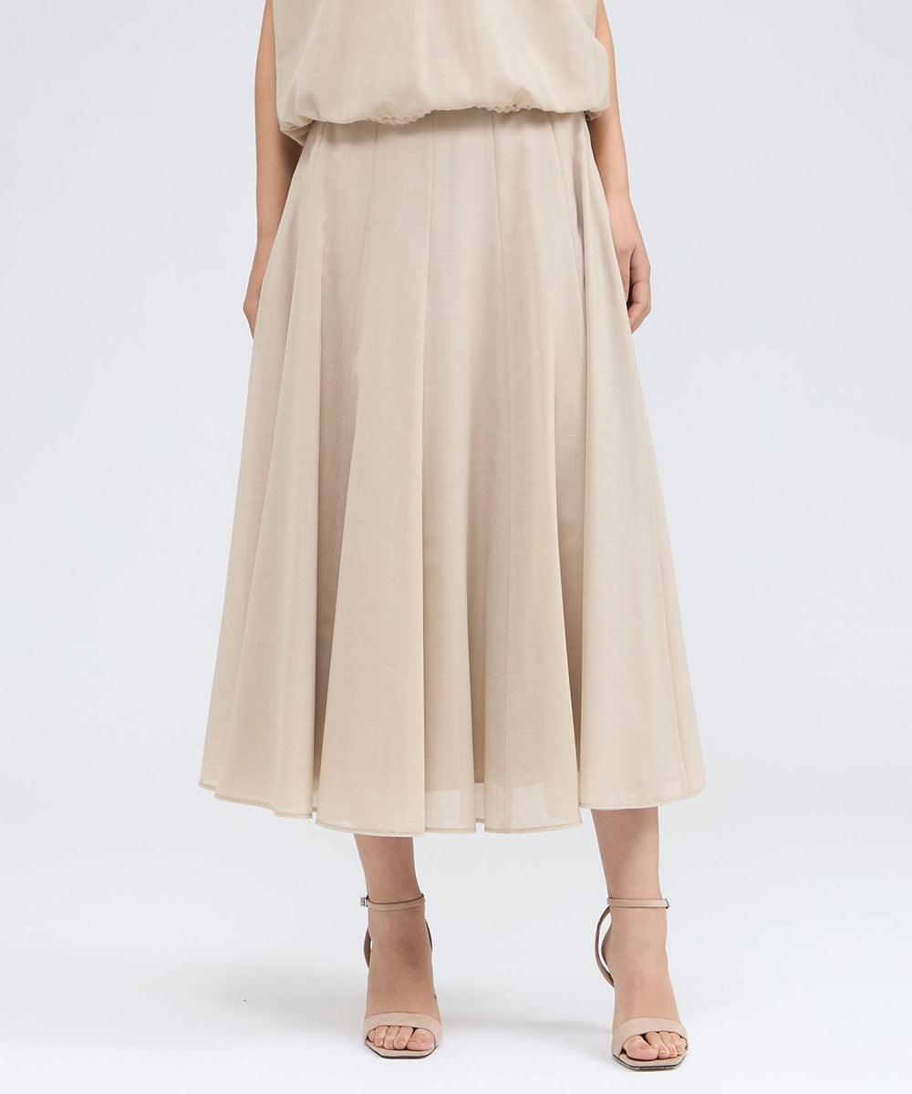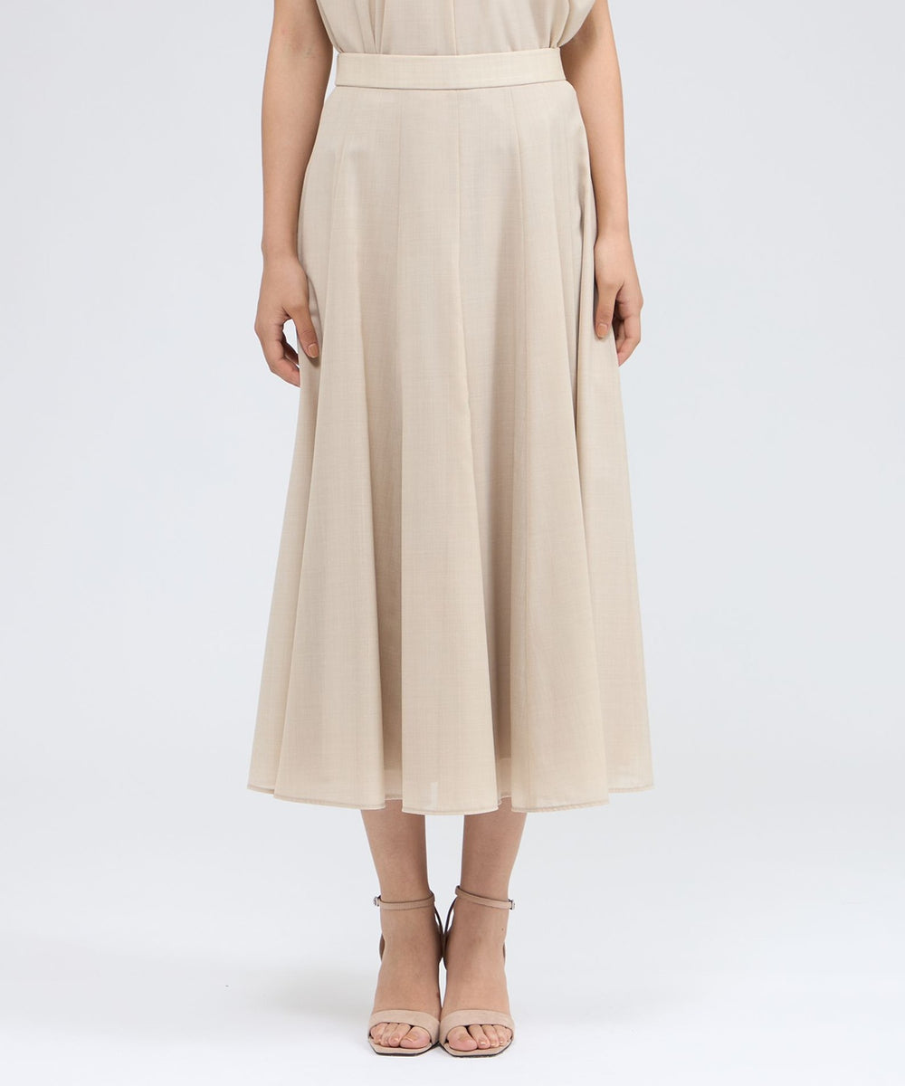 12枚接ぎで仕立てたフレアスカートです。ヒップ周りはスッキリと仕上げ、裾に向かって華やかに広がるボリューム感がエレガントなスウィングシルエットです。ウエストは後ろゴム仕様で快適な着心地です。同素材のトップス(品番:M5M23612)とセットアップで着用いただくのもおすすめです。