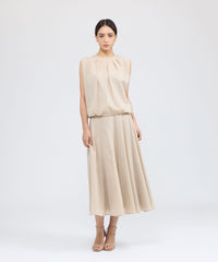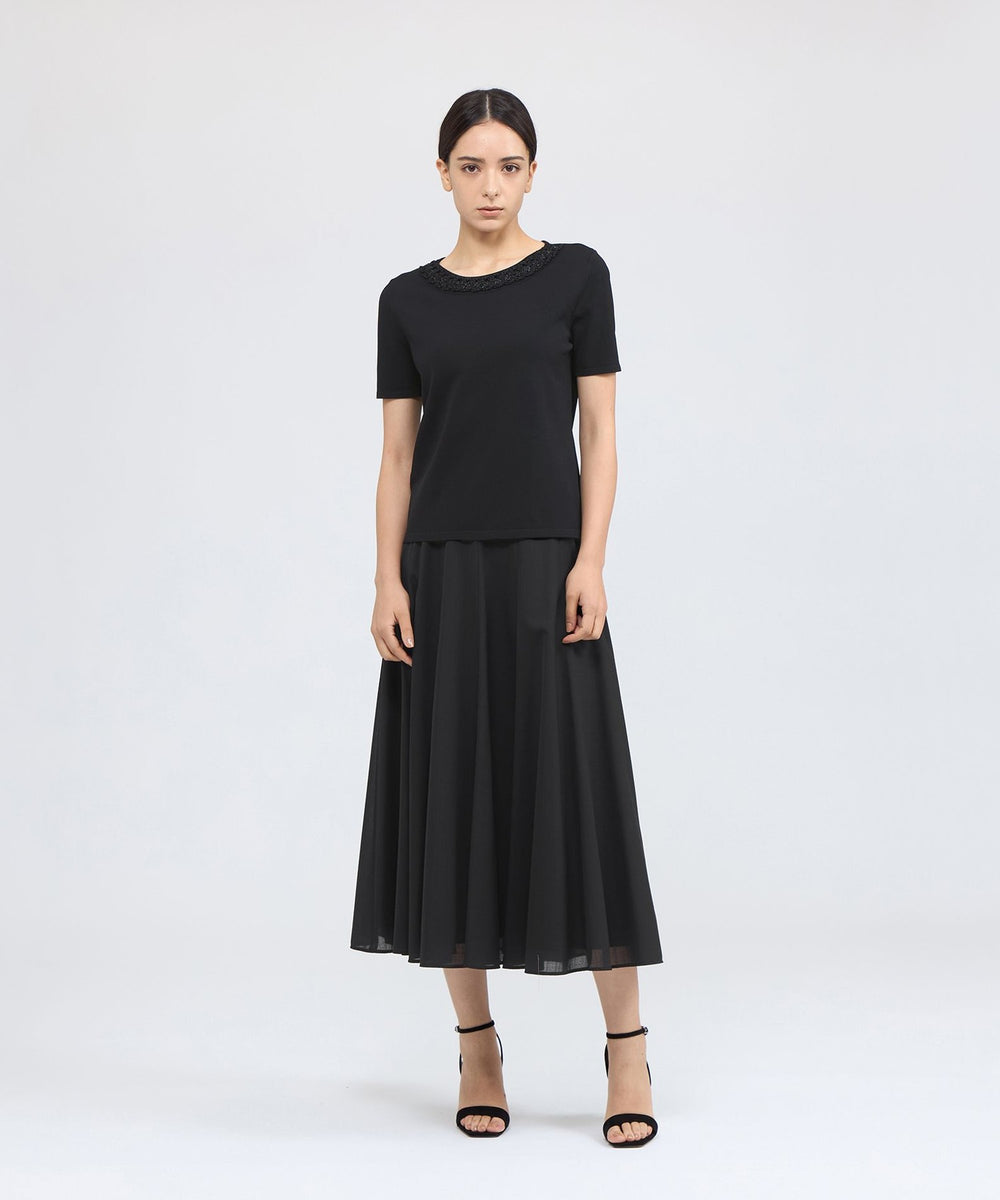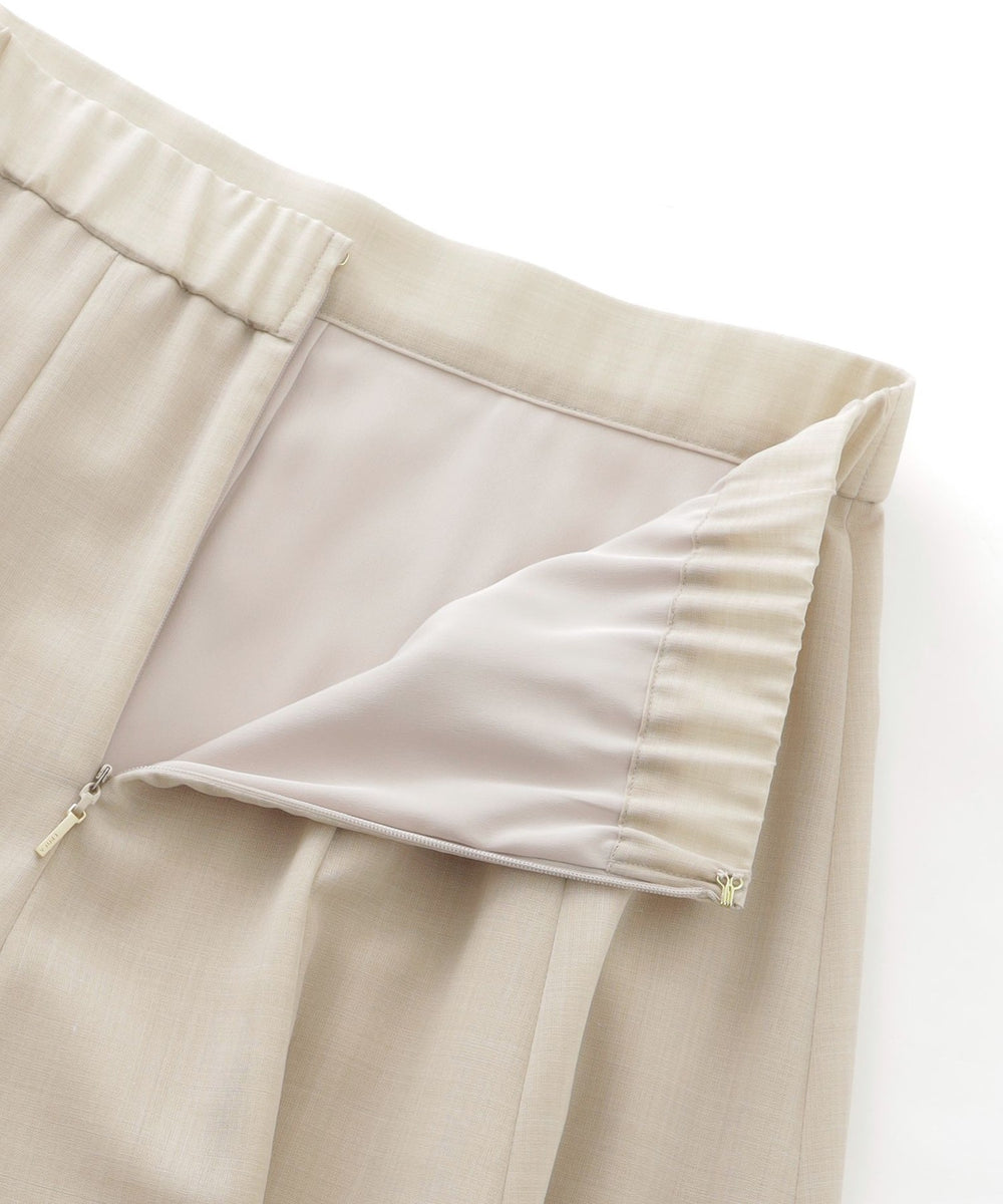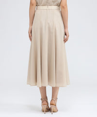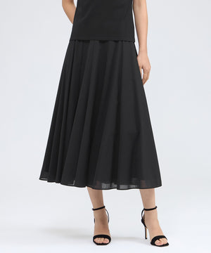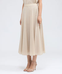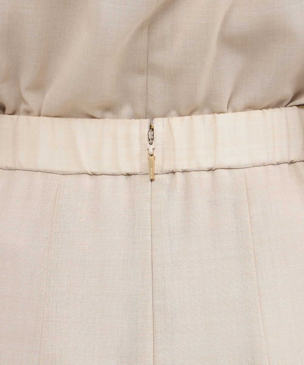 12枚接ぎで仕立てたフレアスカートです。ヒップ周りはスッキリと仕上げ、裾に向かって華やかに広がるボリューム感がエレガントなスウィングシルエットです。ウエストは後ろゴム仕様で快適な着心地です。同素材のトップス(品番:M5M23612)とセットアップで着用いただくのもおすすめです。