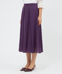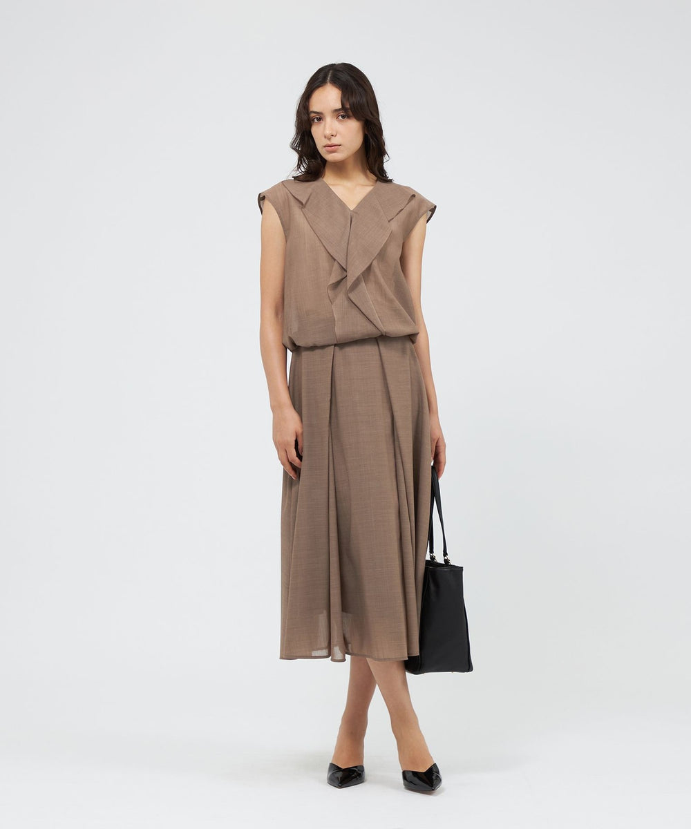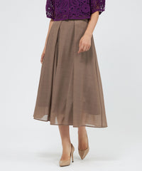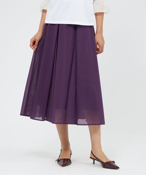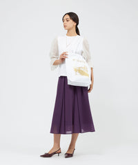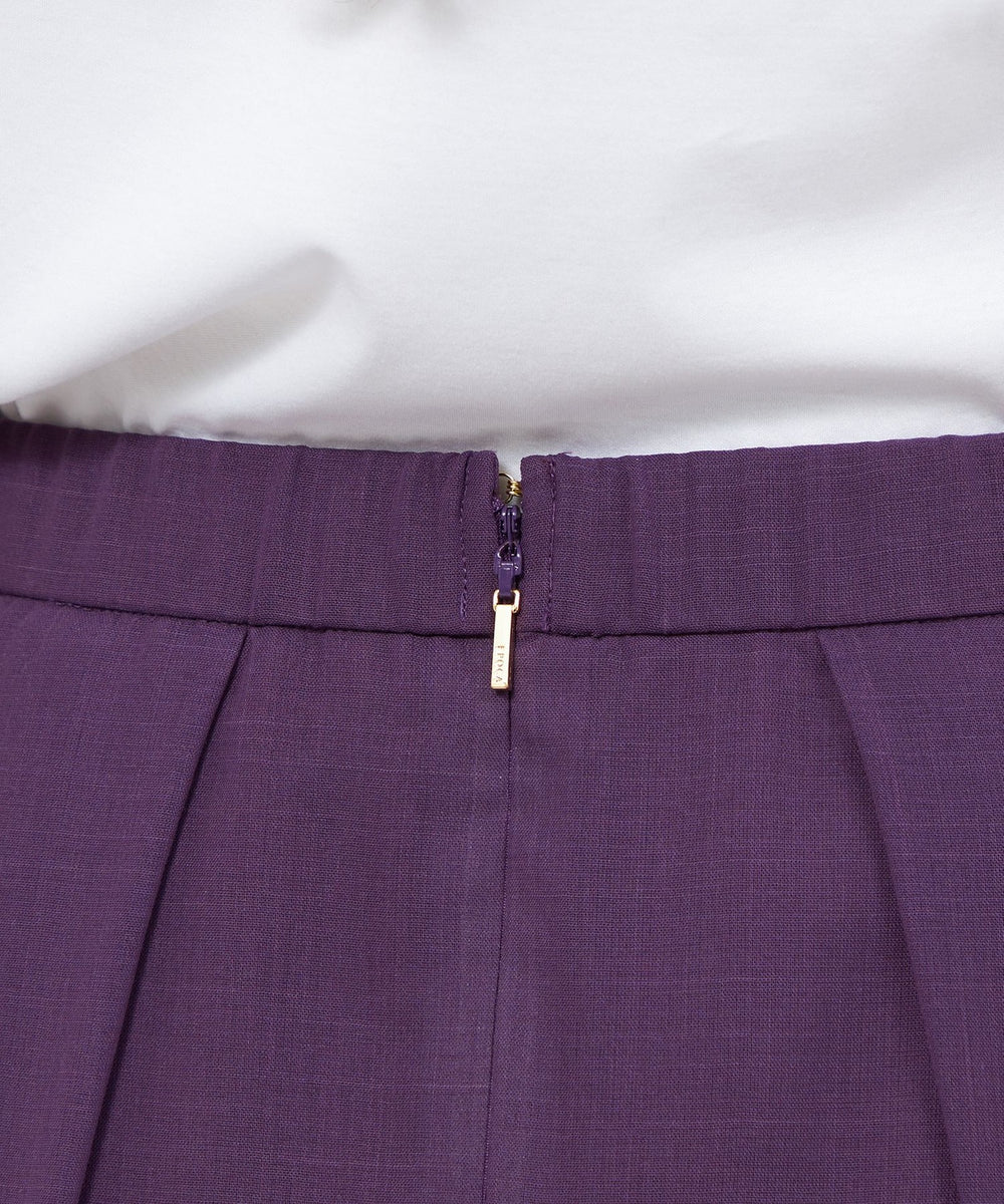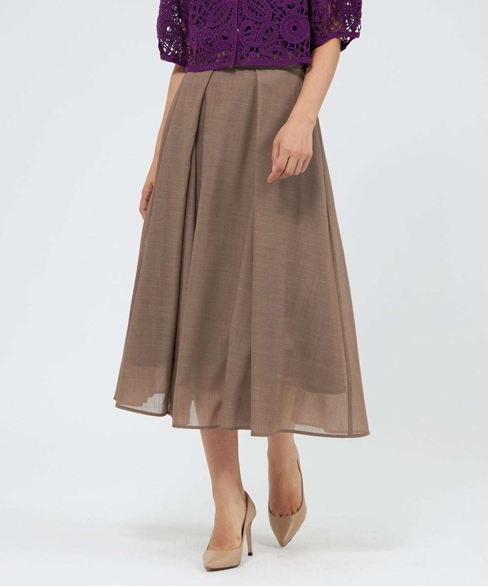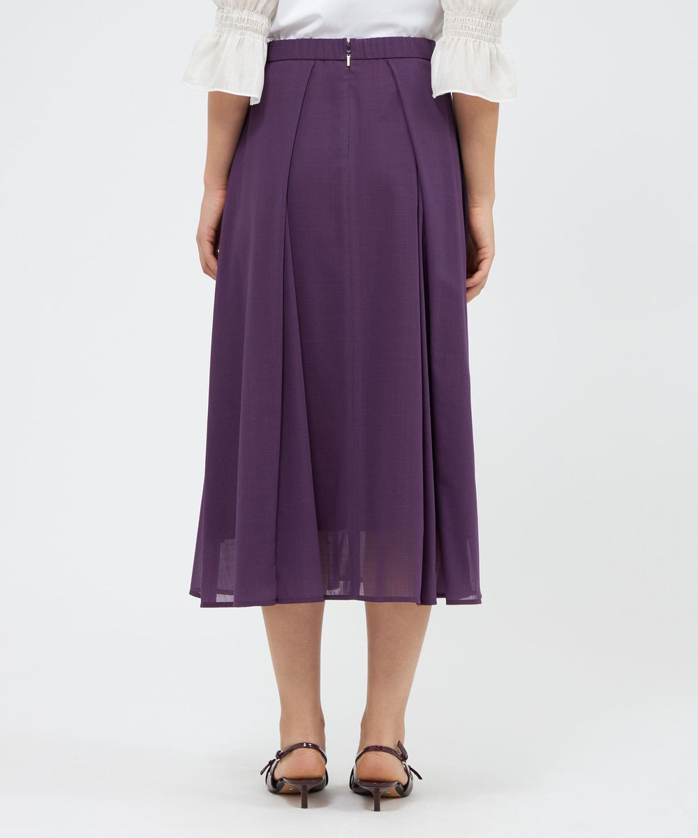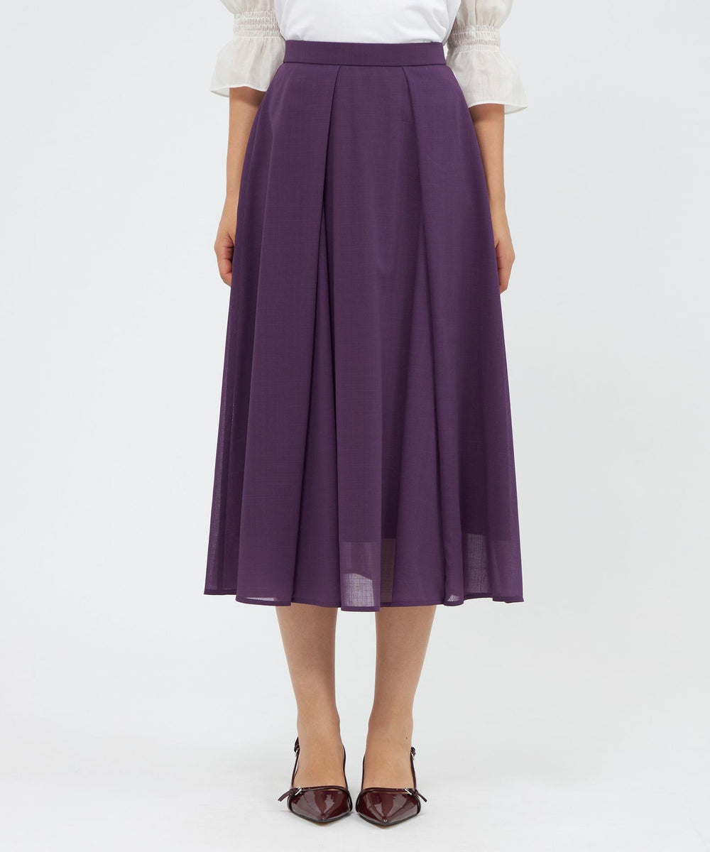 フロントにあしらわれたクロス状のタックディテールがポイントのデザインスカートです。程よいボリューム感がありながらも、ウエストまわりはすっきりと見せてくれる絶妙なシルエットで上品な印象を演出します。同素材のブラウス(品番:M5M24615)とセットアップで着用いただけます。