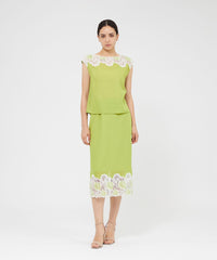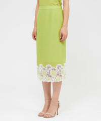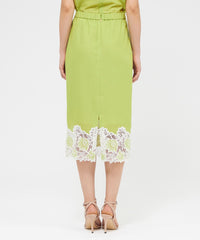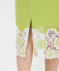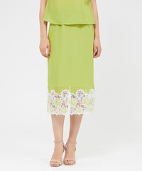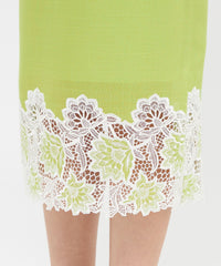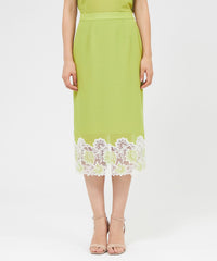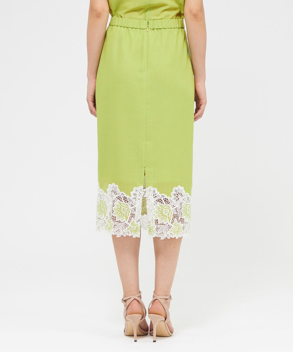 裾にケミカルレース刺繍を施したタイトスカートです。後ろウエストはゴム入りで快適な着心地でありながらも、足元が品よく透けてエレガントな印象に。同素材のブラウス(品番:M5M30569)とセットアップで合わせれば、オンシーンにも対応出来る綺麗めなコーディネートが完成します。