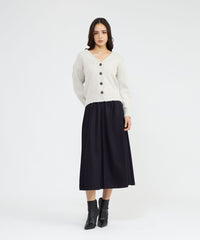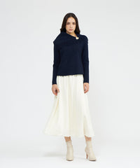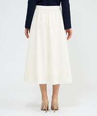 ウエストのドローストリングデザインがリラクシーな着心地のフレアスカート。脇にかけてボリュームを持たせたフレアが動きのあるシルエットを演出します。ドローコードの先端にはゴールドパーツを効かせ、上質感を引き立てた1着です。