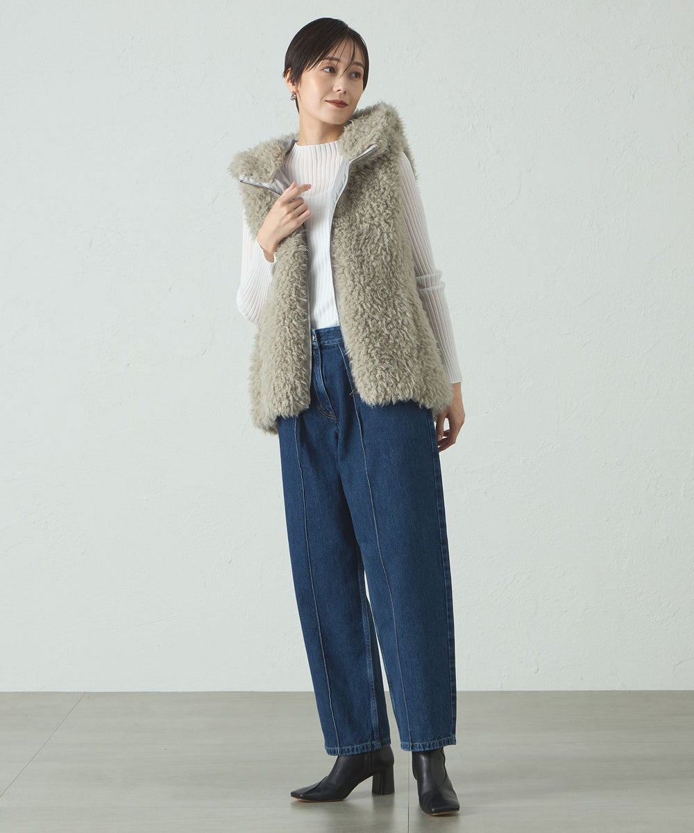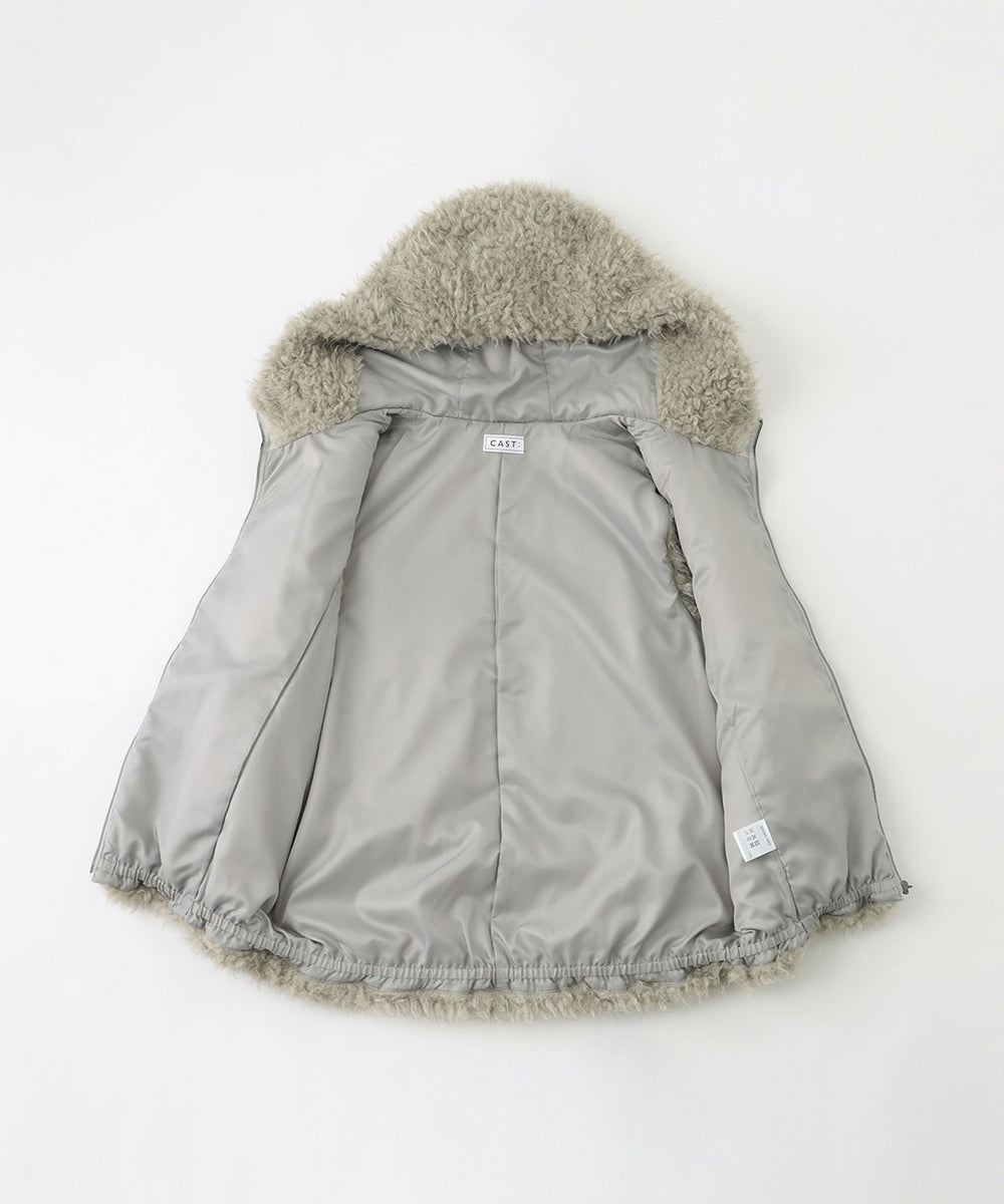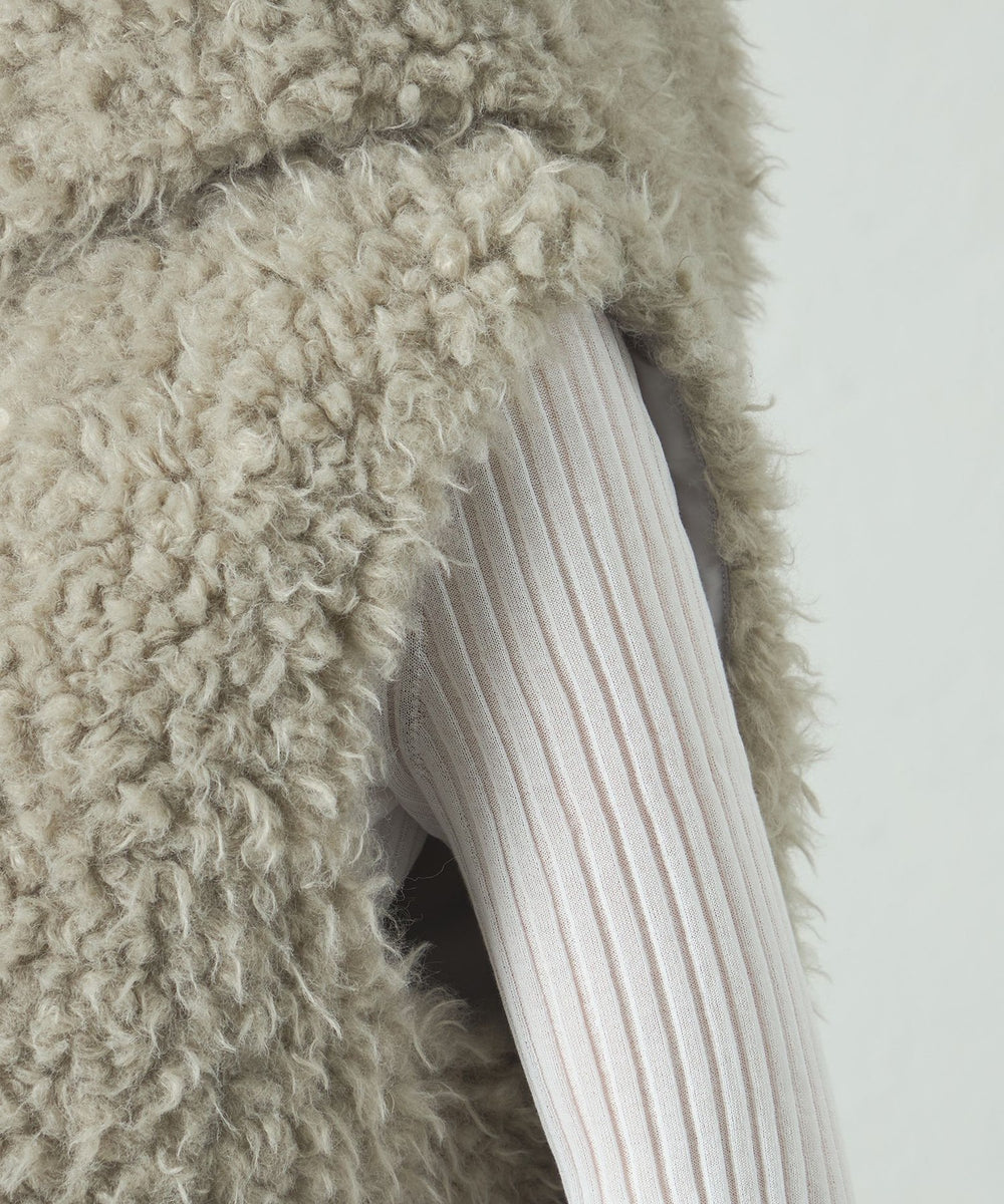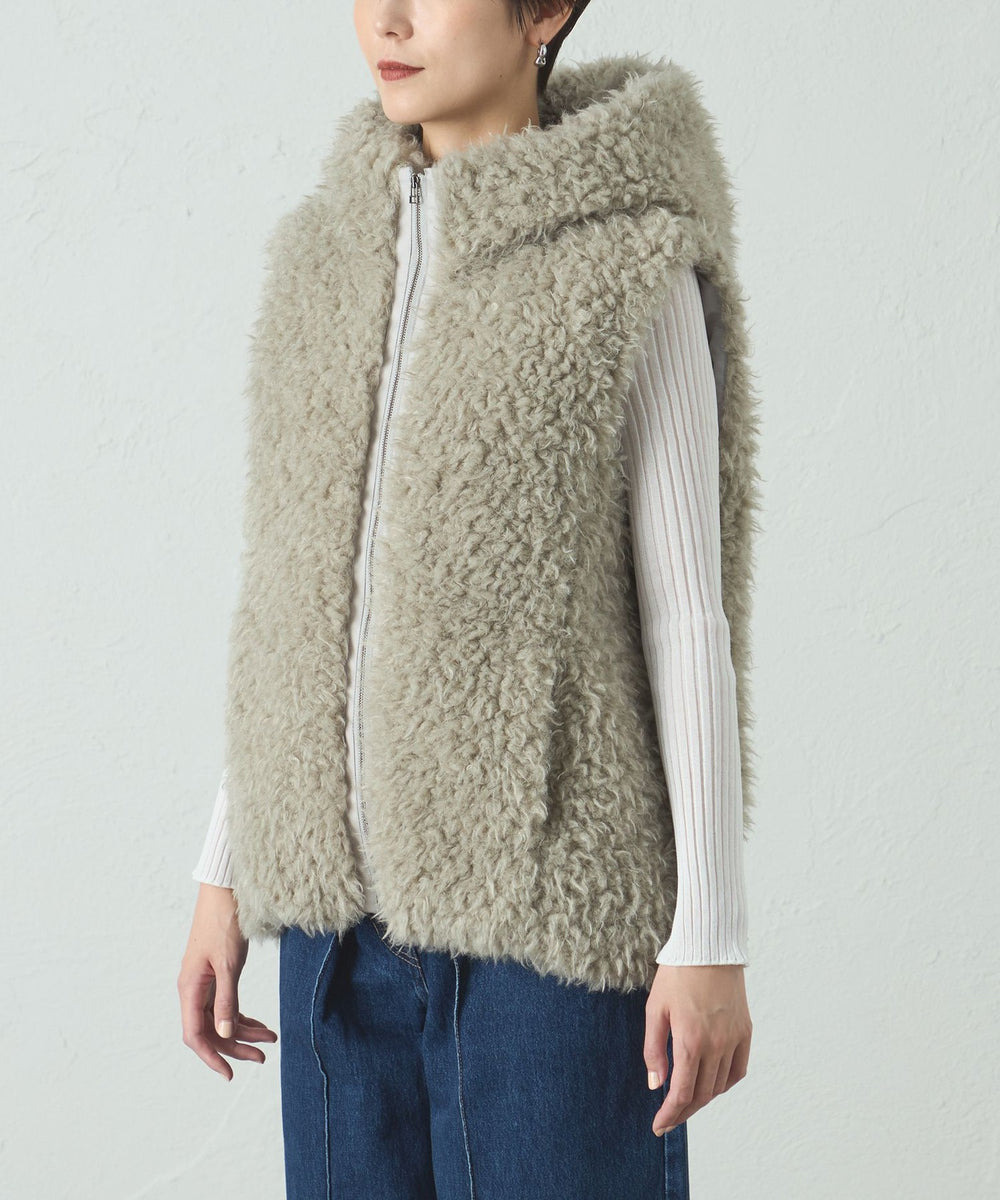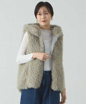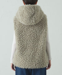 暖かみのあるエコファー素材を使用したハイネックフードが目を引くベスト。