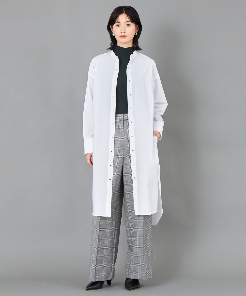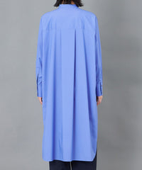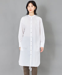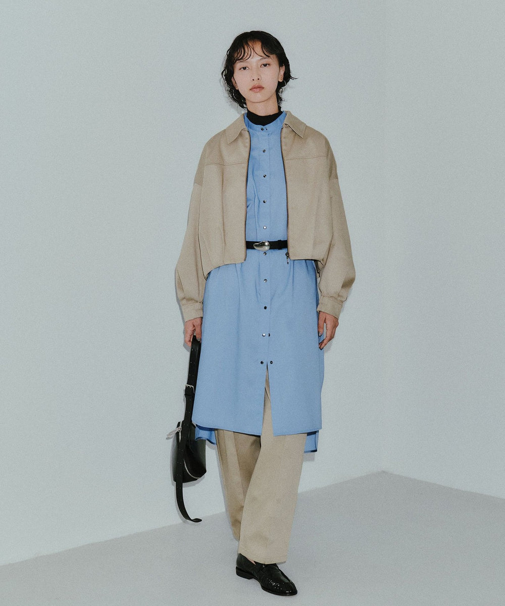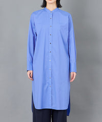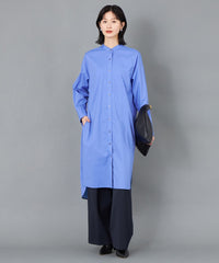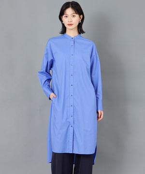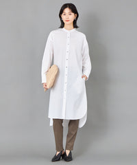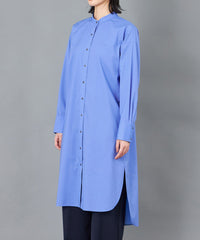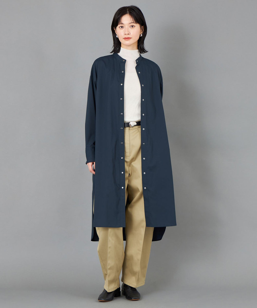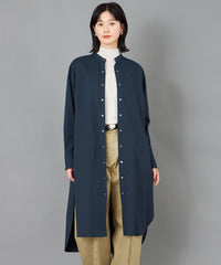 ベーシックなシルエットのロングシャツ。前立てにはドット釦を使い、アウターのようにも使える仕様にしました。