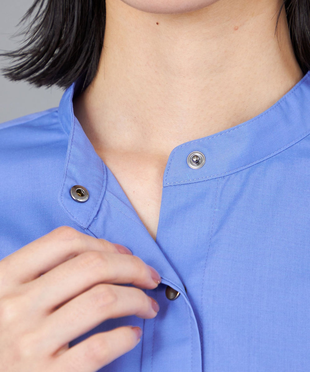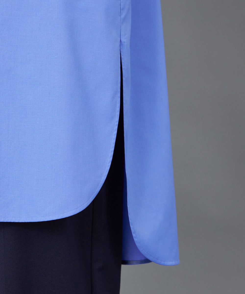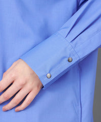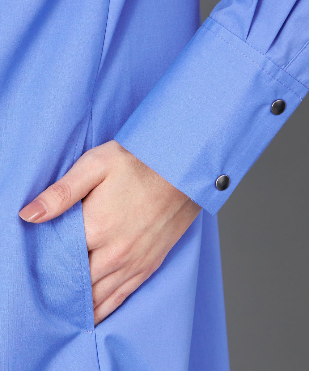 ベーシックなシルエットのロングシャツ。前立てにはドット釦を使い、アウターのようにも使える仕様にしました。