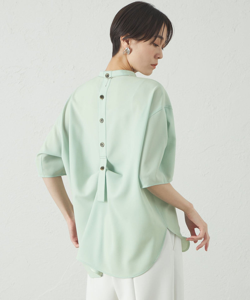 ブランド定番のバックボタンデザインが目を引く半袖ブラウス。