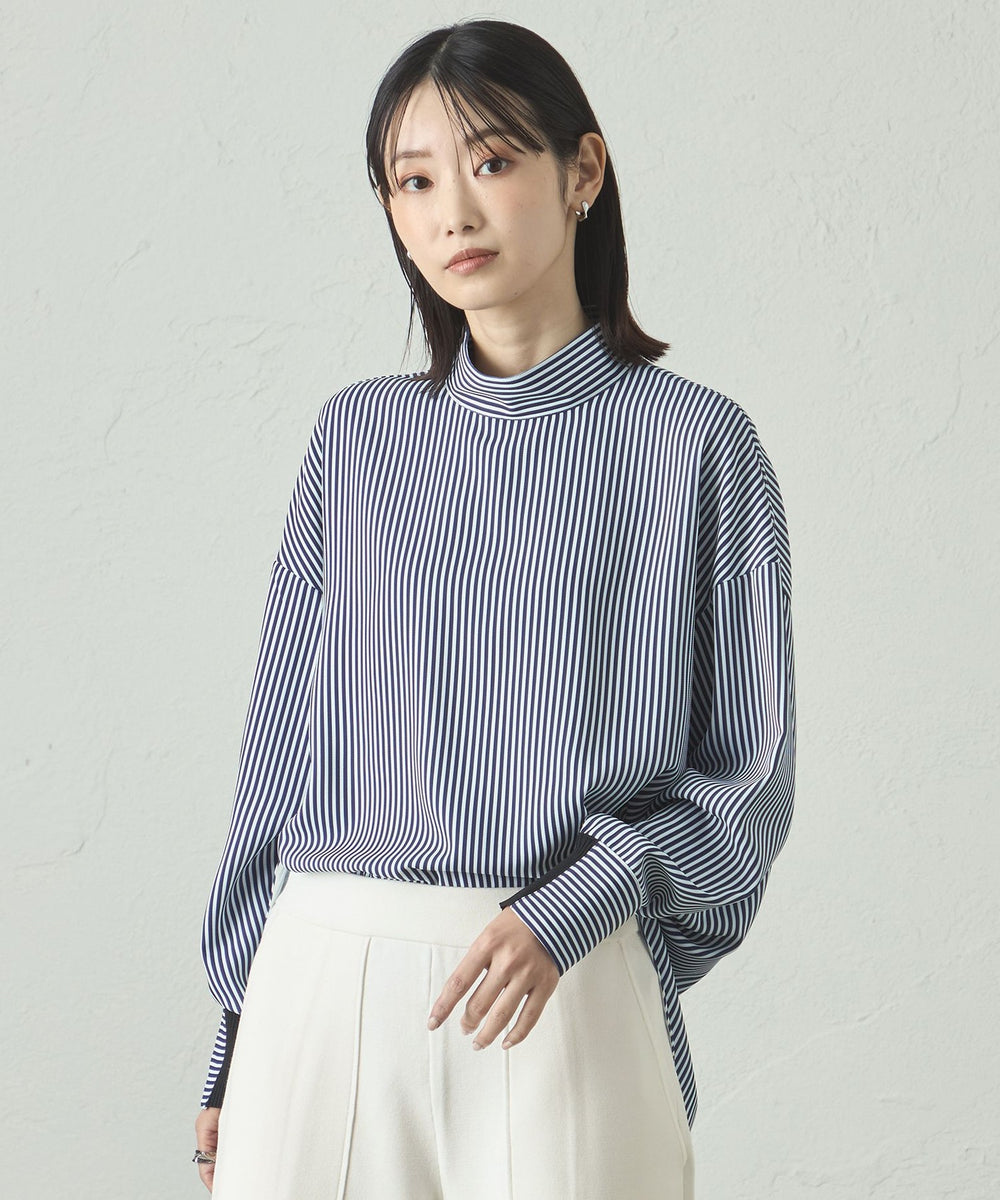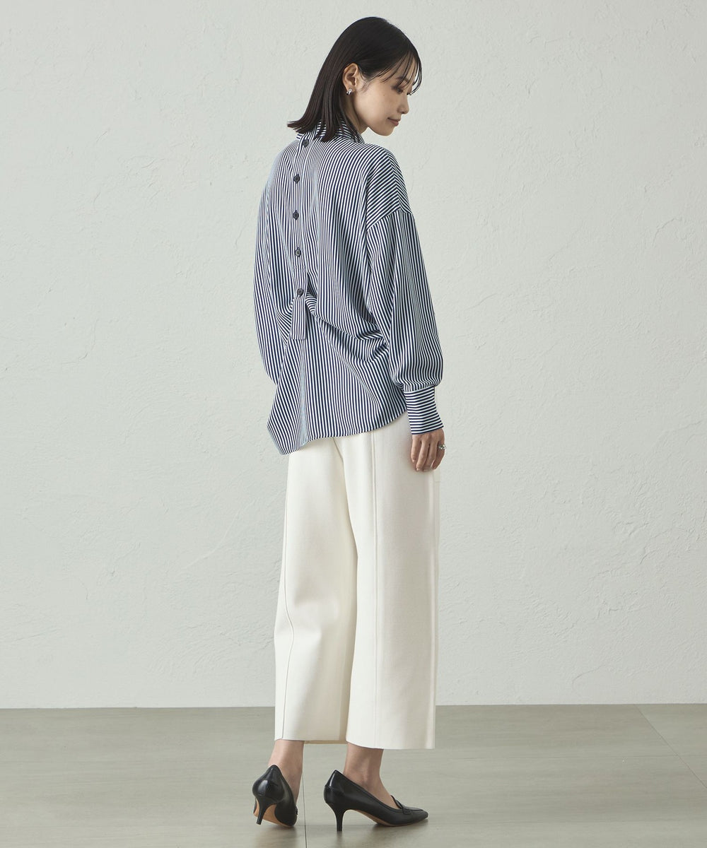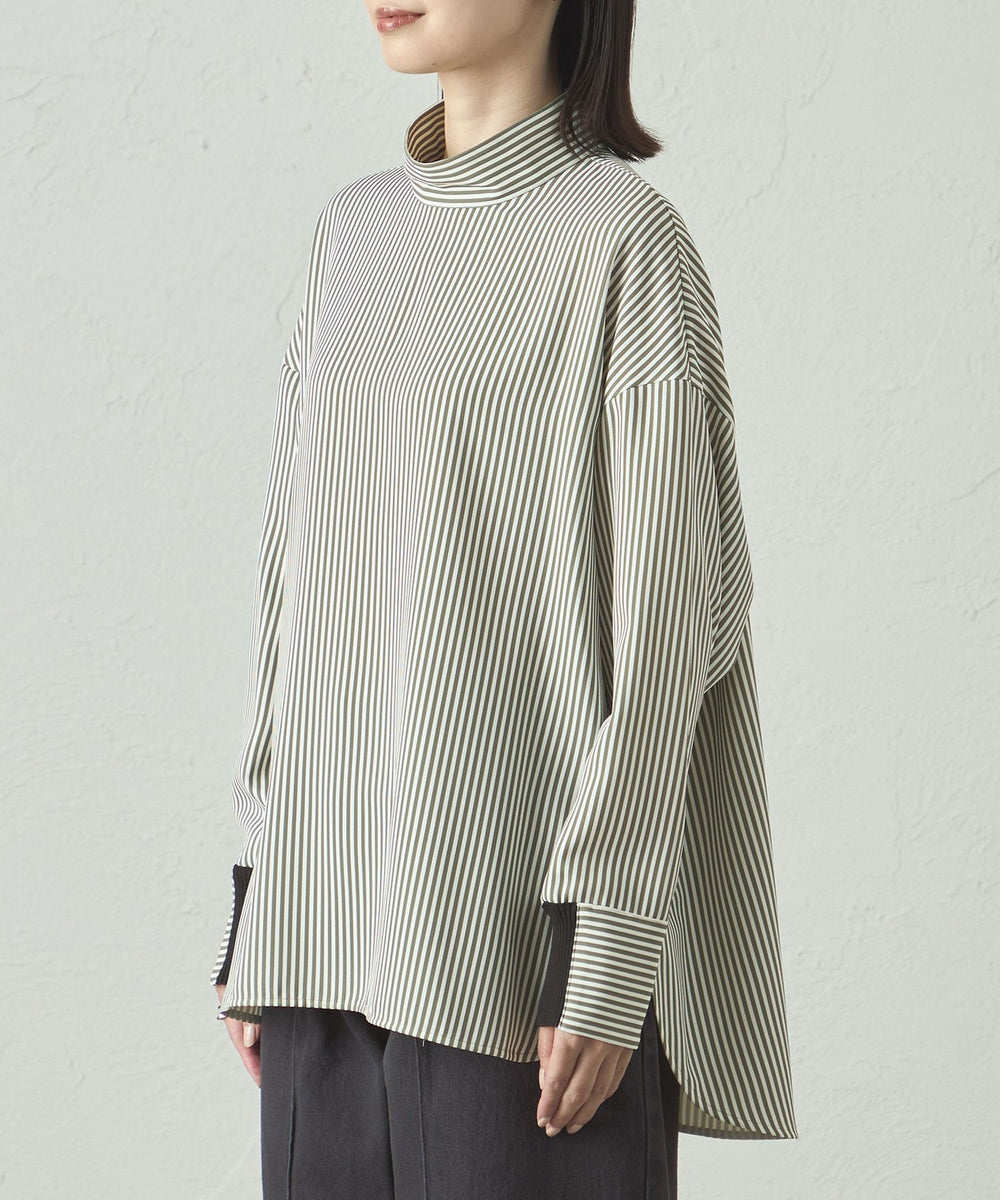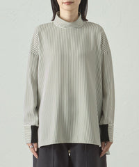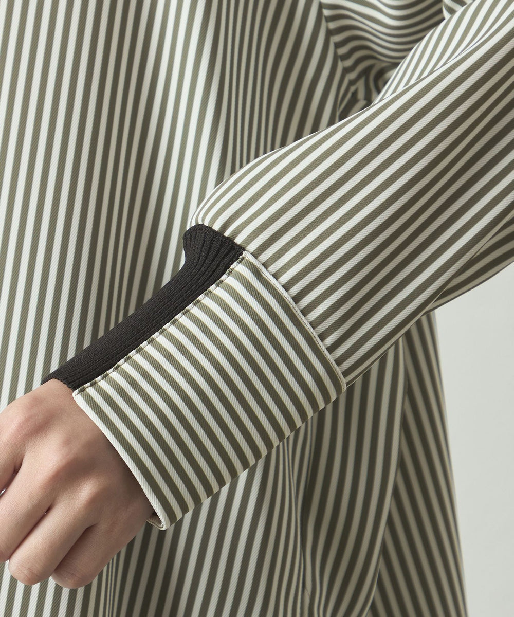 ストライプ柄でシャープな印象がありながらも、体から離れたゆったりシルエットで、ストレスフリーな着心地。袖部分にもニットリブが付いているので、動きやすさがありながら、袖を上げた時にきちんと留まる計算された仕様です。
