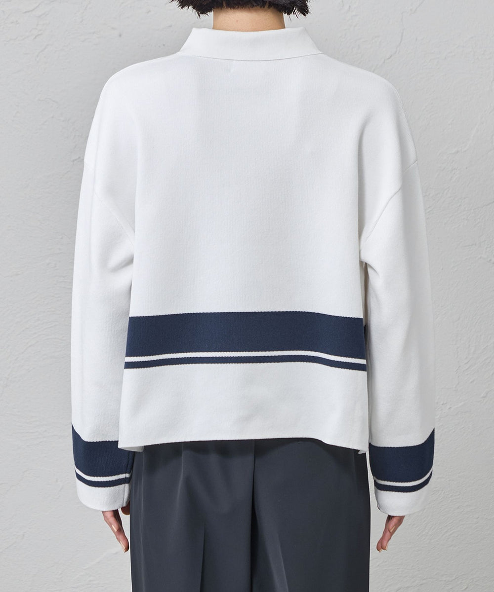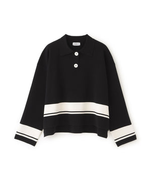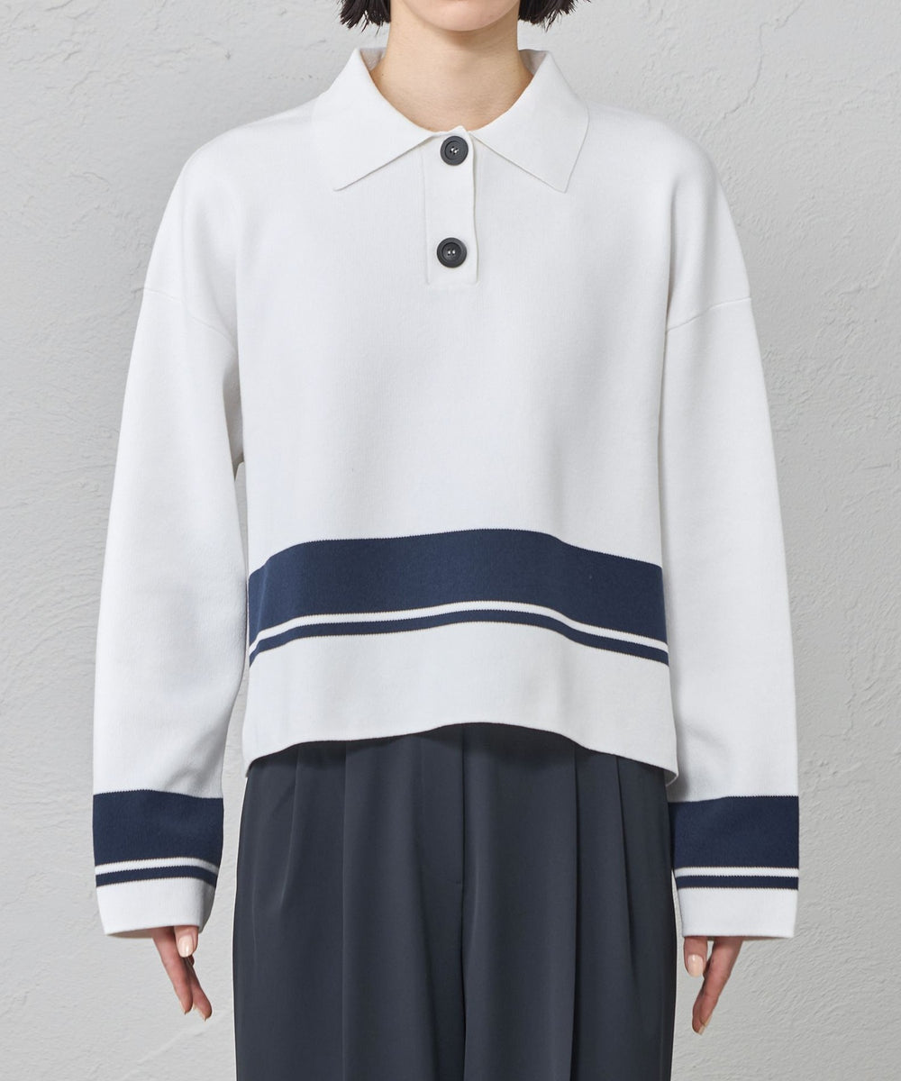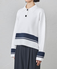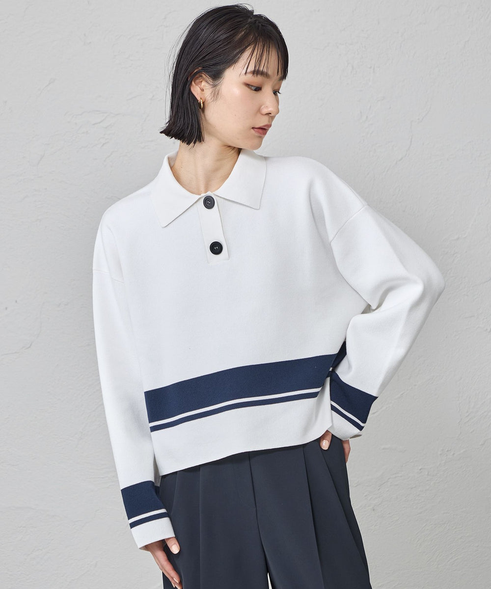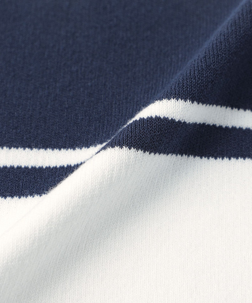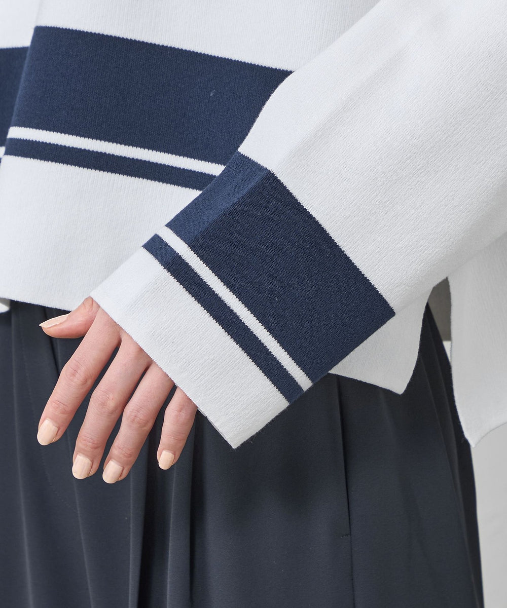 ボクシーなシルエットのニットプルオーバー。太幅のボーダーデザインと大きめなボタンがデザインポイント。