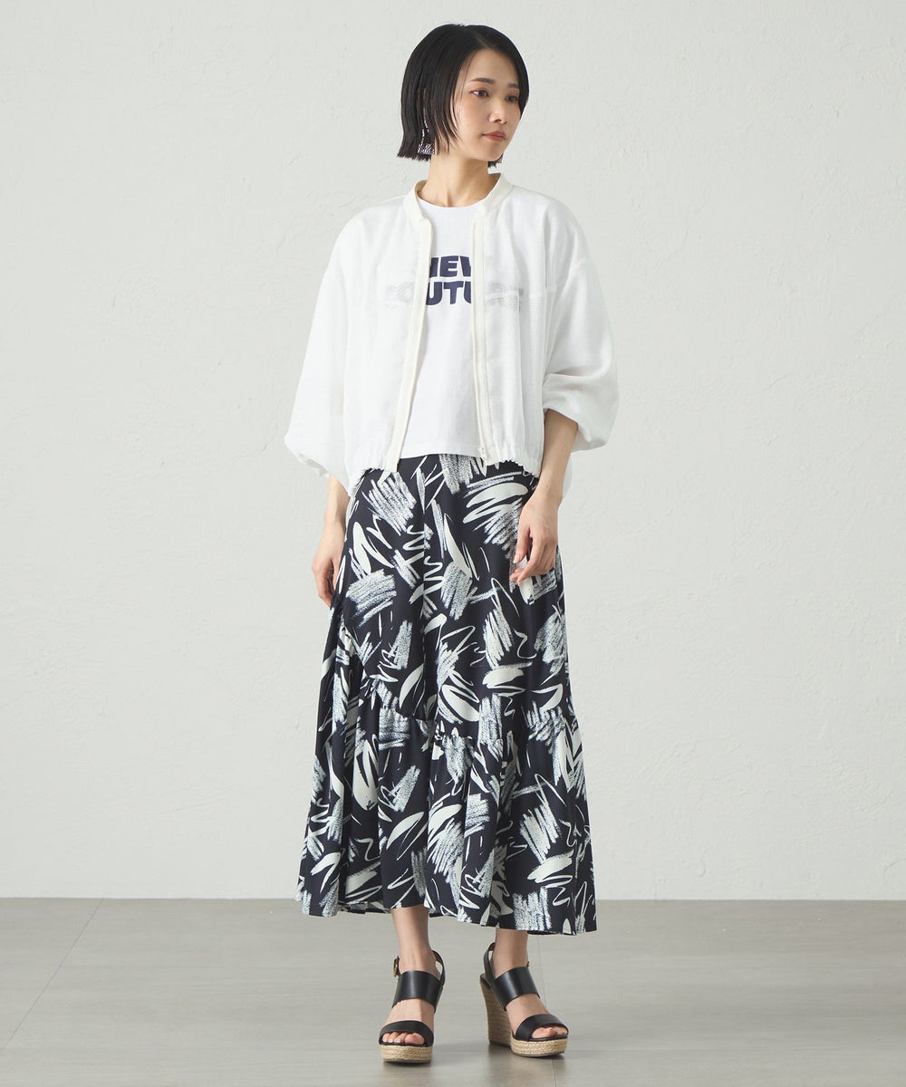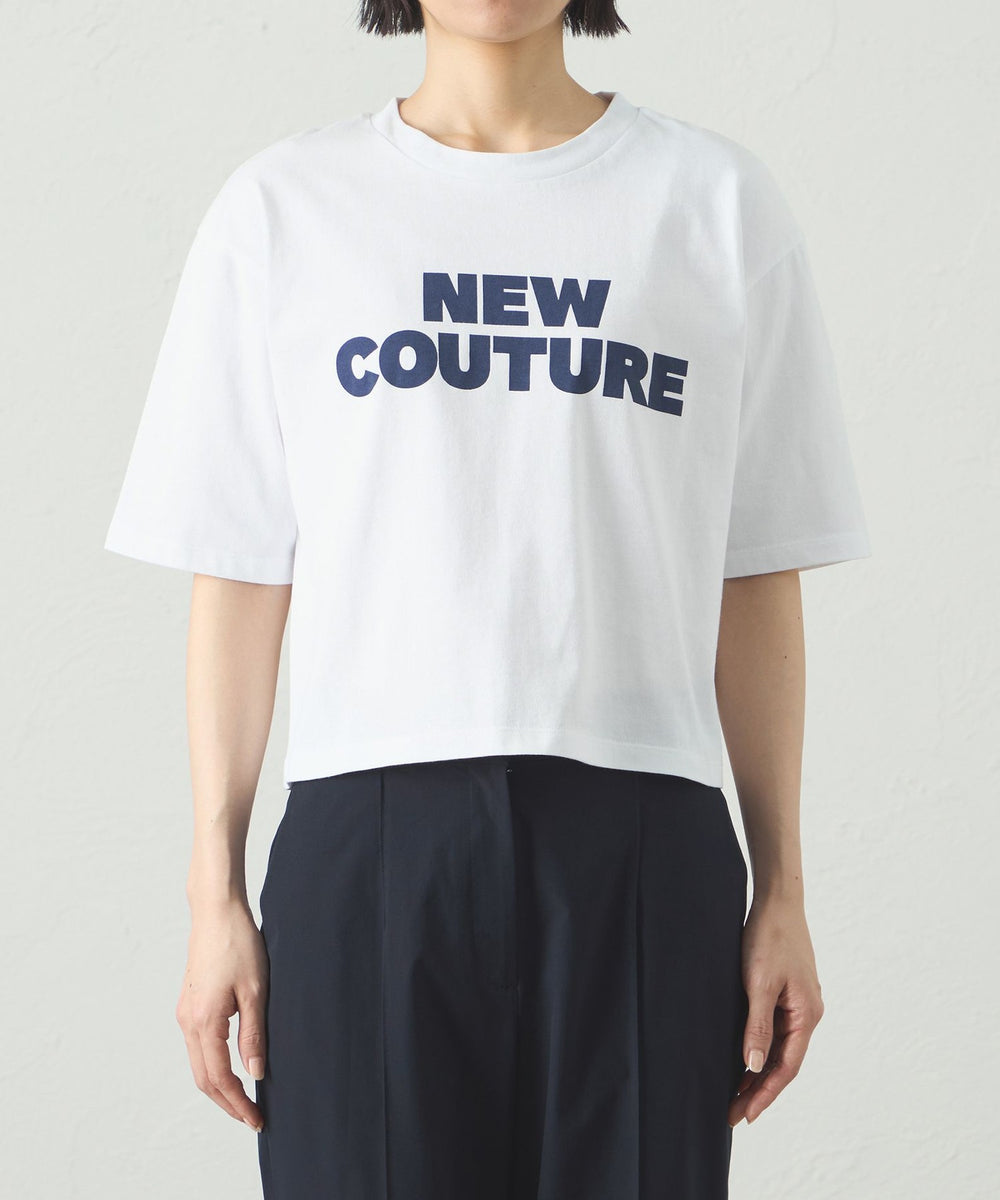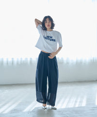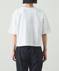 クロップド丈なので、ハイウエストボトムスやロングスカートとの合わせがおススメ。新鮮な丈なので、いつものTシャツスタイリングに新しさをプラスしてくれます。