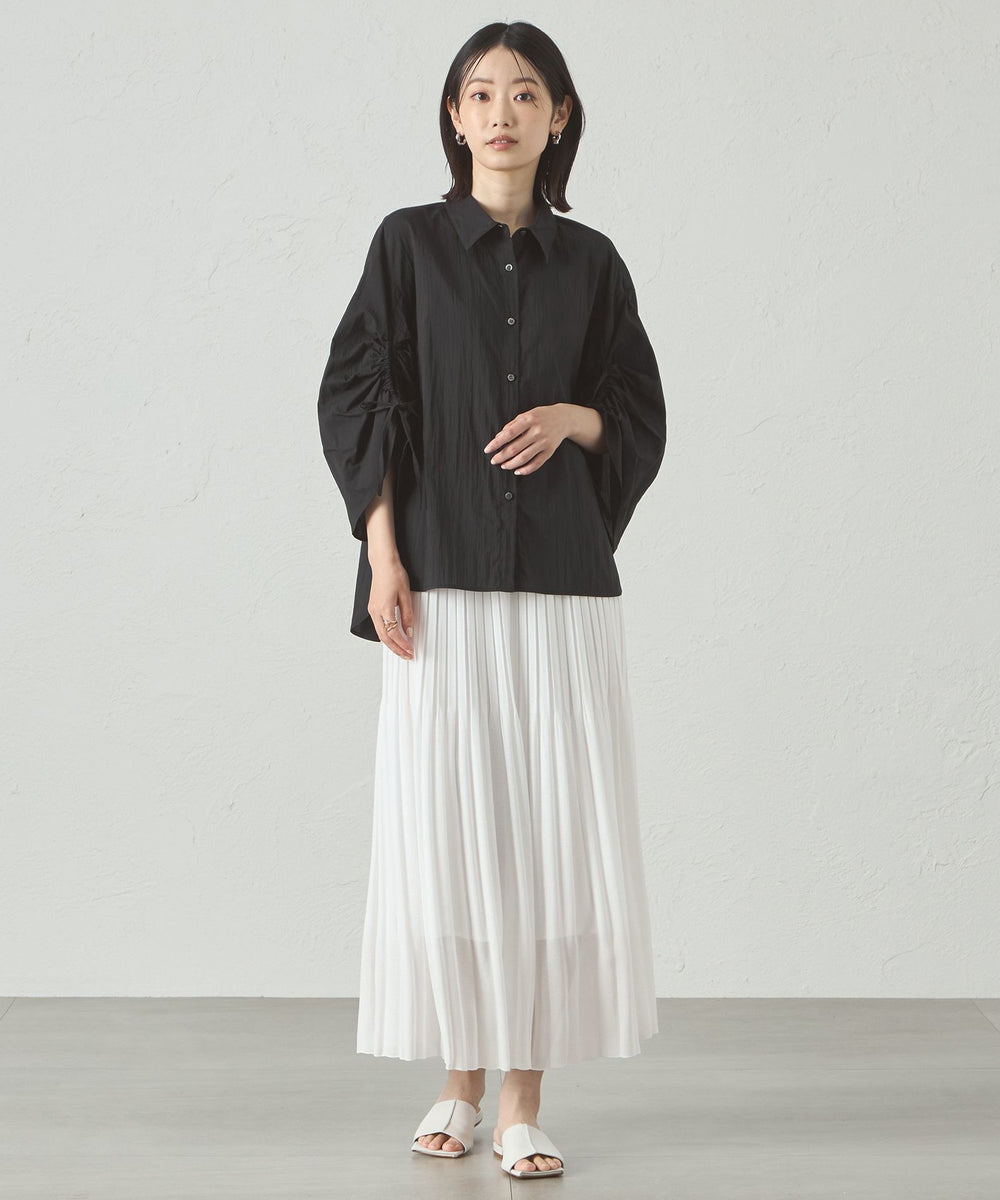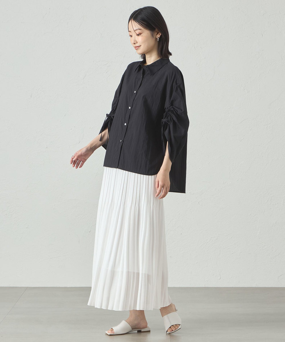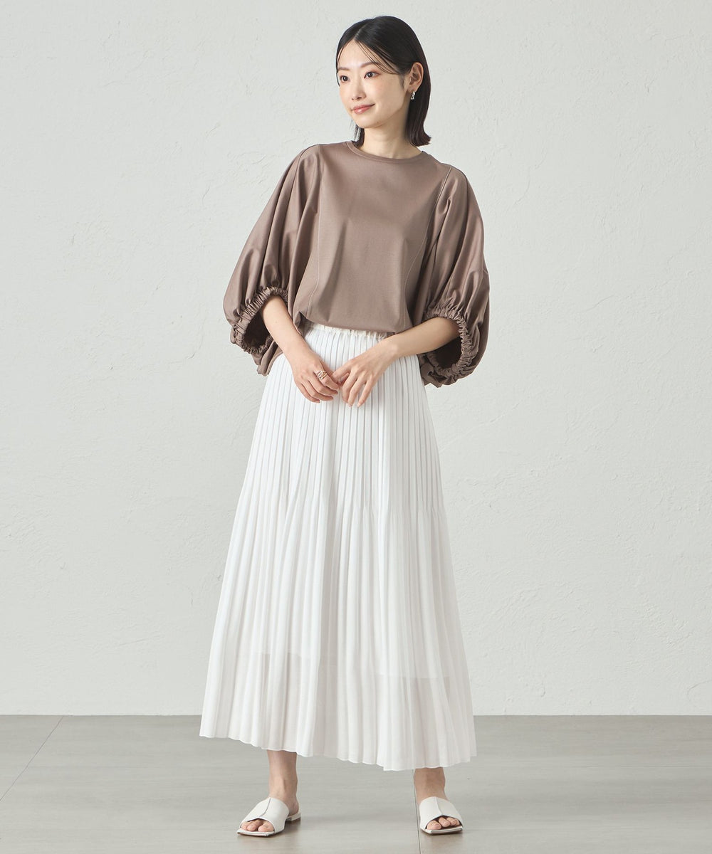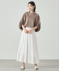 裾に向かってプリーツが自然に消えていく仕様になっていて、全体的に柔らかい雰囲気です。