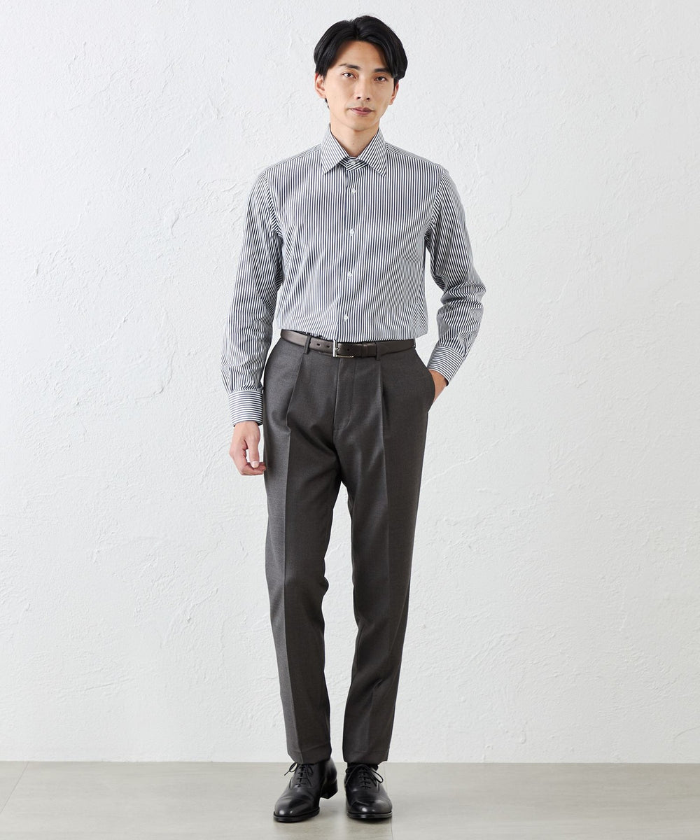 セミワイドカラーは、タイドアップからノーネクタイでの着用まで美しくリッチな顔回りを演出するように設計しています。