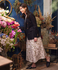 可憐なジャスミンの花を散りばめたプリント。春のシーズンカラーを意識したピンクベージュベースのホワイトジャスミンと、ネイビーベースのブルージャスミンの2カラーです。