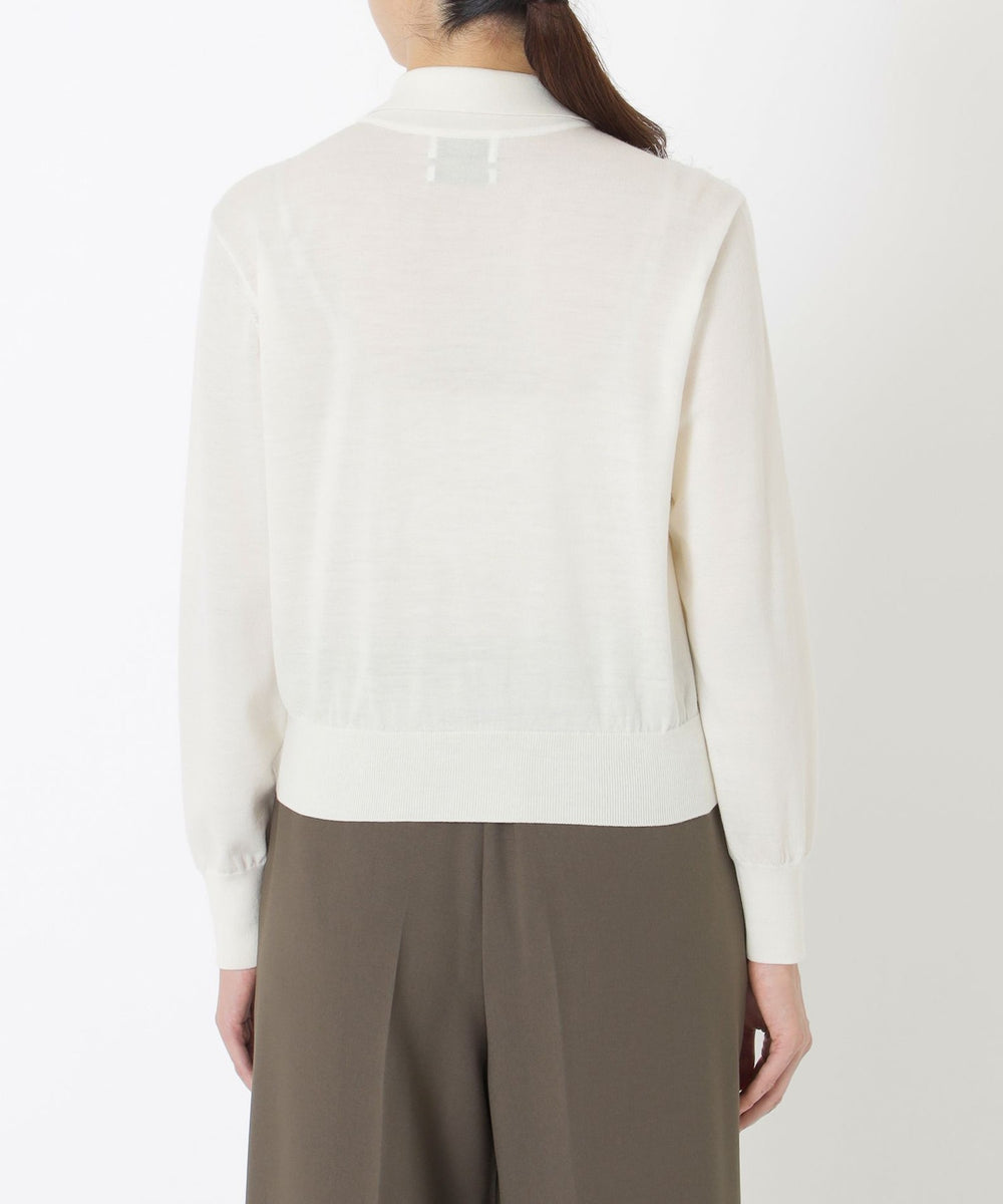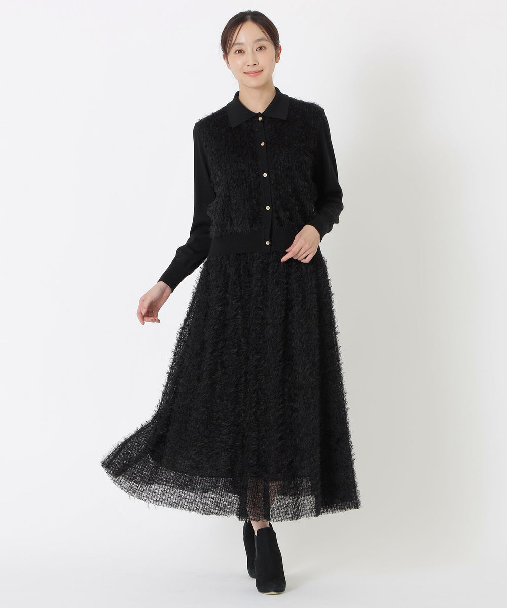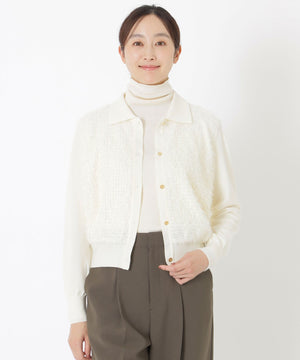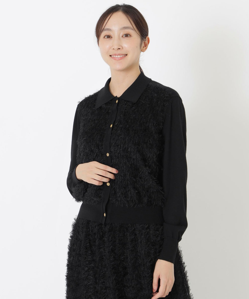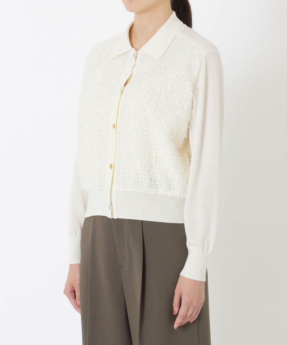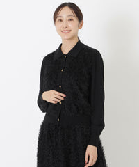 フェザータッチのチュールを前身頃に重ねた襟付き長袖カーディガンです。