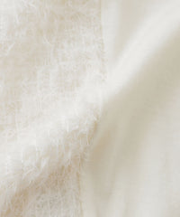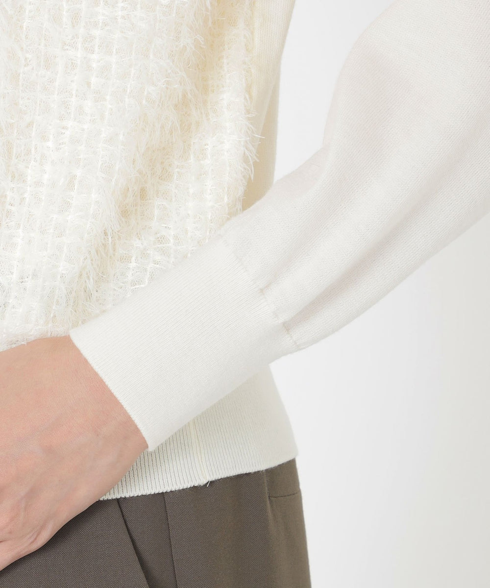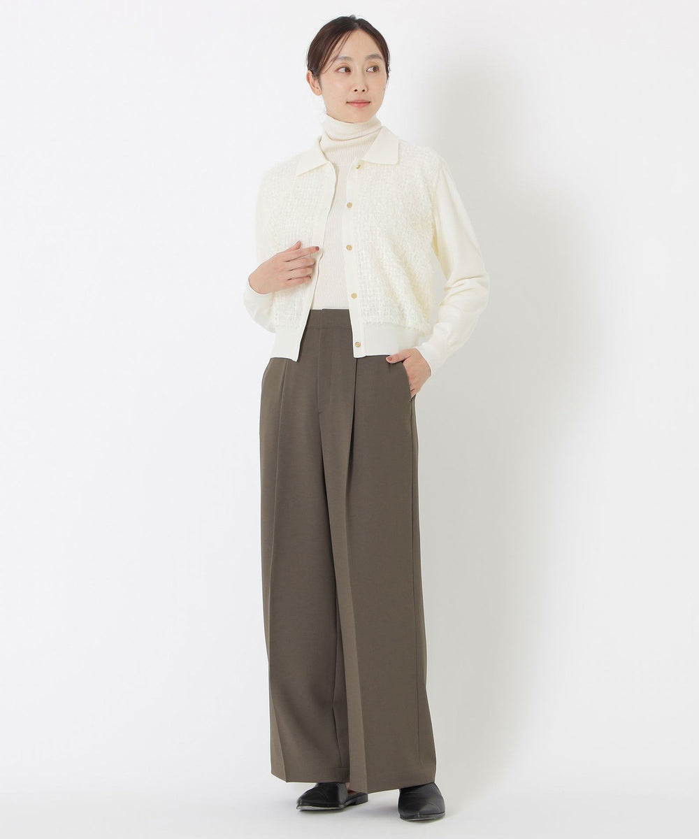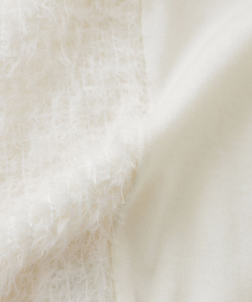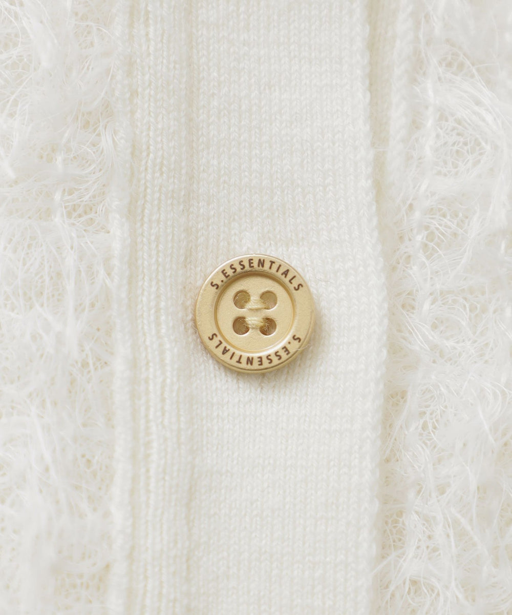 フェザータッチのチュールを前身頃に重ねた襟付き長袖カーディガンです。