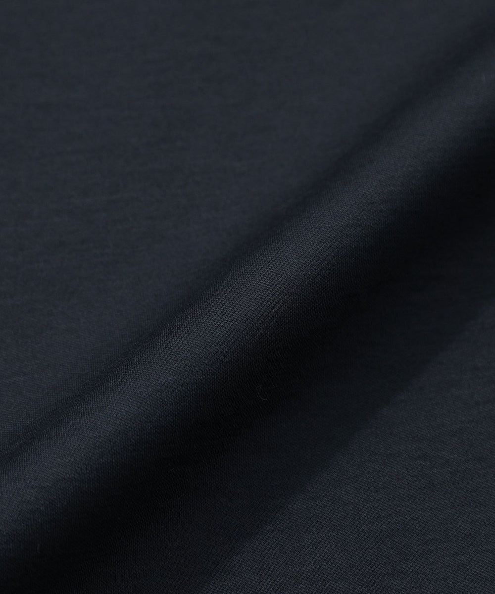 ジャージー素材でありながら、まるで布帛のようなハリ感に、毛羽が少なく艶やかな光沢を持ち、肌触りは絹のようになめらか。