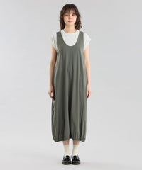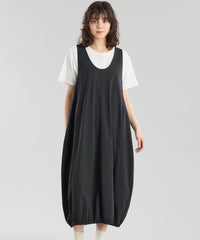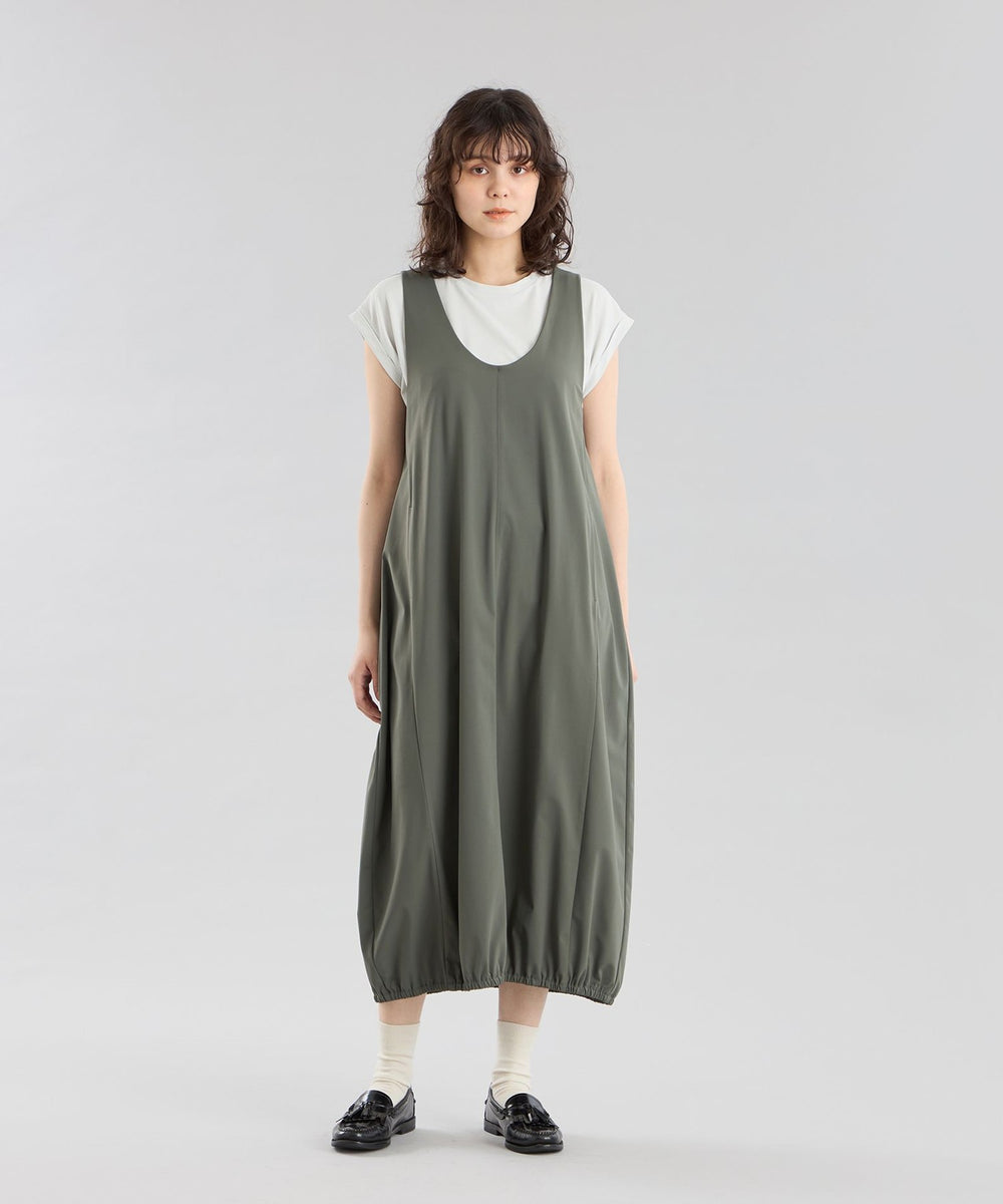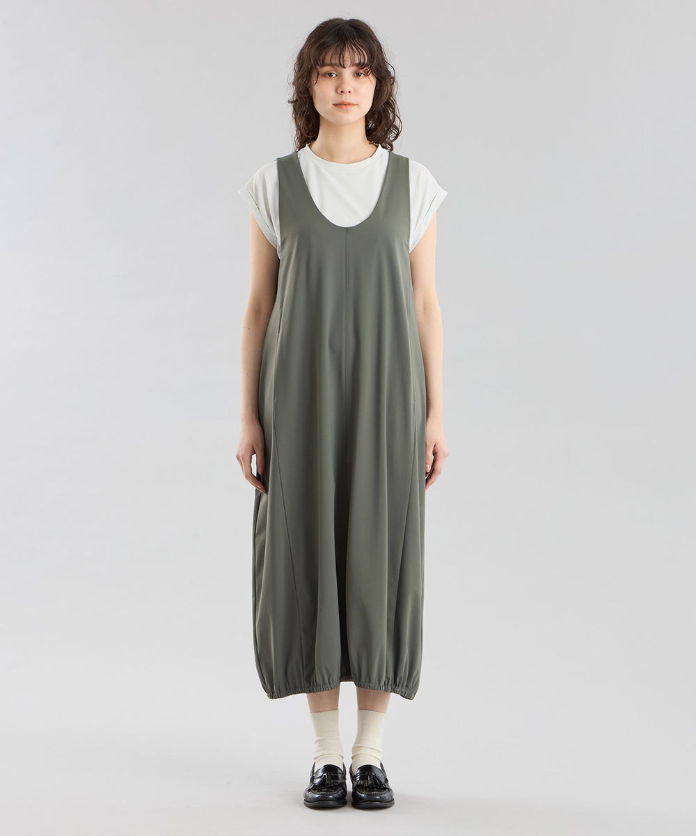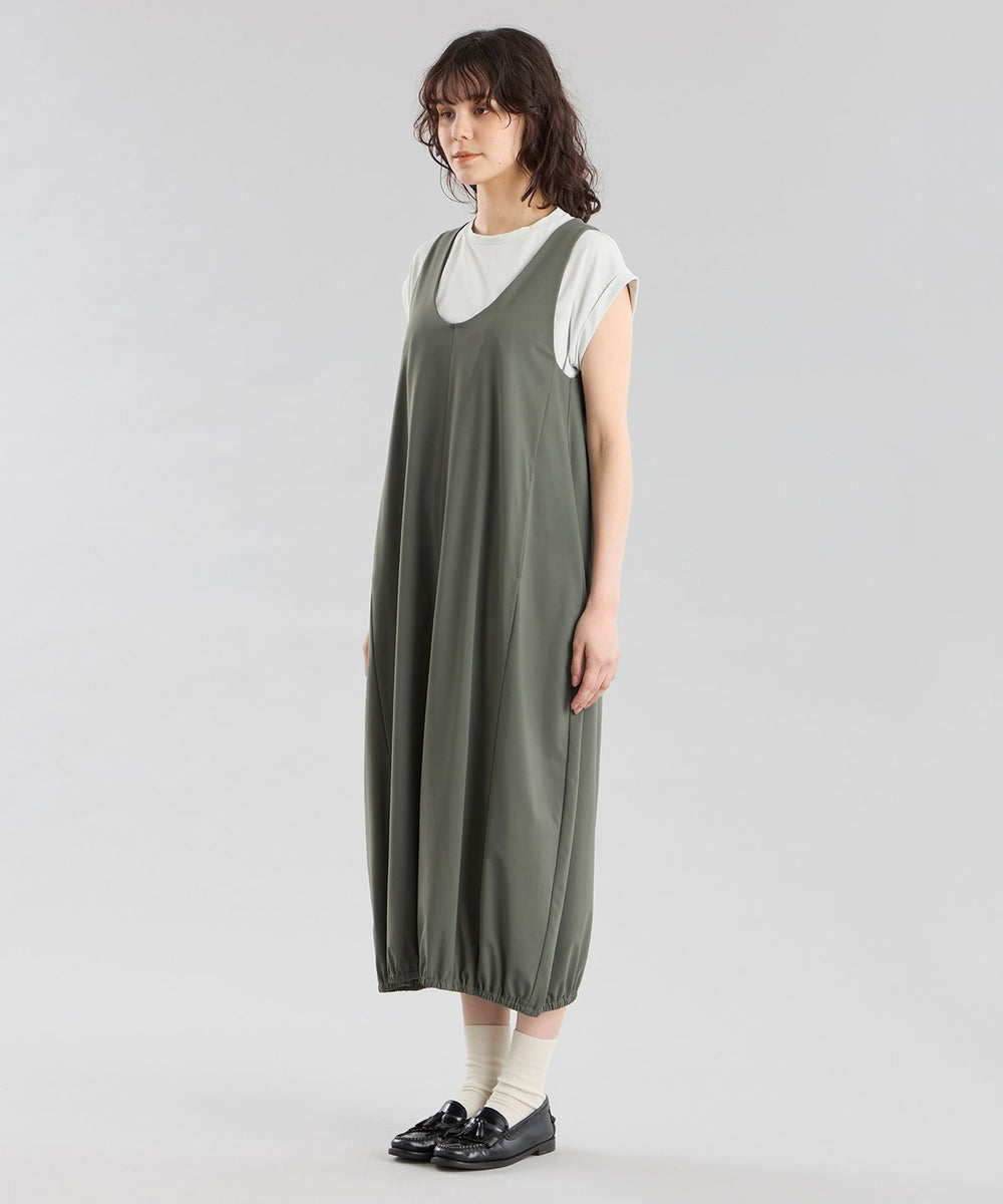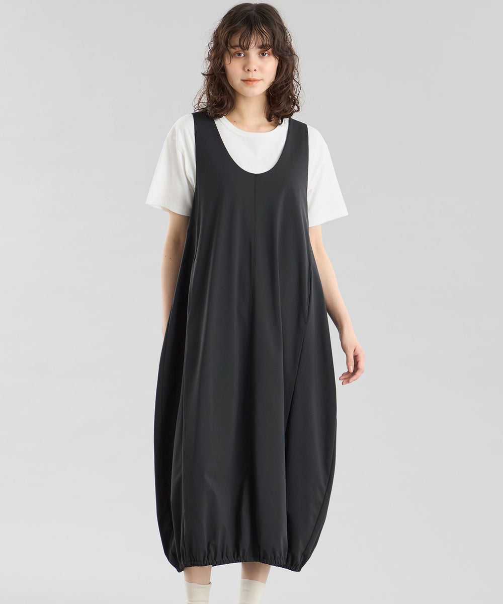 裾を絞ったコクーンシルエットのレイヤードジャージードレス。