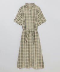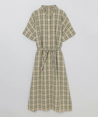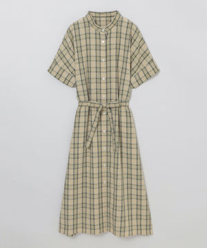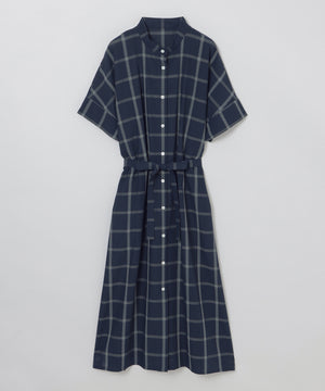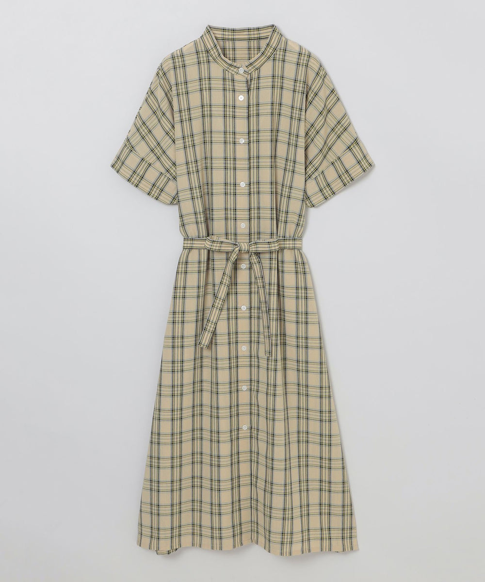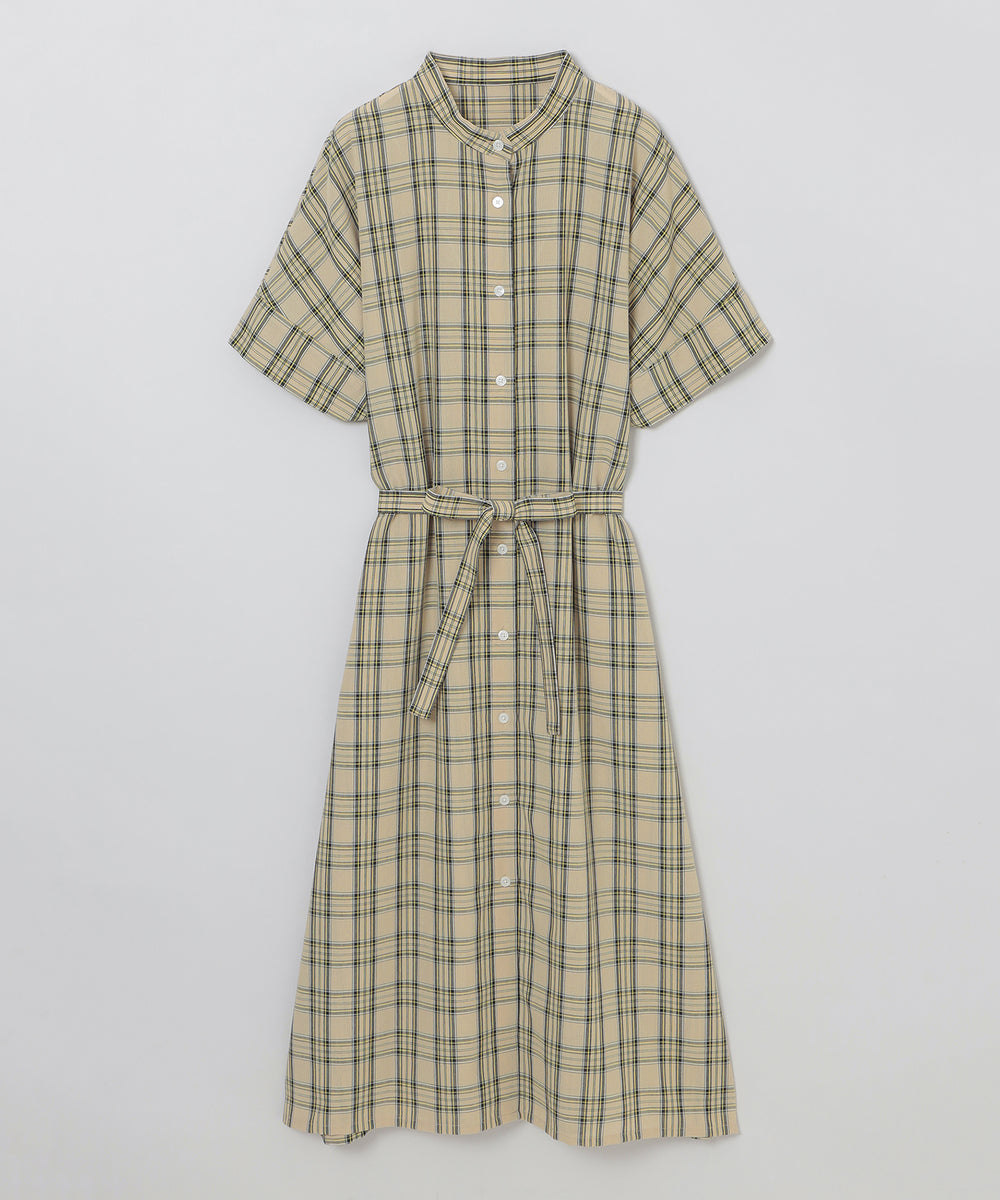 バンドカラーチェックワンピース。オリジナルチェック柄をリラックス感のあるドルマンスリーブのシャツワンピースデザインに落とし込みました。共地ベルト付き。