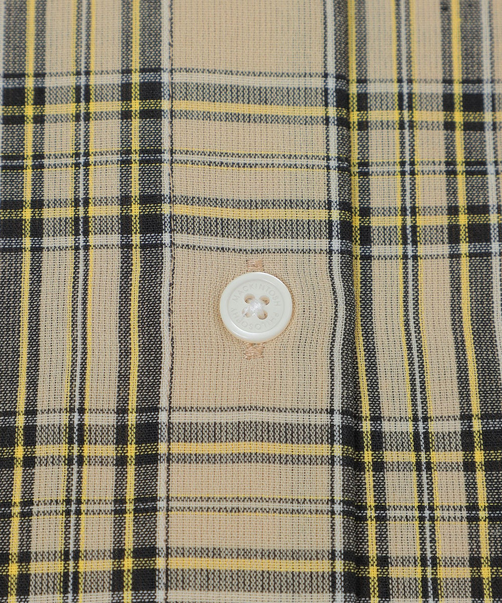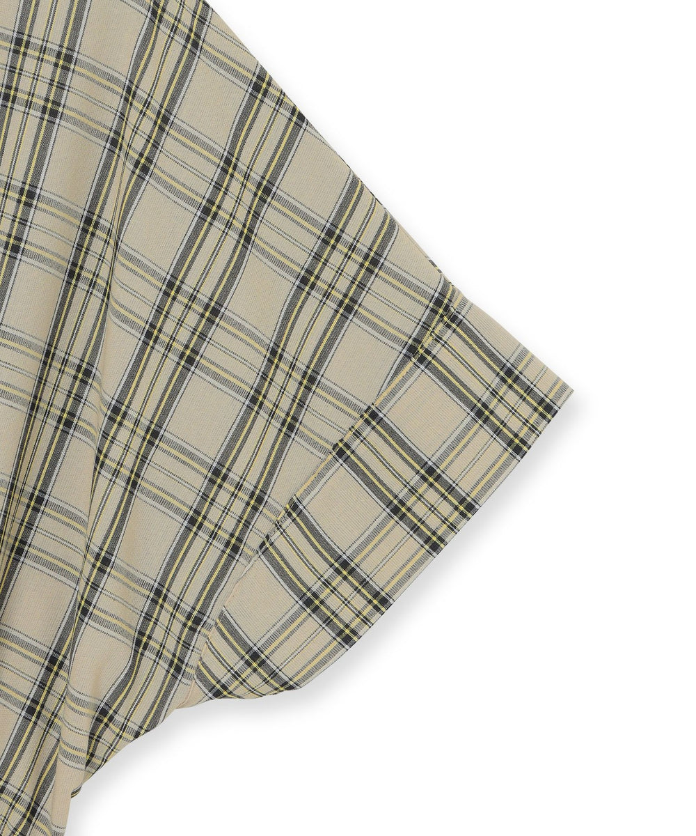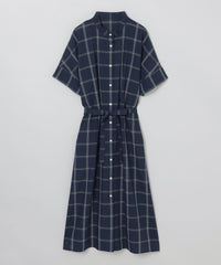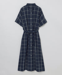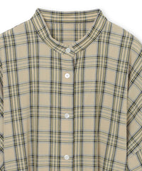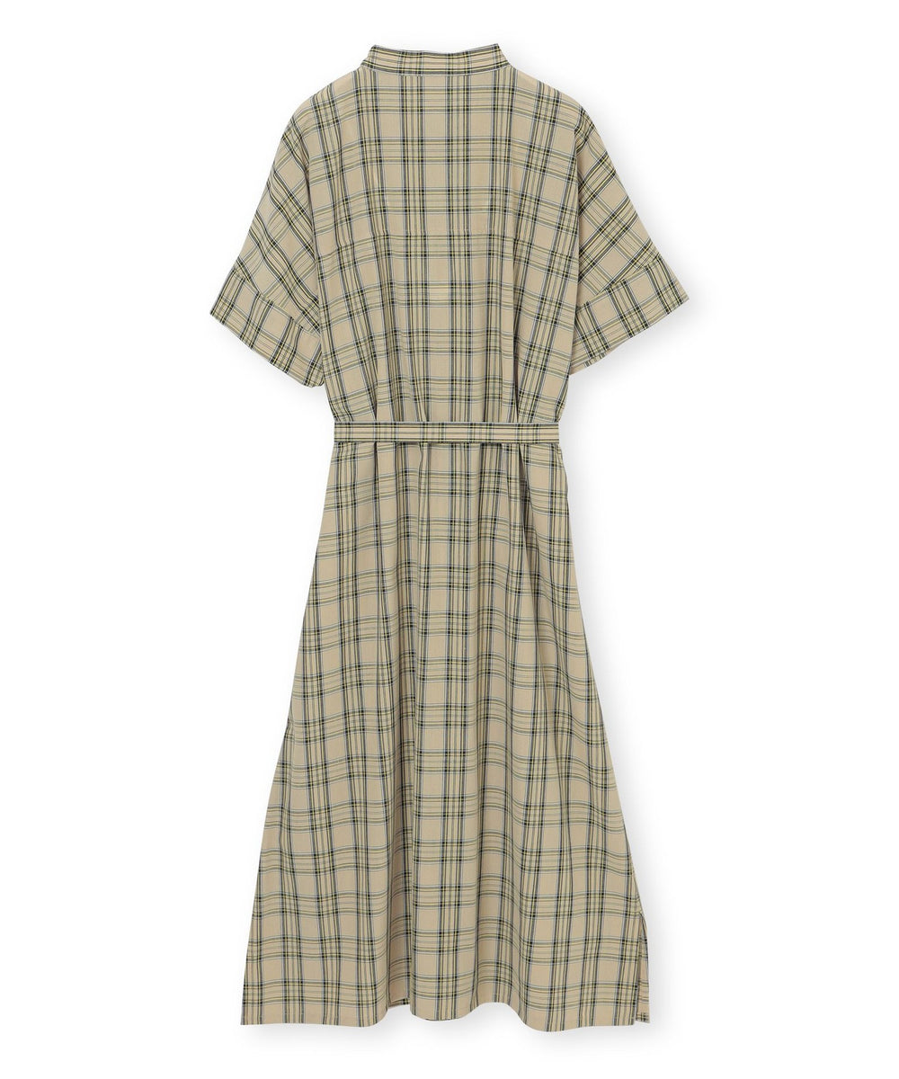 バンドカラーチェックワンピース。オリジナルチェック柄をリラックス感のあるドルマンスリーブのシャツワンピースデザインに落とし込みました。共地ベルト付き。