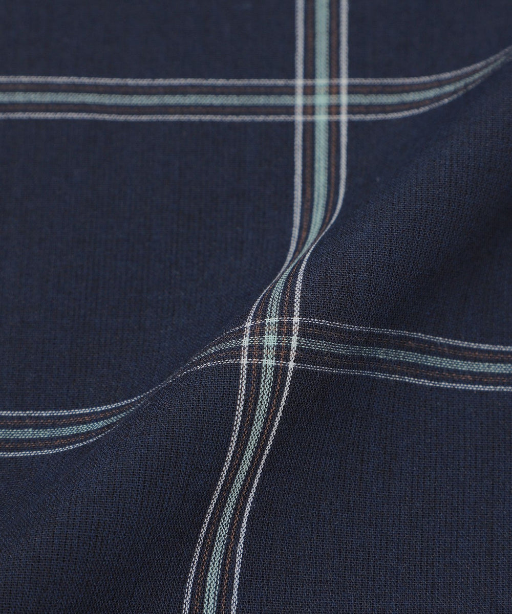 タテヨコ共にポリエステルをカバーリングし、強撚糸にする事によりドライな風合いにしたチェック。