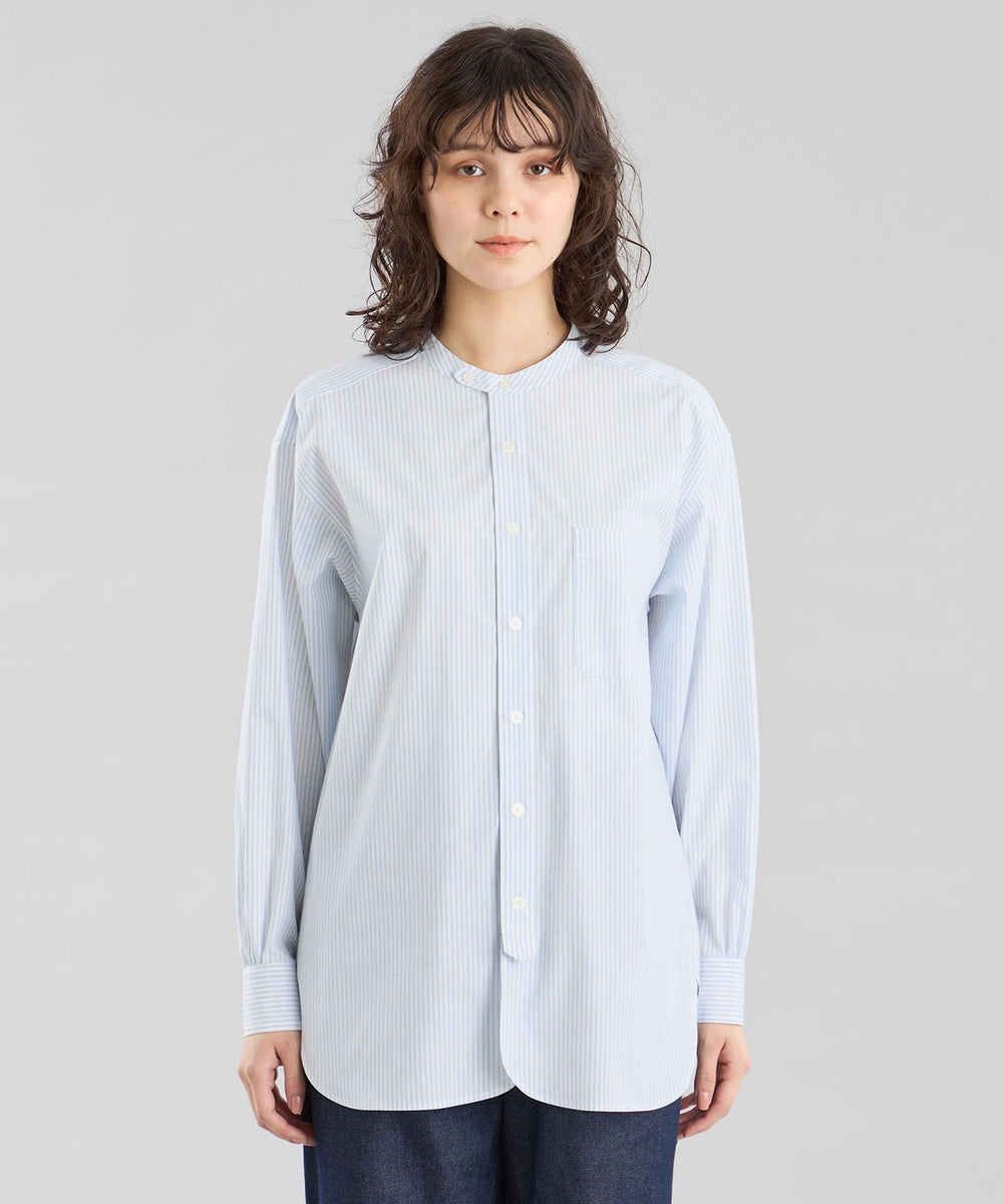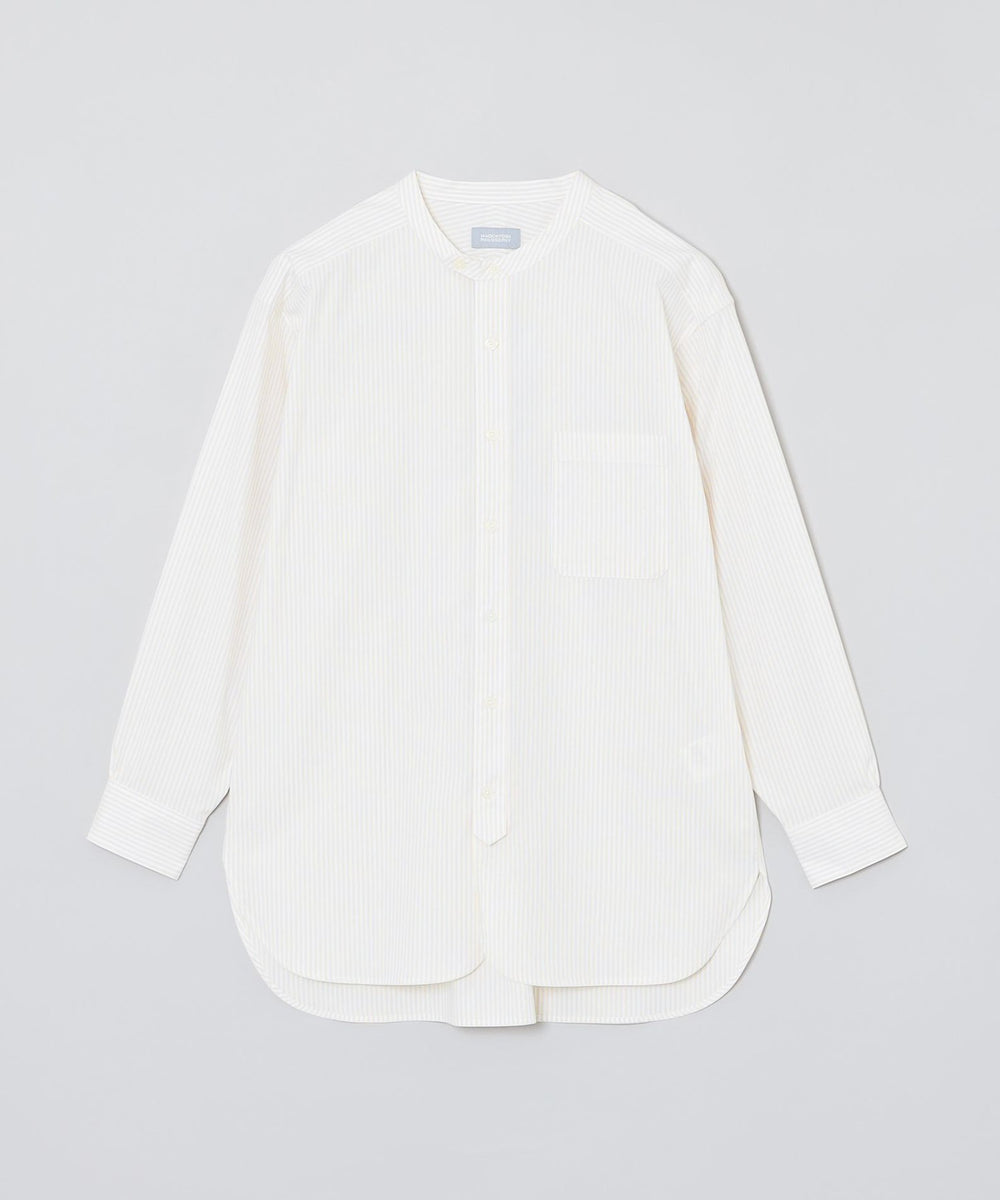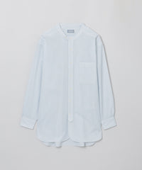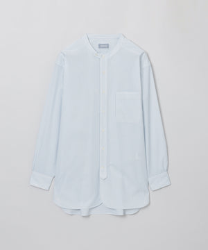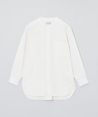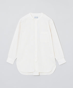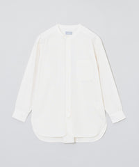 ミリタリードレスシャツをイメージしたオーバーシルエットのバンドカラーシャツ。長めのレングスと深くラウンドしたフロント&サイドのカッティングがクラシカルなデザインアクセント。衿の持ち出しと角落としの胸ポケットで少しミリタリーテイストを加えています。衿釦を2個留めると首元のアクセントに。