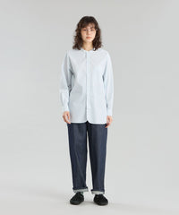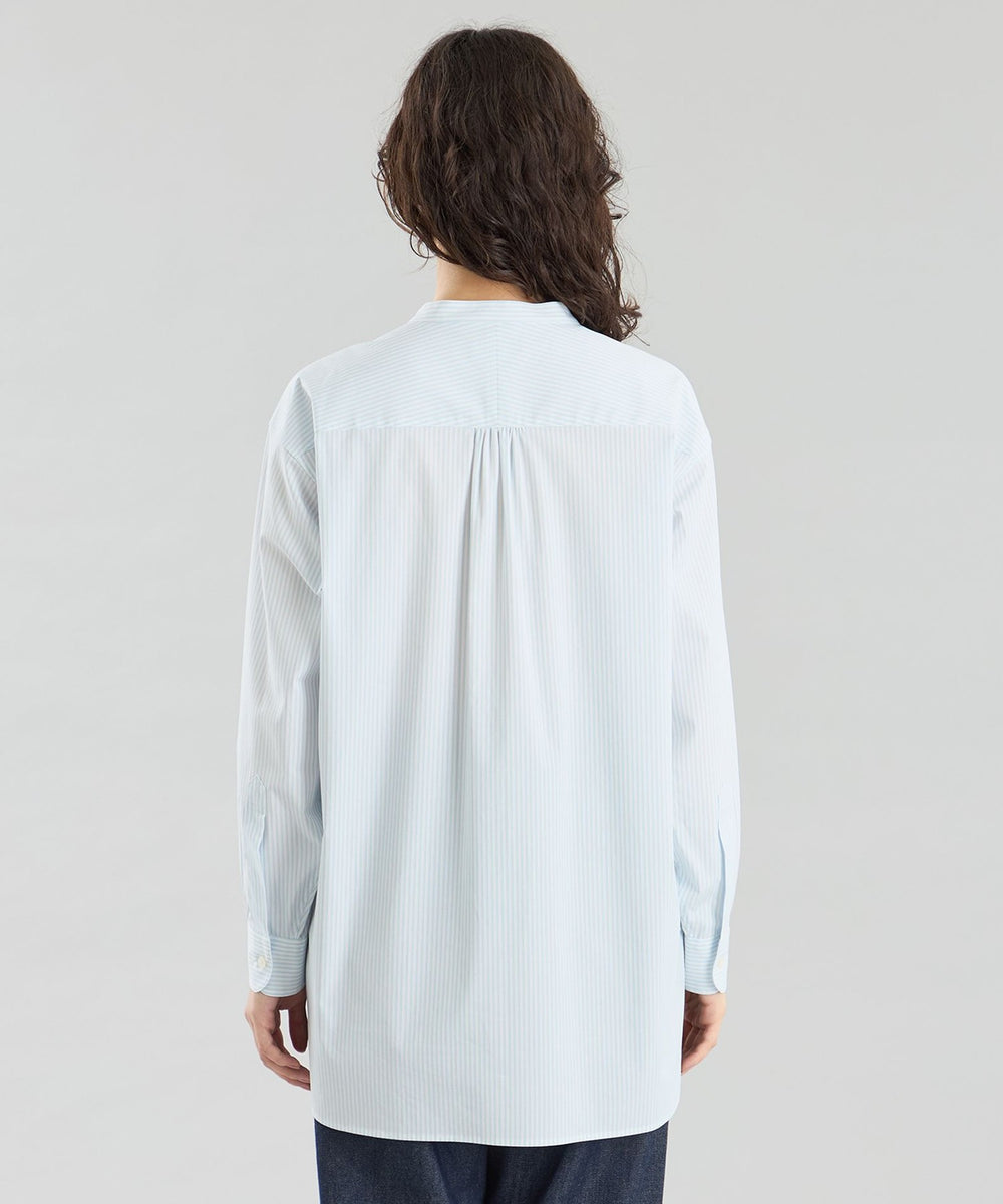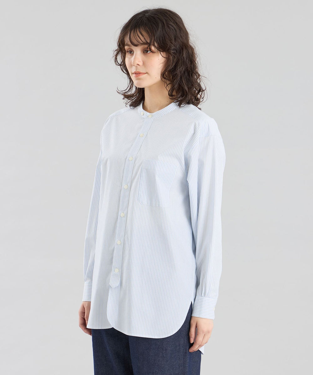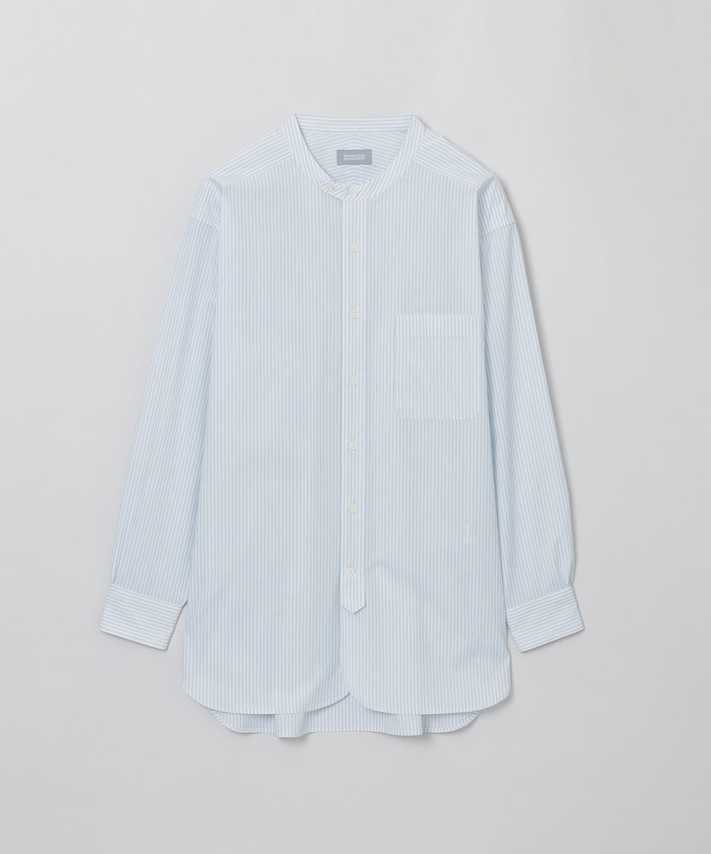 ミリタリードレスシャツをイメージしたオーバーシルエットのバンドカラーシャツ。長めのレングスと深くラウンドしたフロント&サイドのカッティングがクラシカルなデザインアクセント。衿の持ち出しと角落としの胸ポケットで少しミリタリーテイストを加えています。衿釦を2個留めると首元のアクセントに。