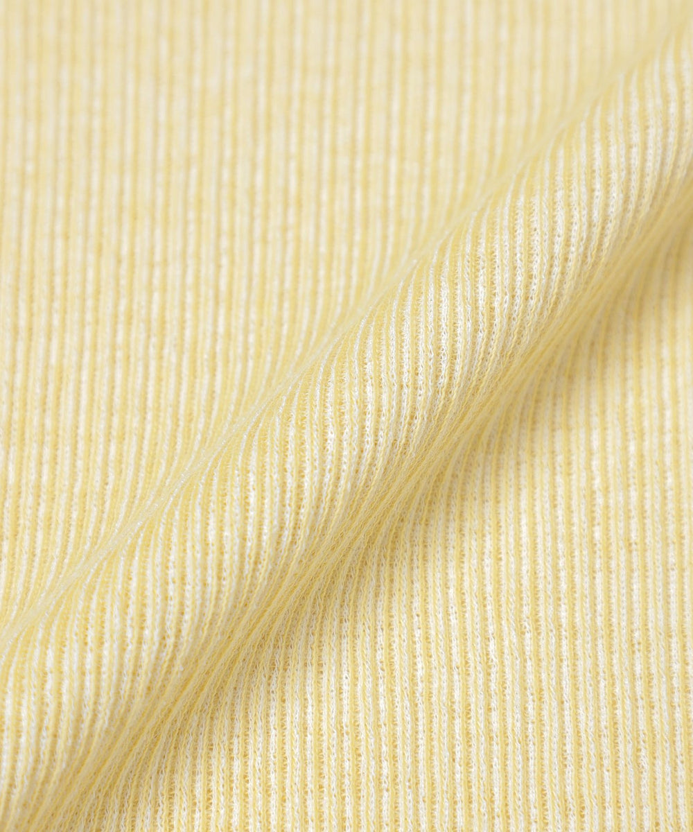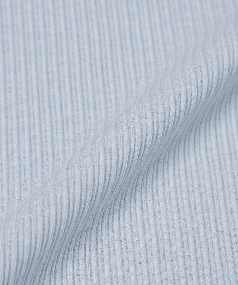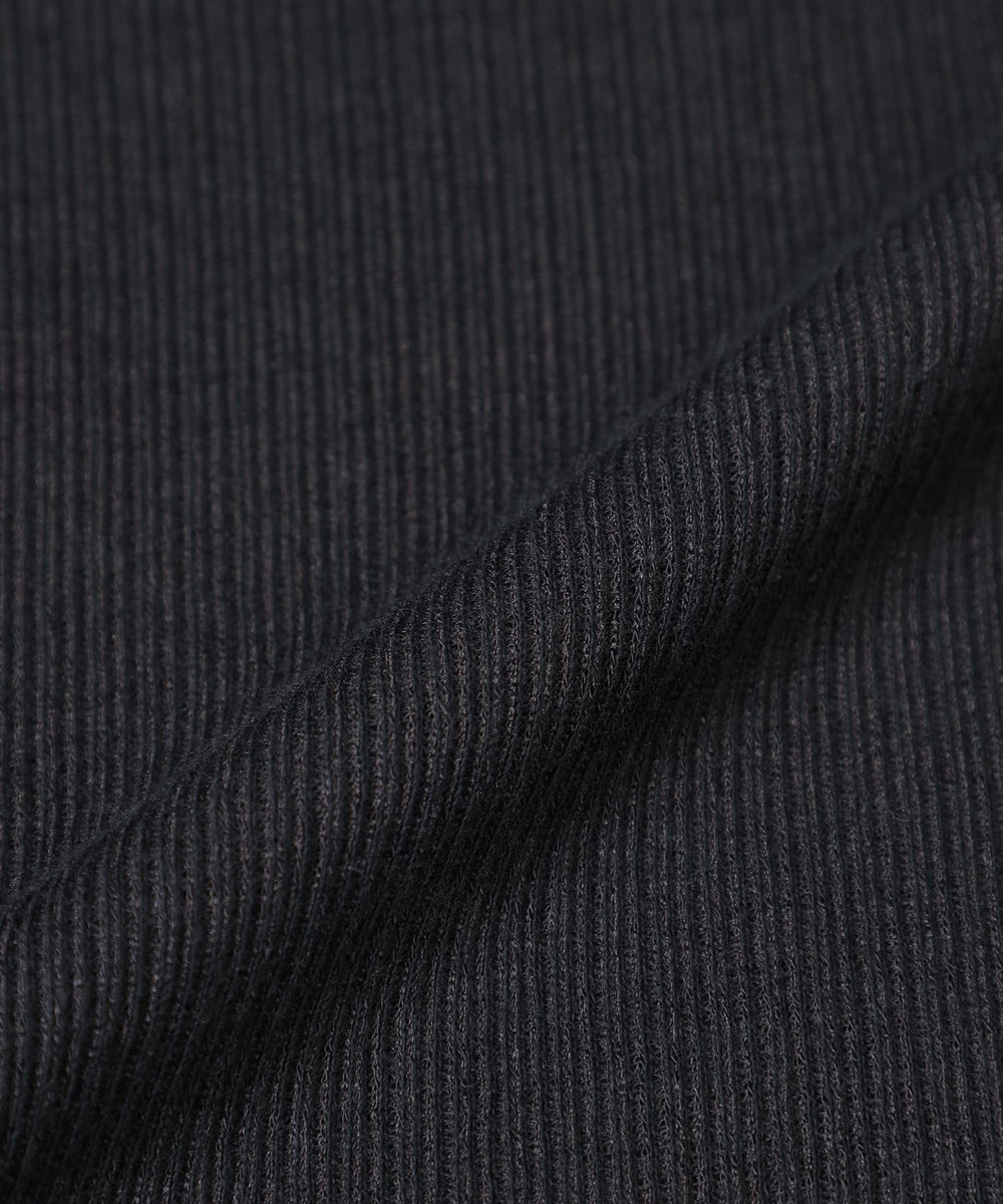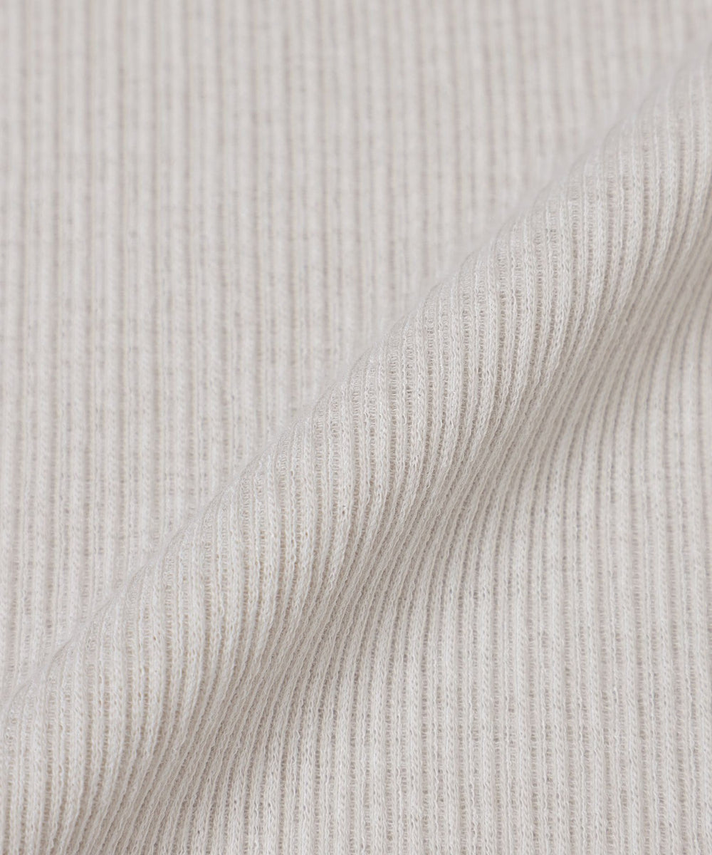 スパン調の特殊なポリエステルと綿交織したリブ素材です。糸の形状を活かしたシボ感のあるナチュラルな表情が特徴です。