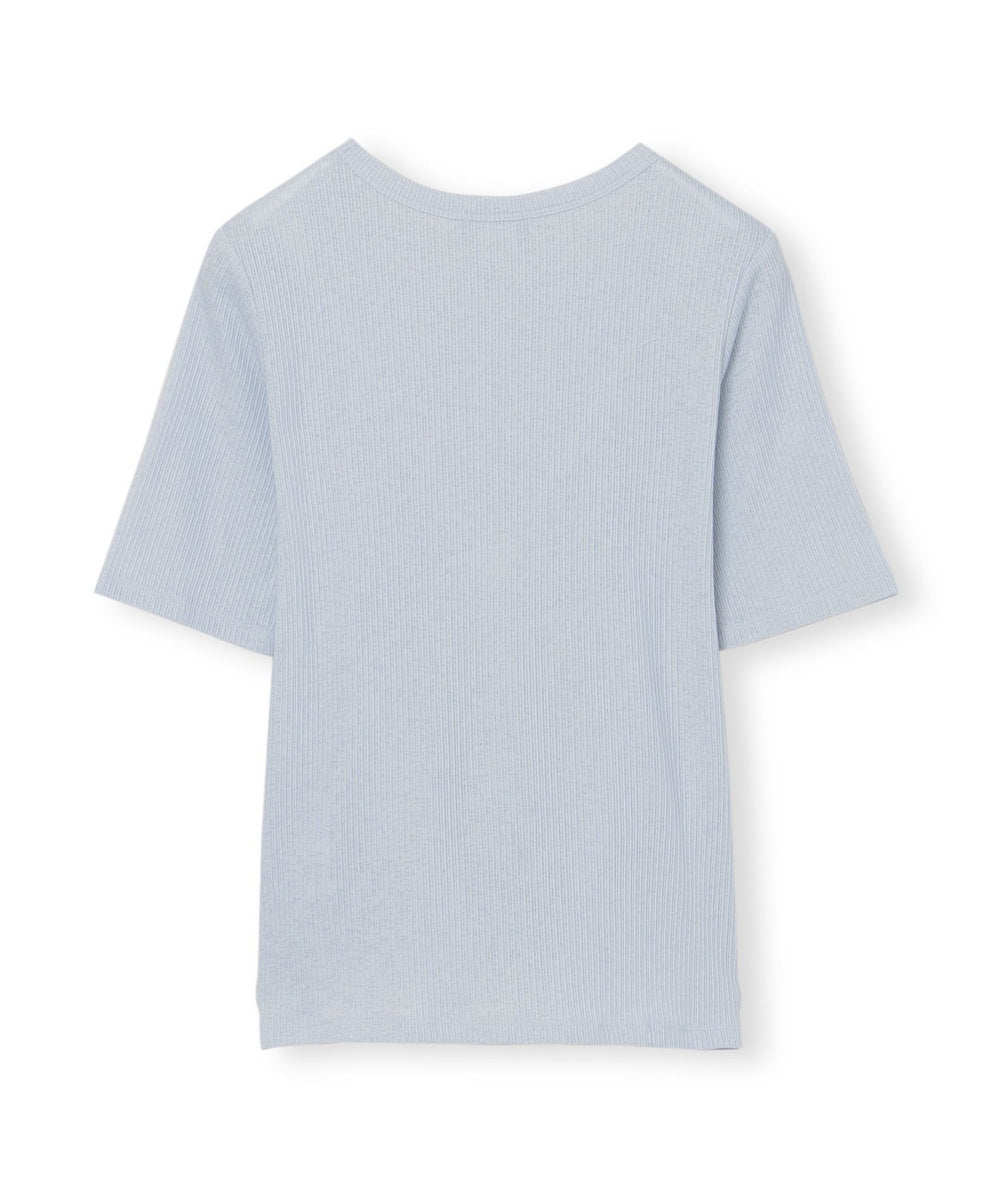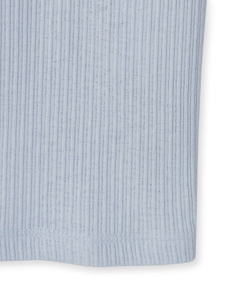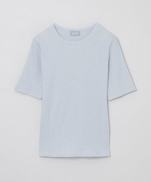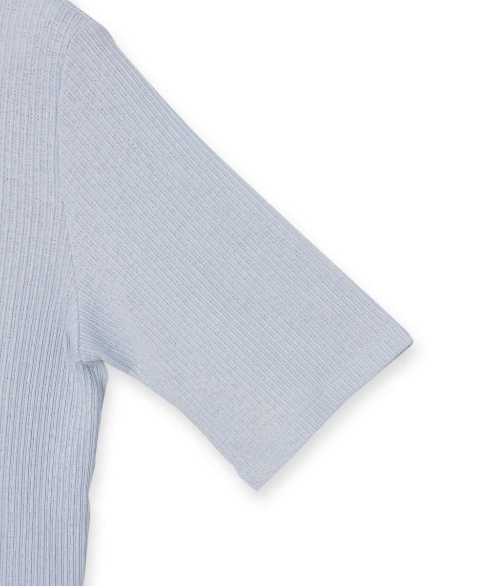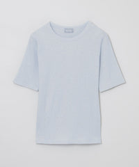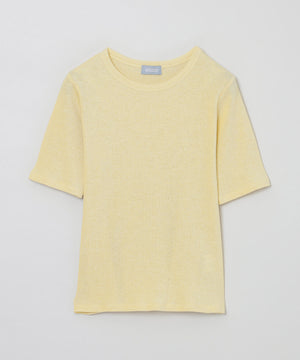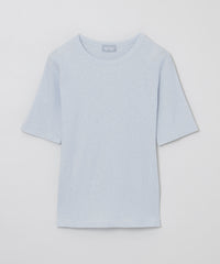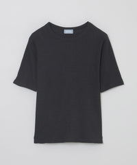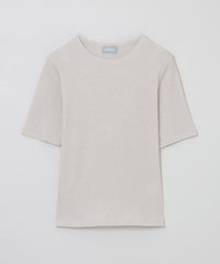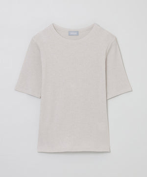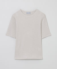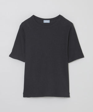 スパン調の特殊なポリエステルと綿交織したリブ素材です。糸の形状を活かしたシボ感のあるナチュラルな表情が特徴です。