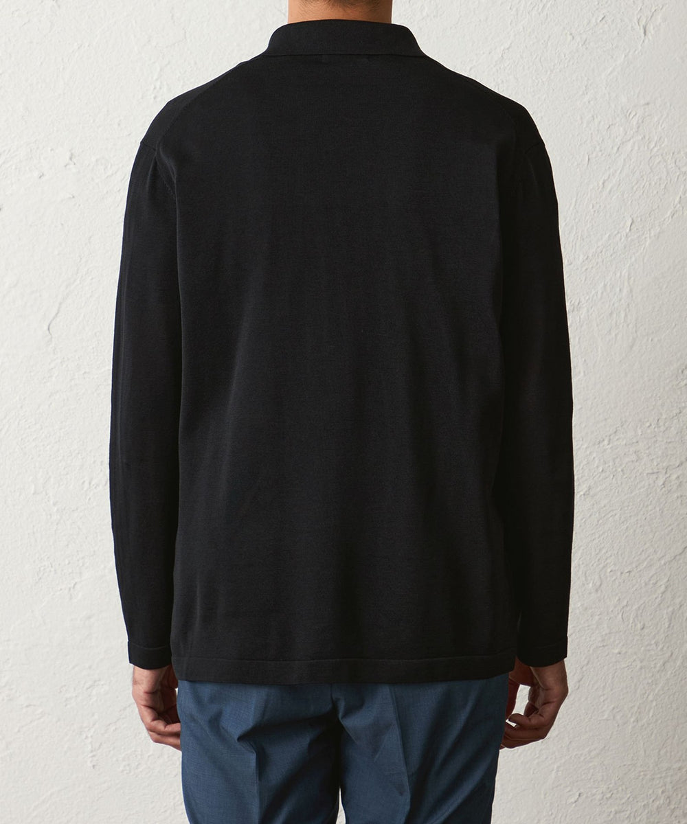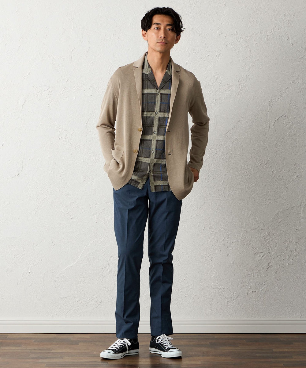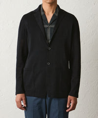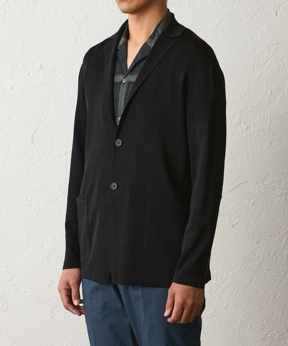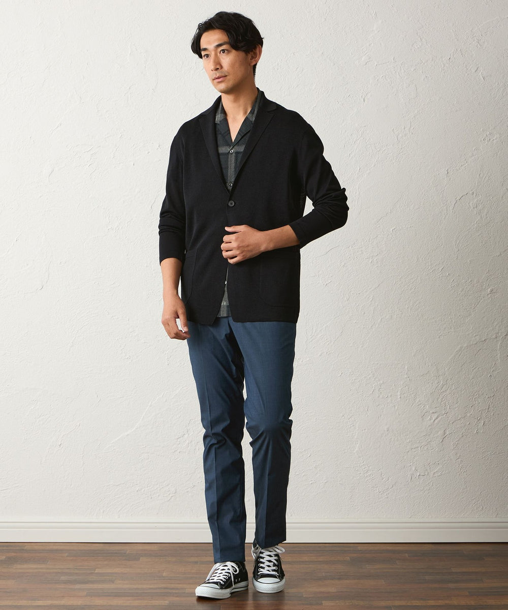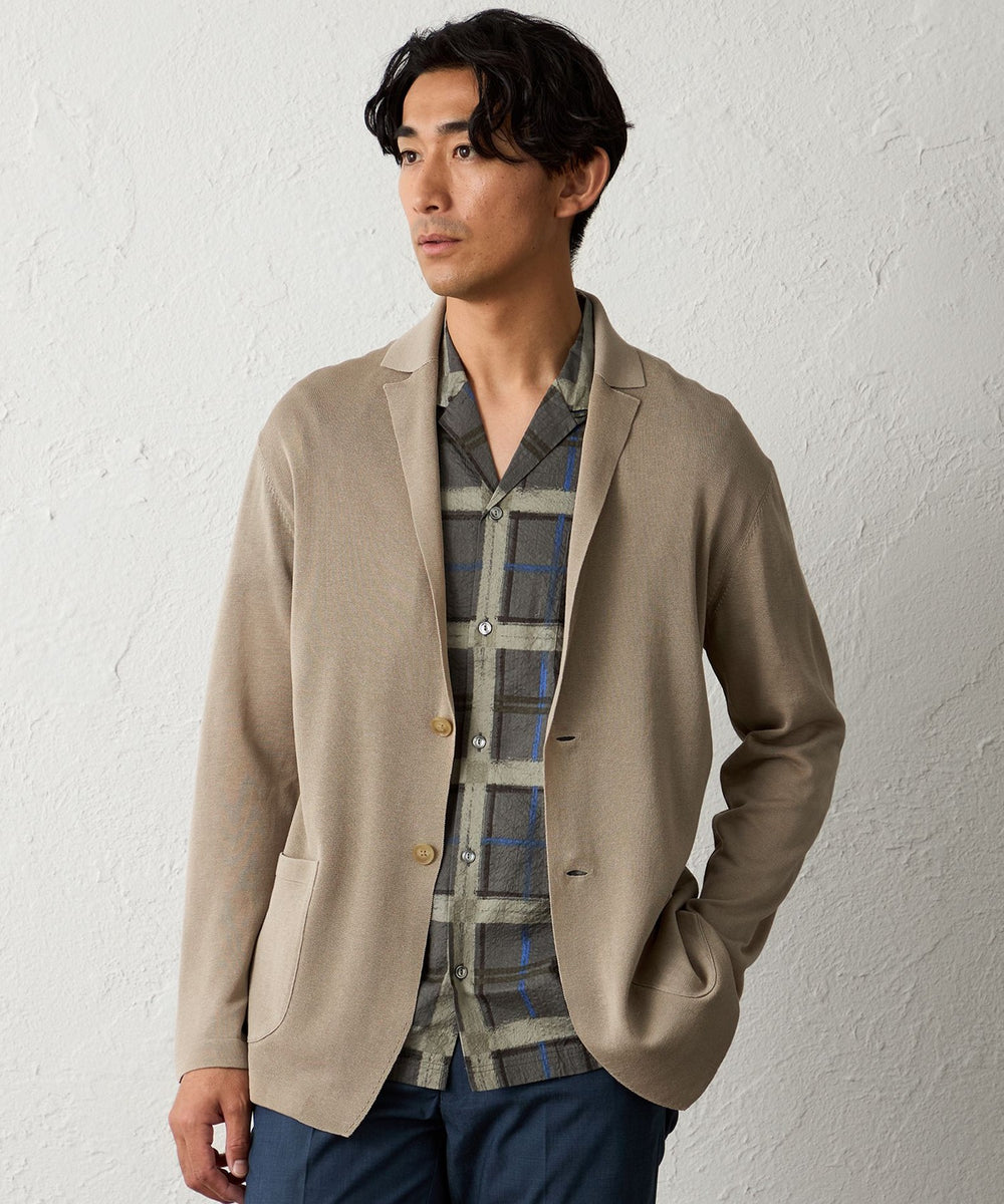 後ろ身頃や袖は天竺編みにする事で、カーディガン感覚で着用して頂けるニットジャケットになります。