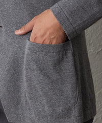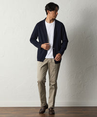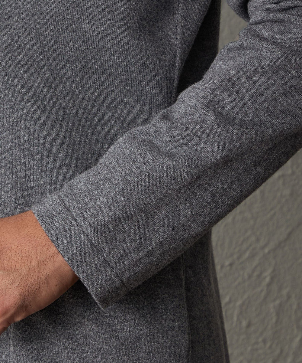 前身頃にはしっかりとした総針編みを採用し、ラペルのきれいなシルエットを際立たせました。