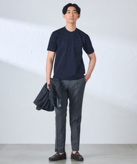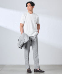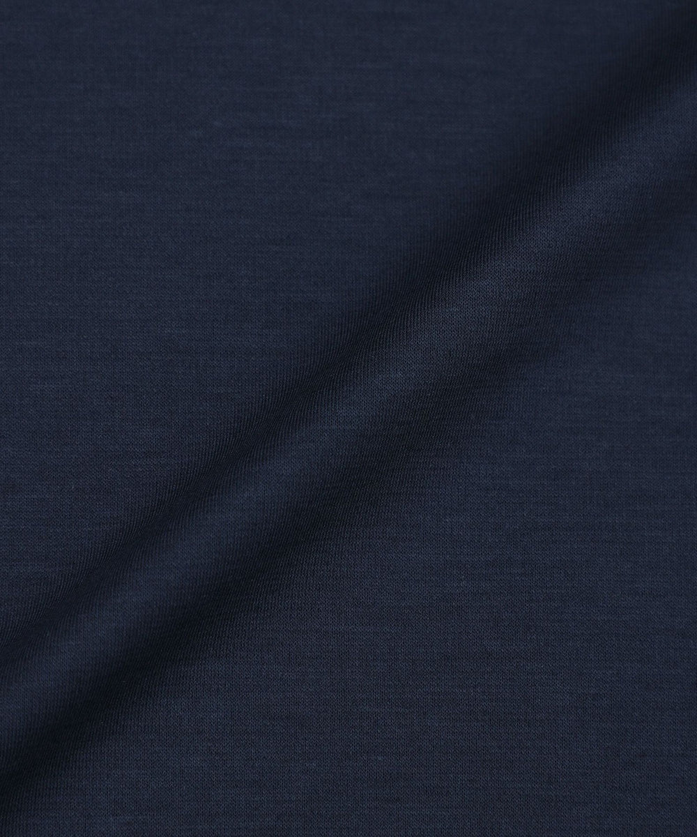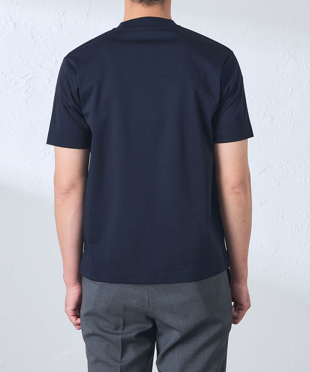 通常のTシャツより後衿を高めに設定し、ジャケット着用時にジャケット後衿とTシャツの後衿が重なるように設計しています。そのため、ジャケットの衿周りの汚れがつきにくい仕様になっています。
