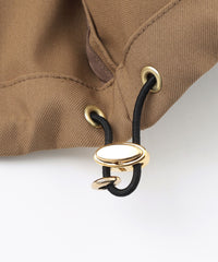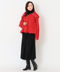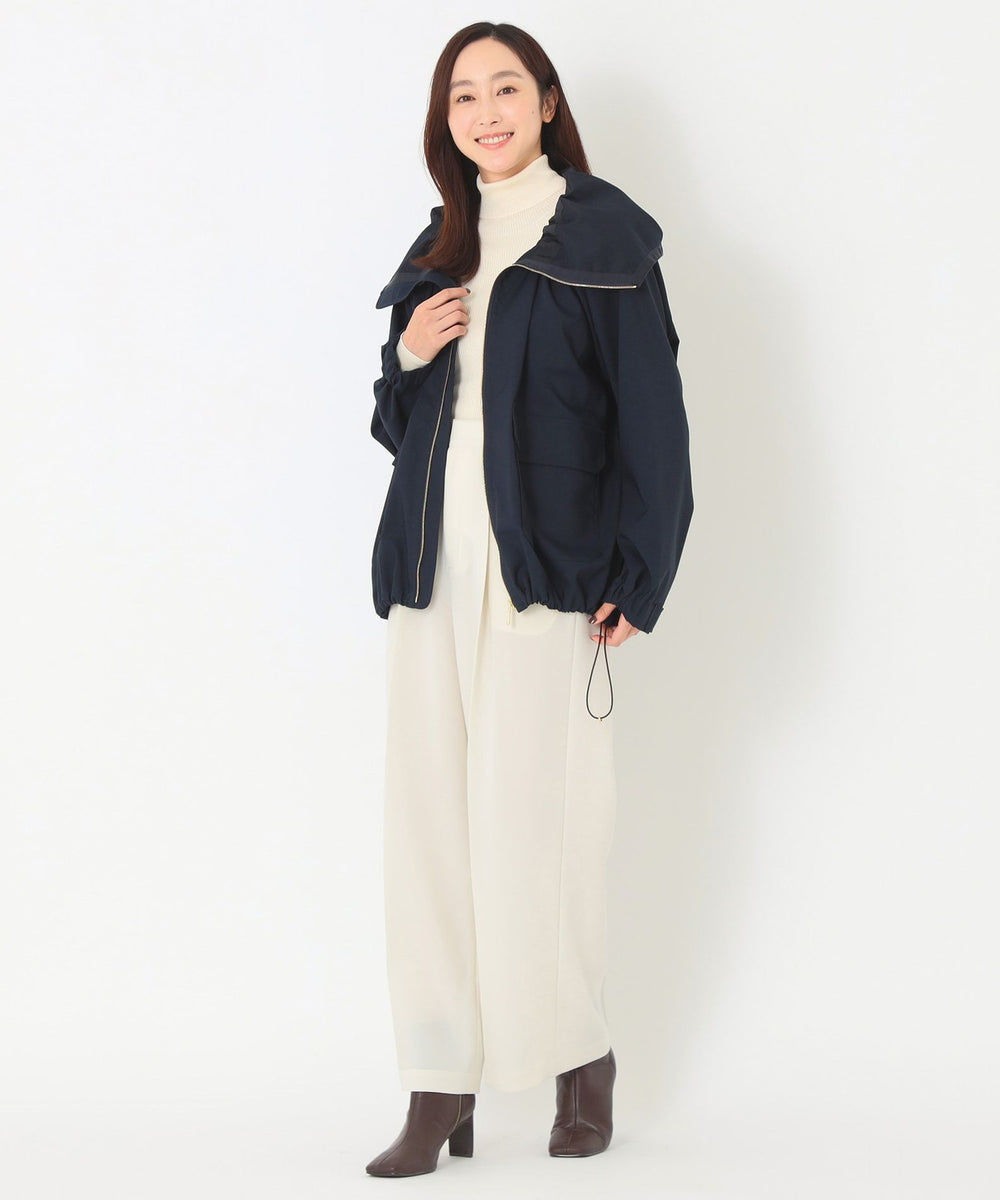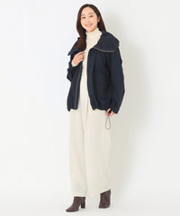 衿ぐりと裾にストレッチコードを通し、ストッパーでギャザー分量を調整することで、フードとしても、ペタルのような衿としても変化のある着こなしができます。
