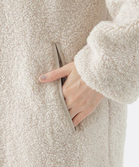 ボリューム感のあるシルエットで、さらっと羽織るだけでサマ見えするトレンド感のあるアウターに仕上がっています。スタンドカラーなので、分量はありながらもすっきりとした印象の大人のカジュアルアウターになっています。表面はボア素材、裏面はタフタ素材のリバーシブル仕様にしていますので、着こなしを変えていただけるのもうれしいポイントです。前立て、ポケットのエッジ部分にはグログランテープを施し、さりげないディテールをプラスしています。
