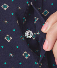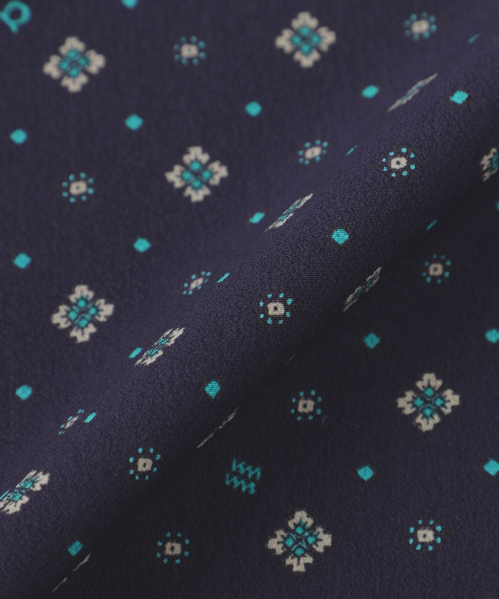 クラシカルな小紋柄の中に12星座モチーフをさり気なく配置しています。上品さのなかに遊び心を感じるプリントです。しなやかで落ち感があり、ほど良い厚みのあるデシンを使用しています。ポリエステル素材なのでシワになりにくく、日常から特別なシーンまで幅広く活躍する素材です。