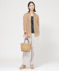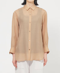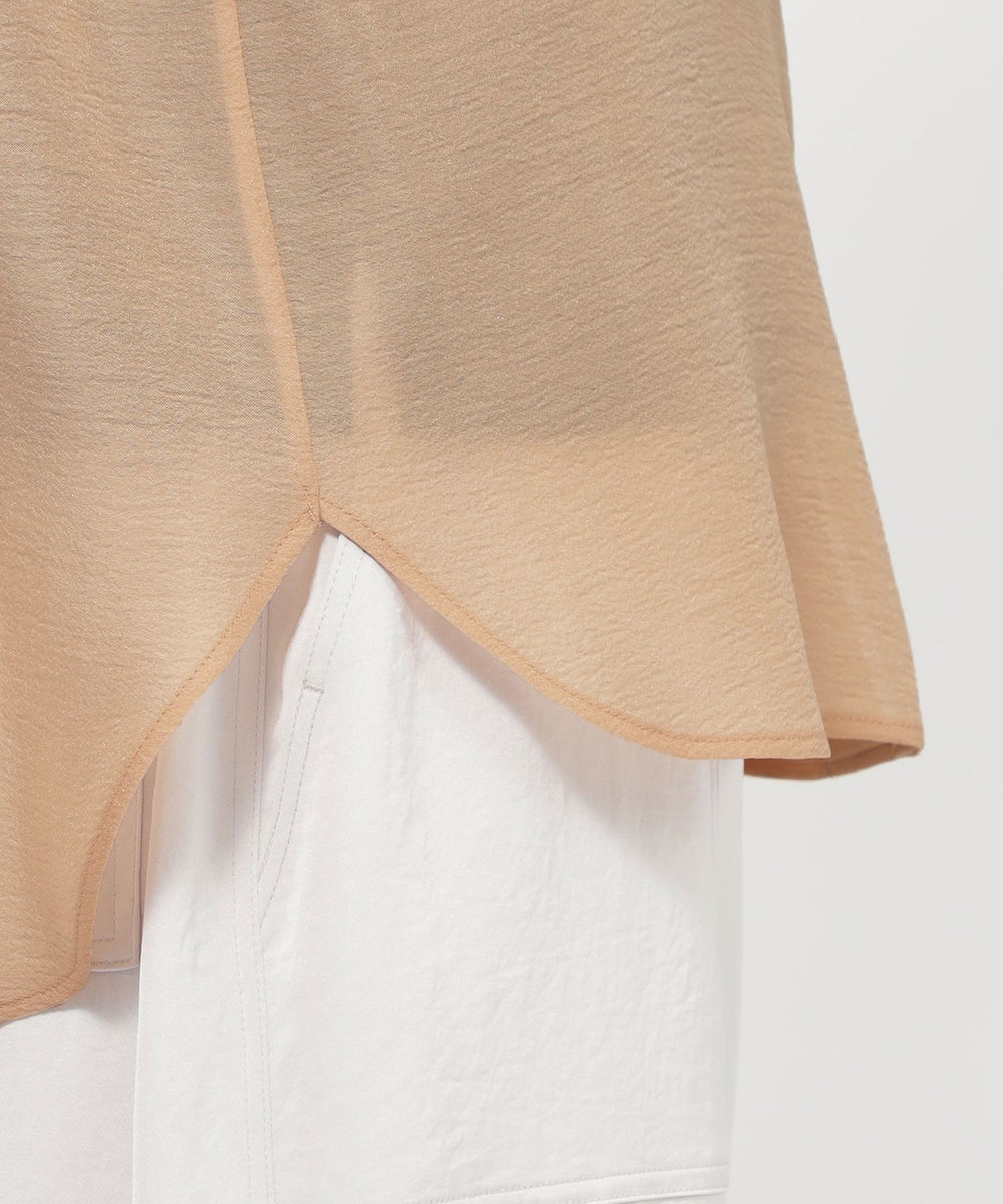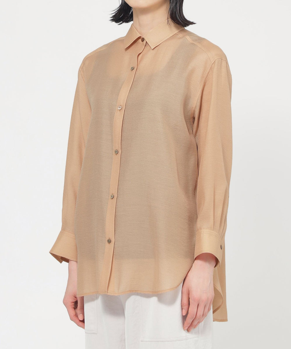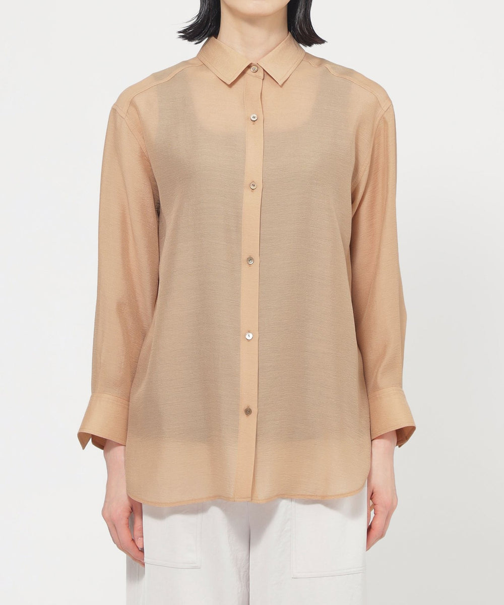 発色が良く、透けすぎず上品なシアーサテンです。適度なハリと落ち感がありエアリーな風合いが特徴です。糸をクリンプ状に加工してから使用することで、タンブラー加工を施したようなリラックスした表情になっています。