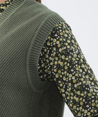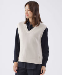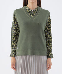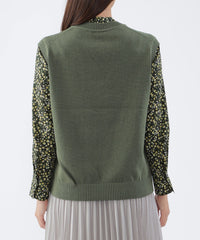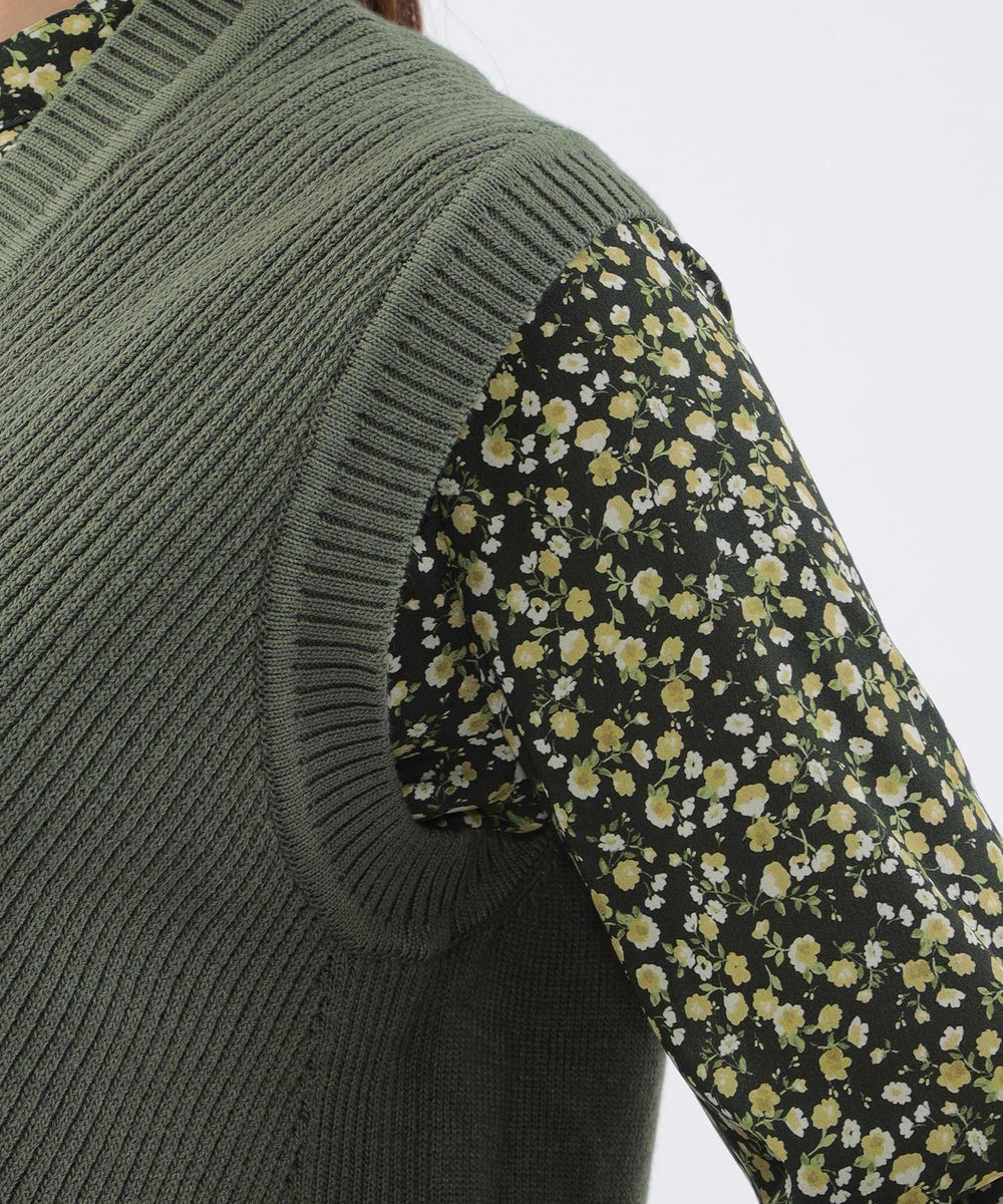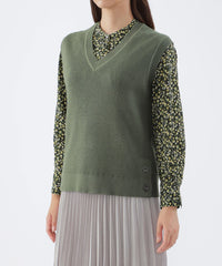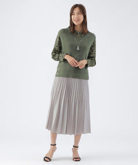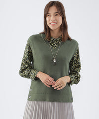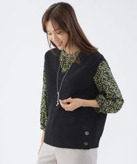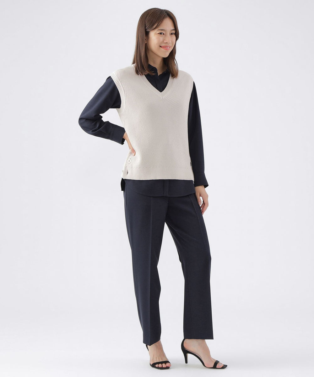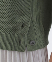 前身頃はリブのように見える編地をバイヤスに配置し脇はリブで切り替えていますので、一枚の存在感もしっかりあり、縦長効果でシャープ見えも狙えるニットです。後ろ身頃はプレーンな天竺編みにしていますので、重ね着したときに肉厚にならずにすっきりと着こなしいただけます。両裾はボタン開き仕様ですので、1枚でサクッと着ても着映え良く、ボタンを外してスリットを開けてフレア感のあるシルエットにしても分量感のあるボトムスと決まりがよく、コーディネートの表情を変えられるのもポイントです。