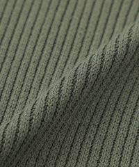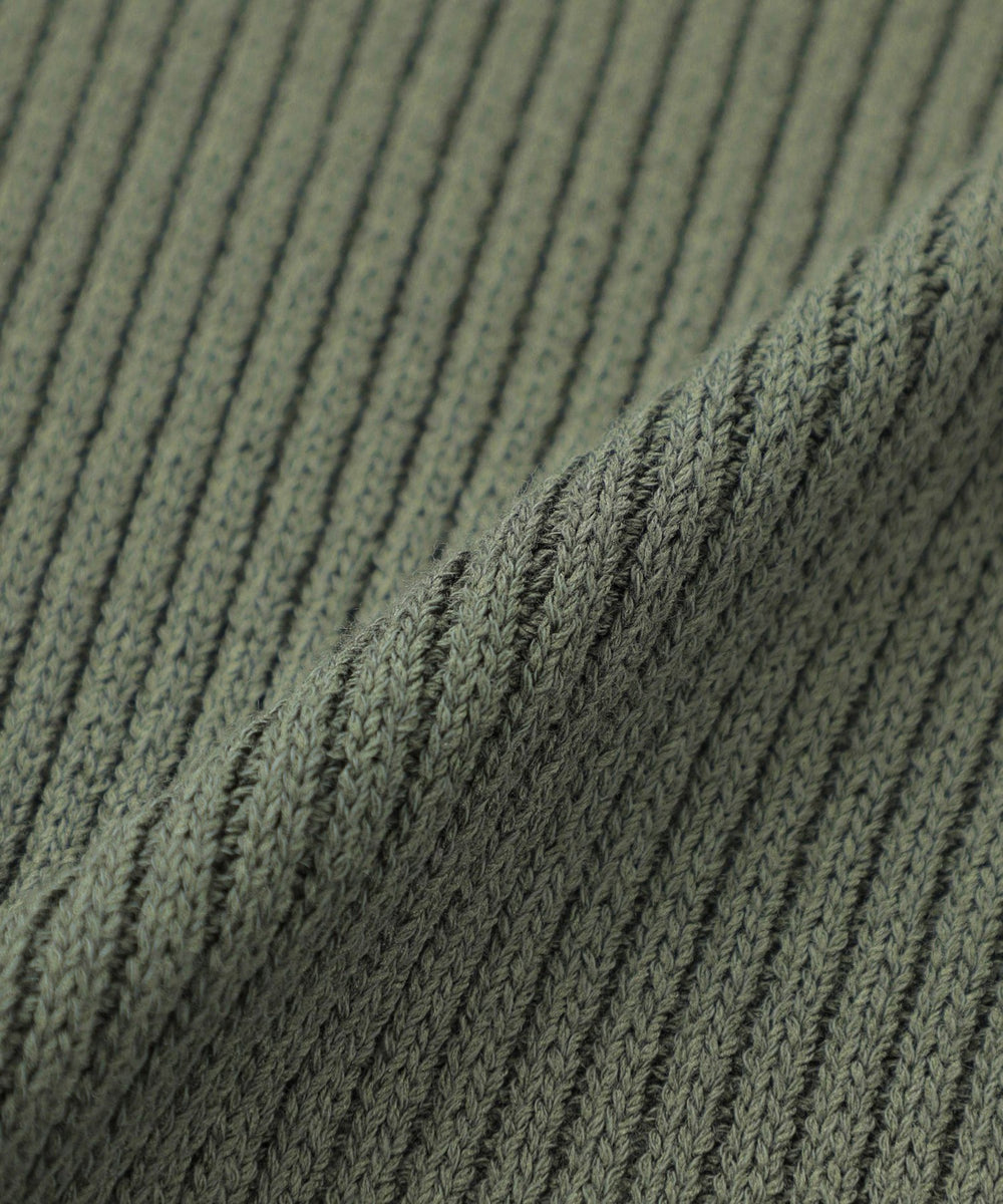 コットンとふくらみのあるポリエステルの加工糸を撚糸し、さらに撚り合わせた糸を使用しています。軽量感と柔らかさがありながらふくらみがあり、ストレッチ性もありますので、編地の立体感と着心地を兼ね備えたニットとなっています。