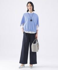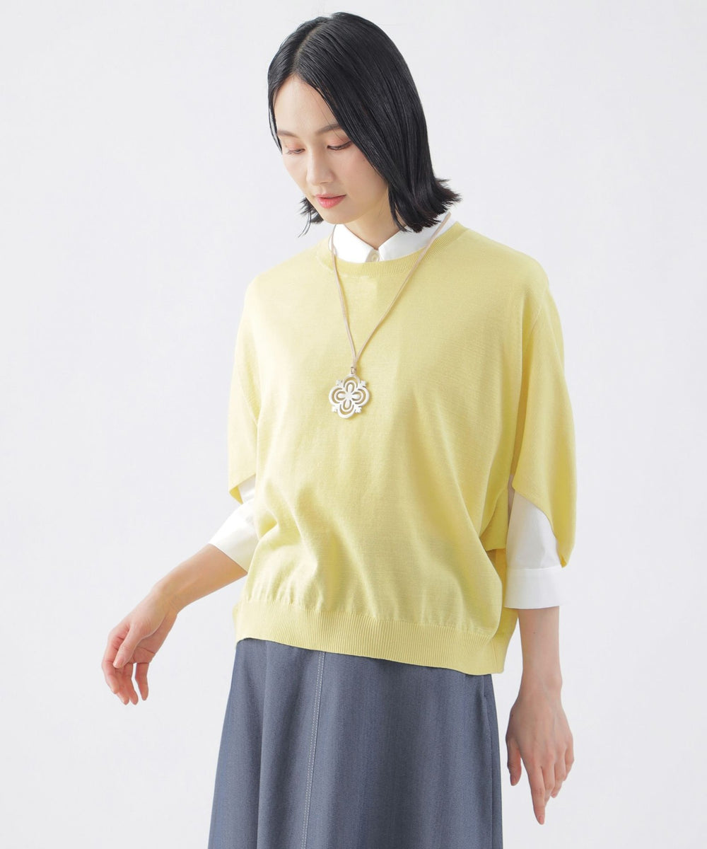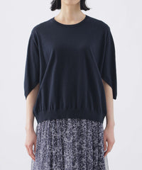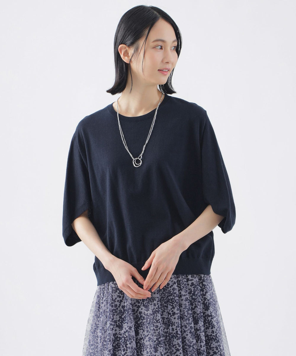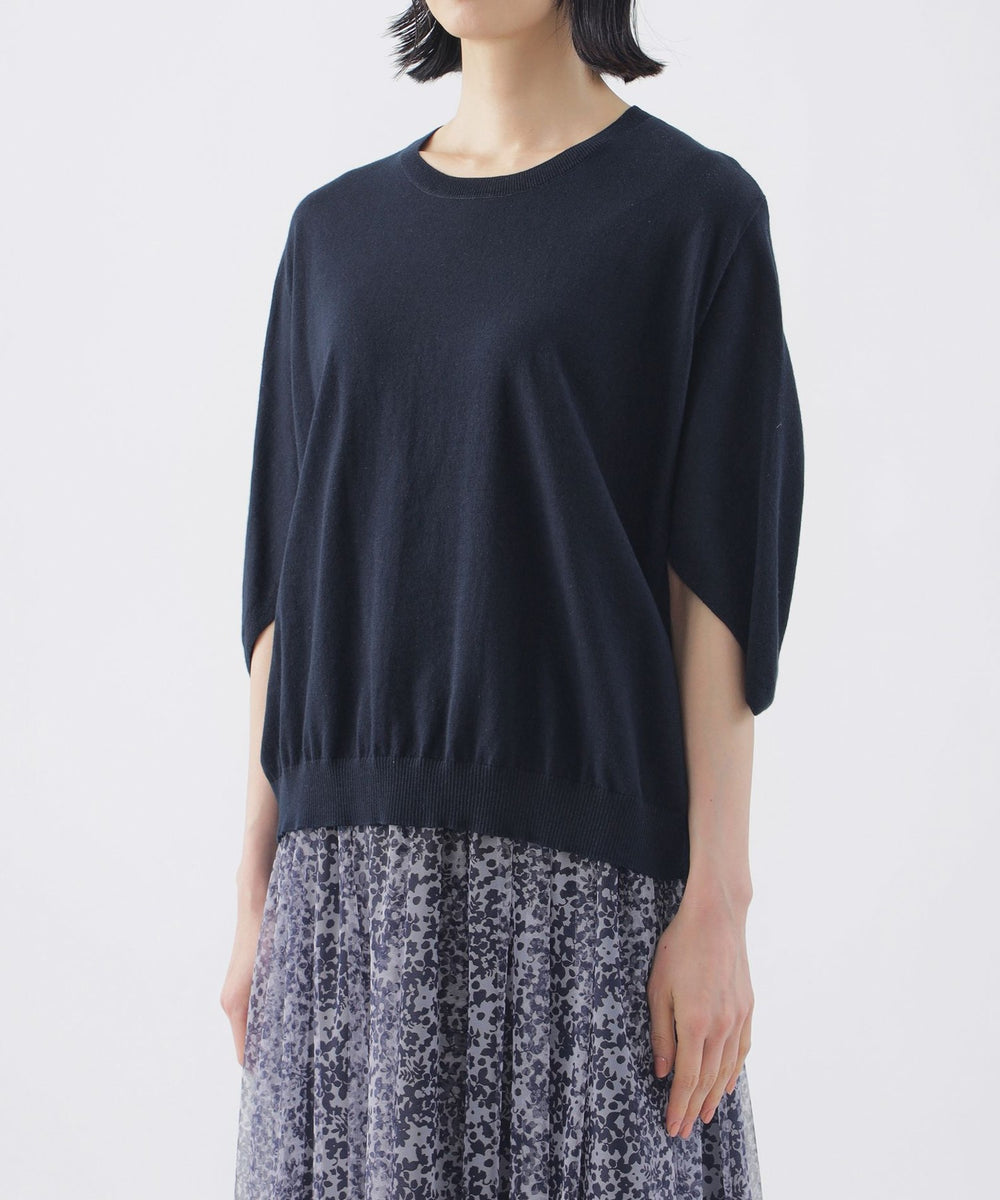 ラフな着心地とゆるさが可愛いニュアンスのある袖デザインがポイントで、抜け感のあるシルエットは大人のカジュアルスタイルにおすすめです。合わせるボトムもスカート、パンツどちらにも良く合い、着回し力抜群のトップス。中にシャツを重ねたレイヤードスタイルや、夏には1枚着としても汎用性の高さもポイントです。