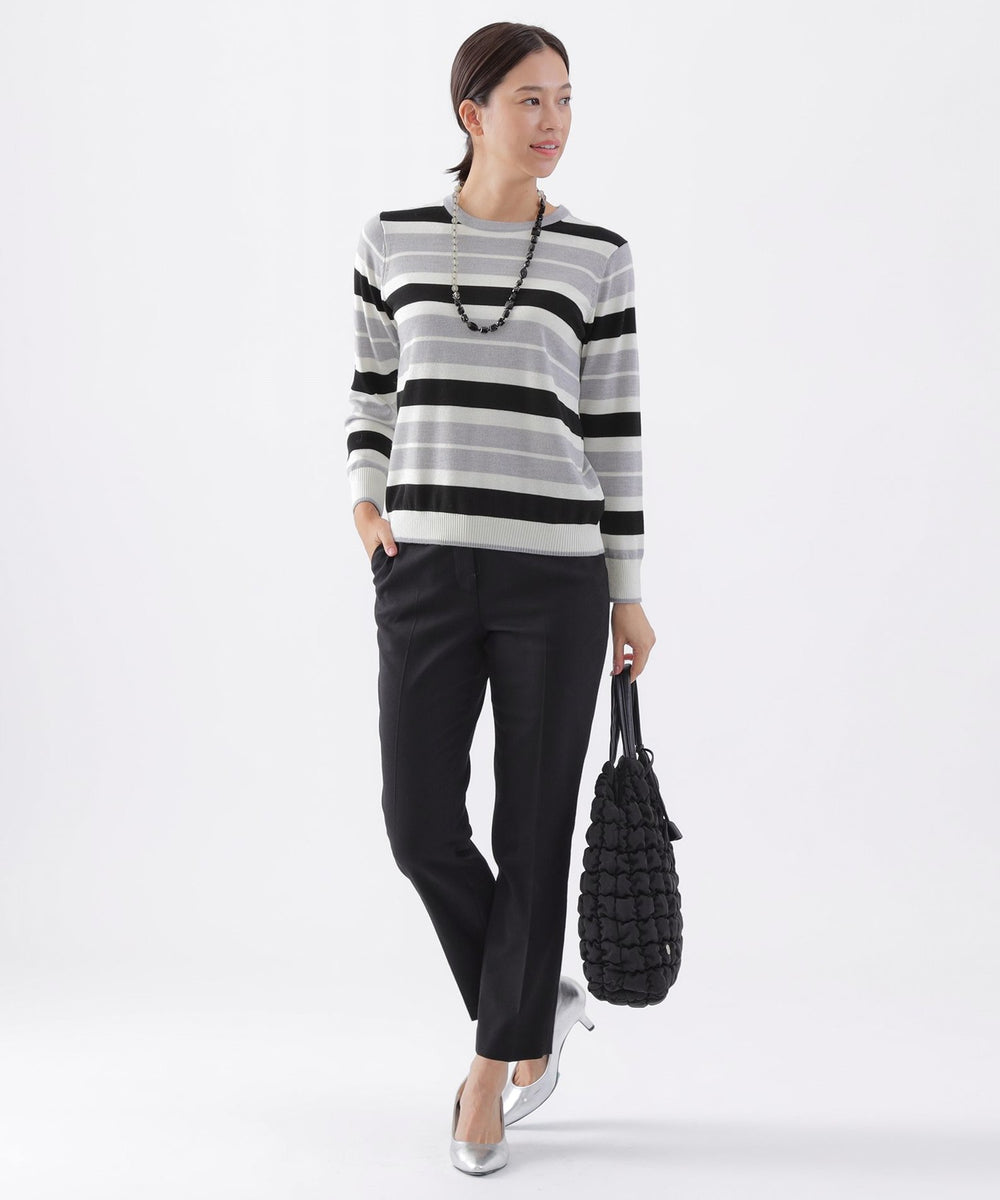 ベーシックなカラー配色のボーダーにラメを部分的に編み込んで、華やかな表情に仕上げました。コートのインナーとしてコーディネートのアクセントになるアイテムです。