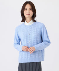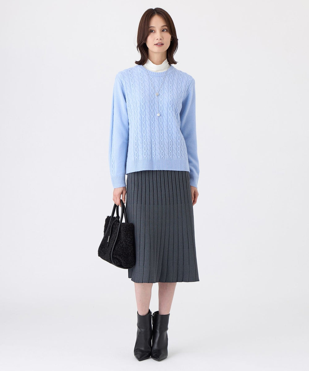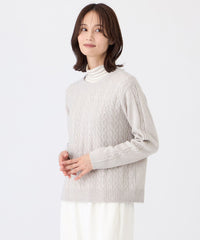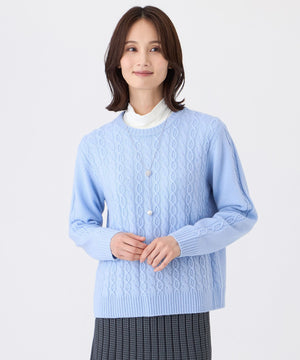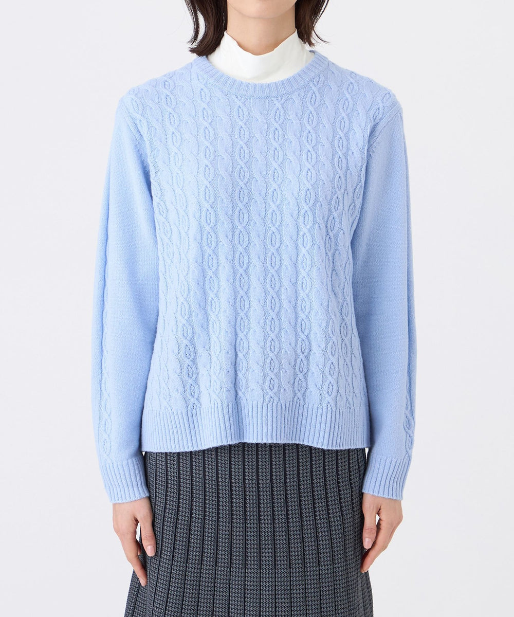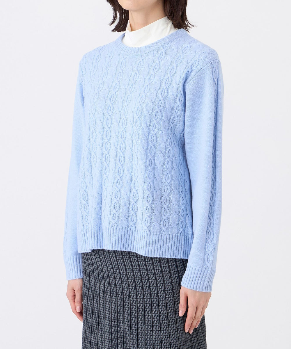 立体感のあるケーブル編が特徴的で、ベーシックで着回ししやすいクルーネックのニットプルオーバーです。