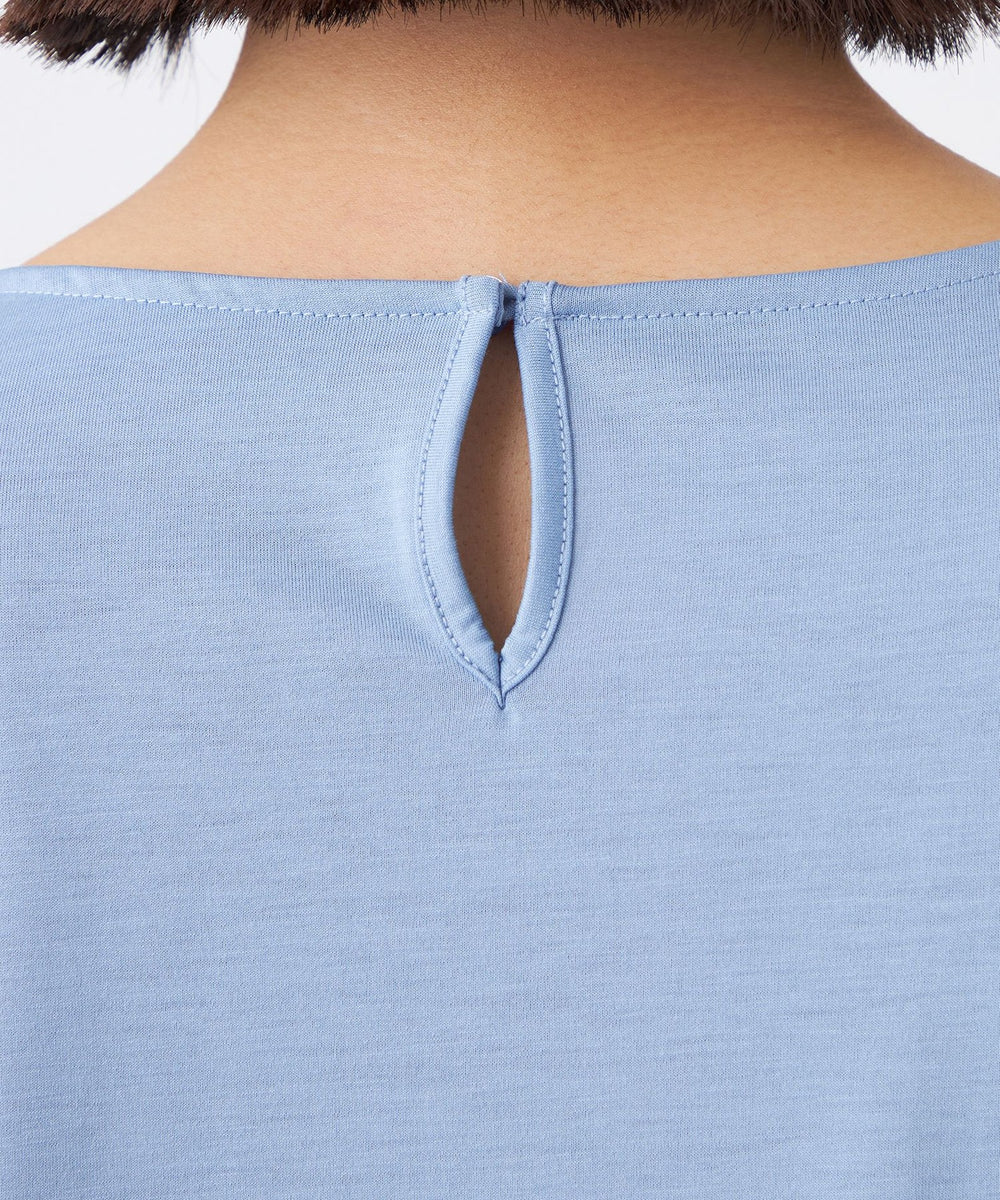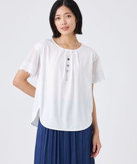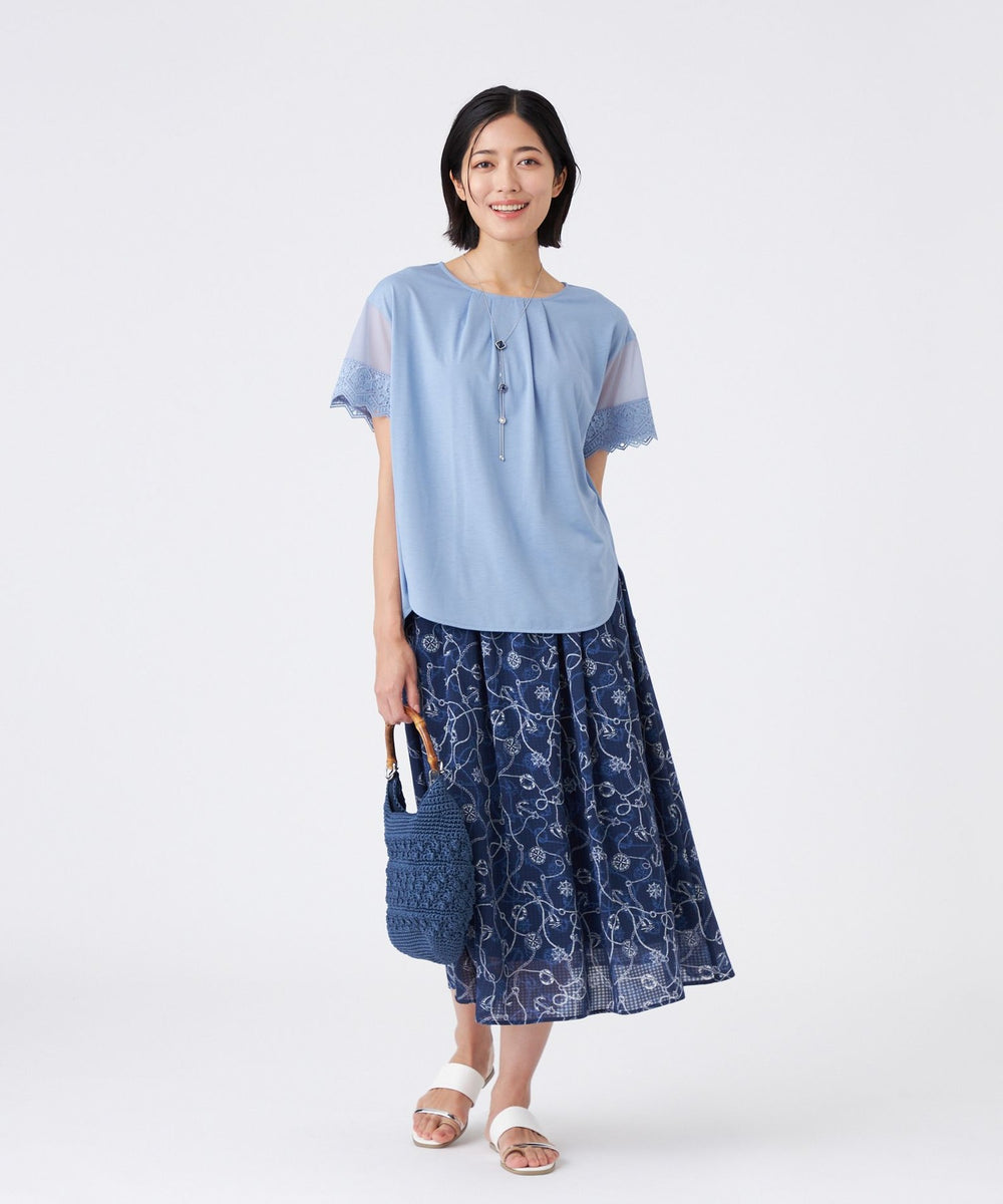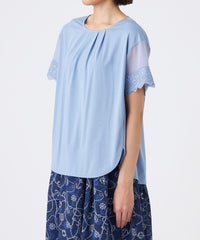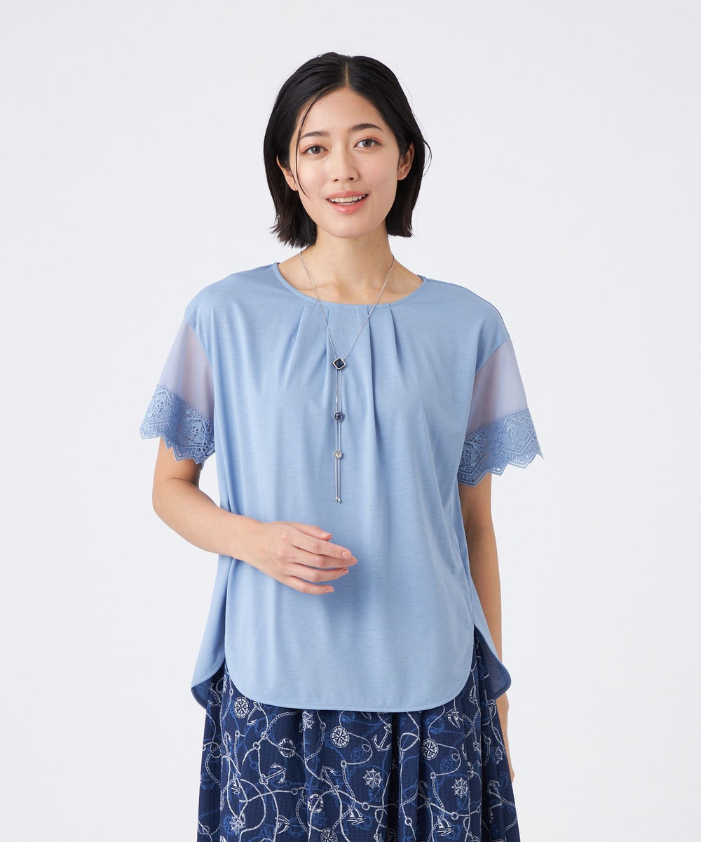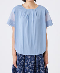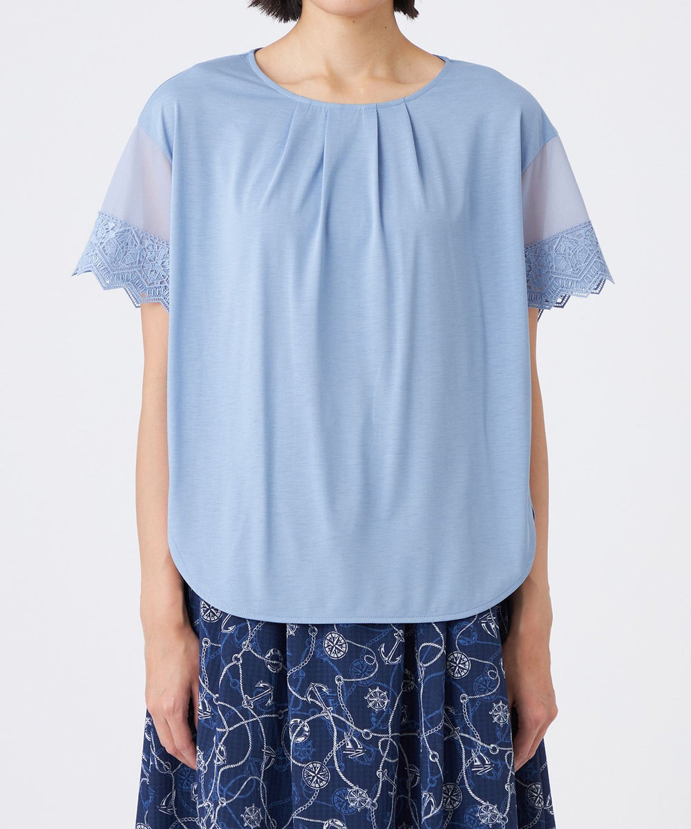 トレンド感のあるシアースリーブが特徴です。袖の透け感とオリジナルレースがアクセントです。襟ぐりのタックによる立体的なシルエットと前後差のある裾デザインで、一枚で華やかに着映えします。