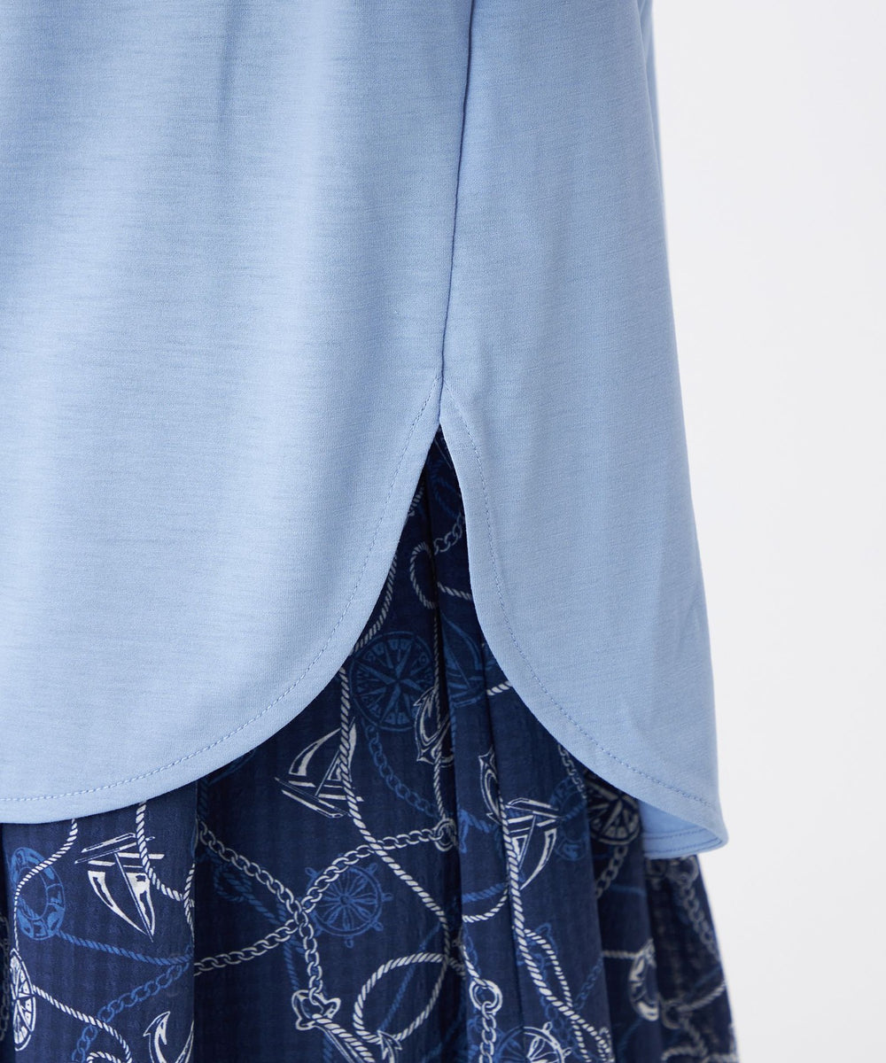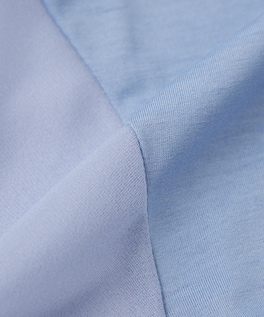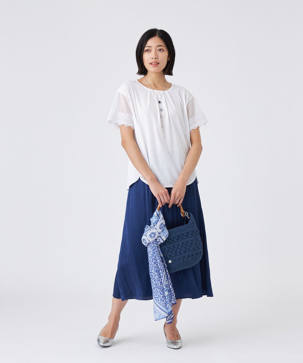 カットソー部分は、特殊な紡績により毛羽を抑えた、さらりと爽やかな肌触りの天竺素材です。ハイゲージ編み機によるコンパクトで上品な光沢が魅力の素材です。レースに関しましては、オリジナルのケミカルレースを使用しています。テープ状で幾何フラワー柄の立体感あるデザインが特徴です。