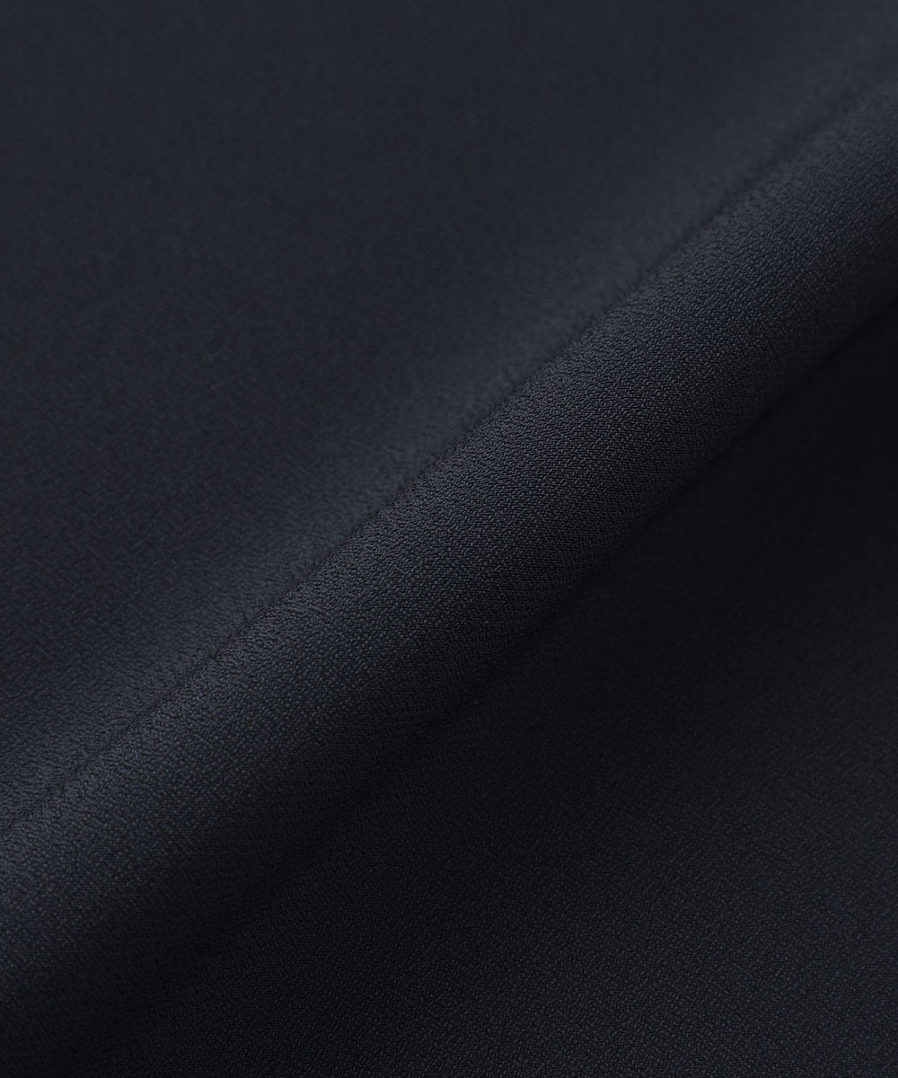 後ろのポケットの玉縁布を表地の裏側のサテン面にしてアクセントにしています。フォーマルでエレガントな印象です。表のジョーゼット面を非常に細かい組織にして、さらにトリアセテートの上品な光沢感をプラスし、高級感のある素材に仕上げています。緯糸に反発感のあるポリエステルを使用して、程よい膨らみ感があり仕立て映えします。